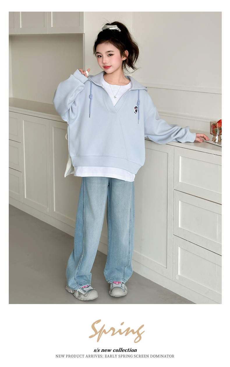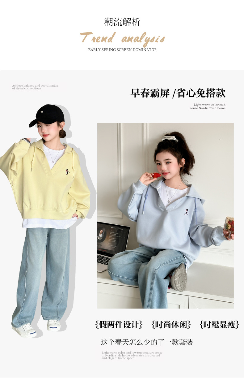 소녀의 봄과 가을 스웨트 셔츠 세트 2025 새로운 서양식 큰 어린이 봄 한국 최고의 어린이 청바지 투피스 세트