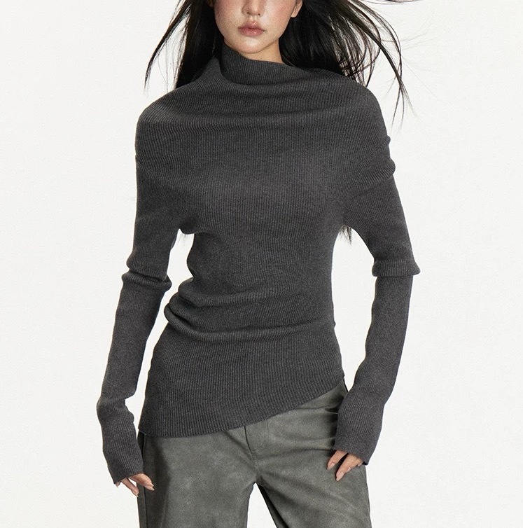 안나 네아 다크 그레이 긴팔 스웨터 여성 봄 슬림 핏 디자인 오프 숄더베이스 터틀넥 스웨터