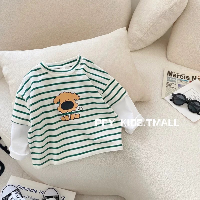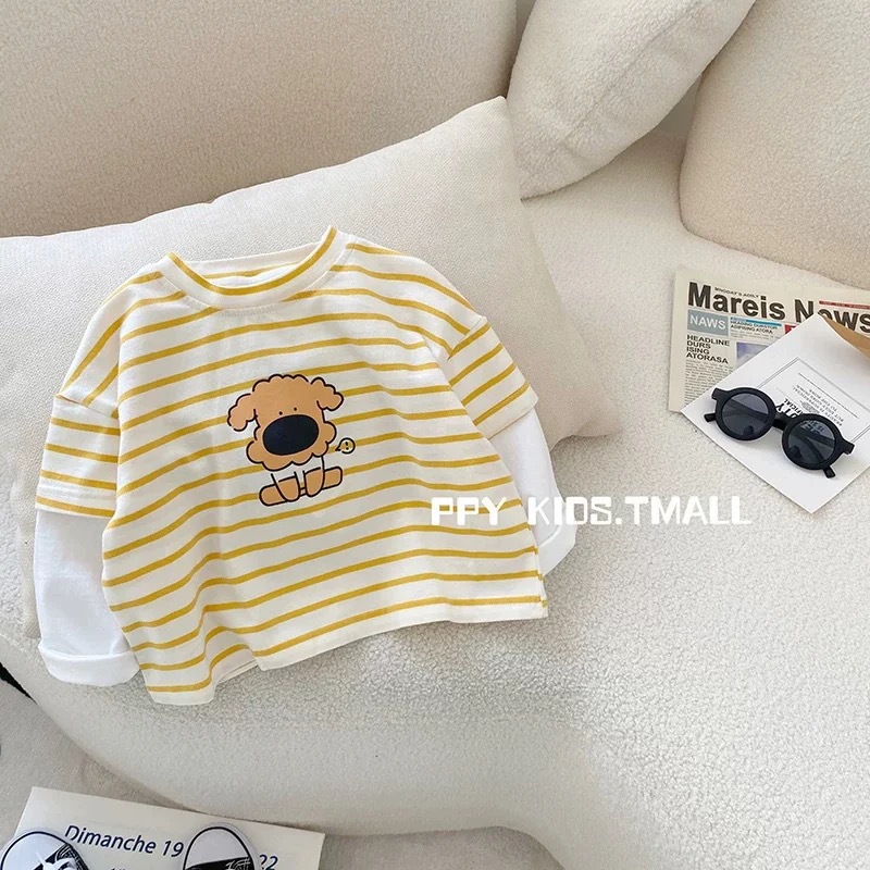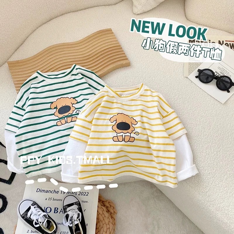 봄과 가을 새로운 아기 봄 줄무늬 상단을위한 아기 가짜 투피스 긴팔 티셔츠 봄 백킹 셔츠스토어 가기