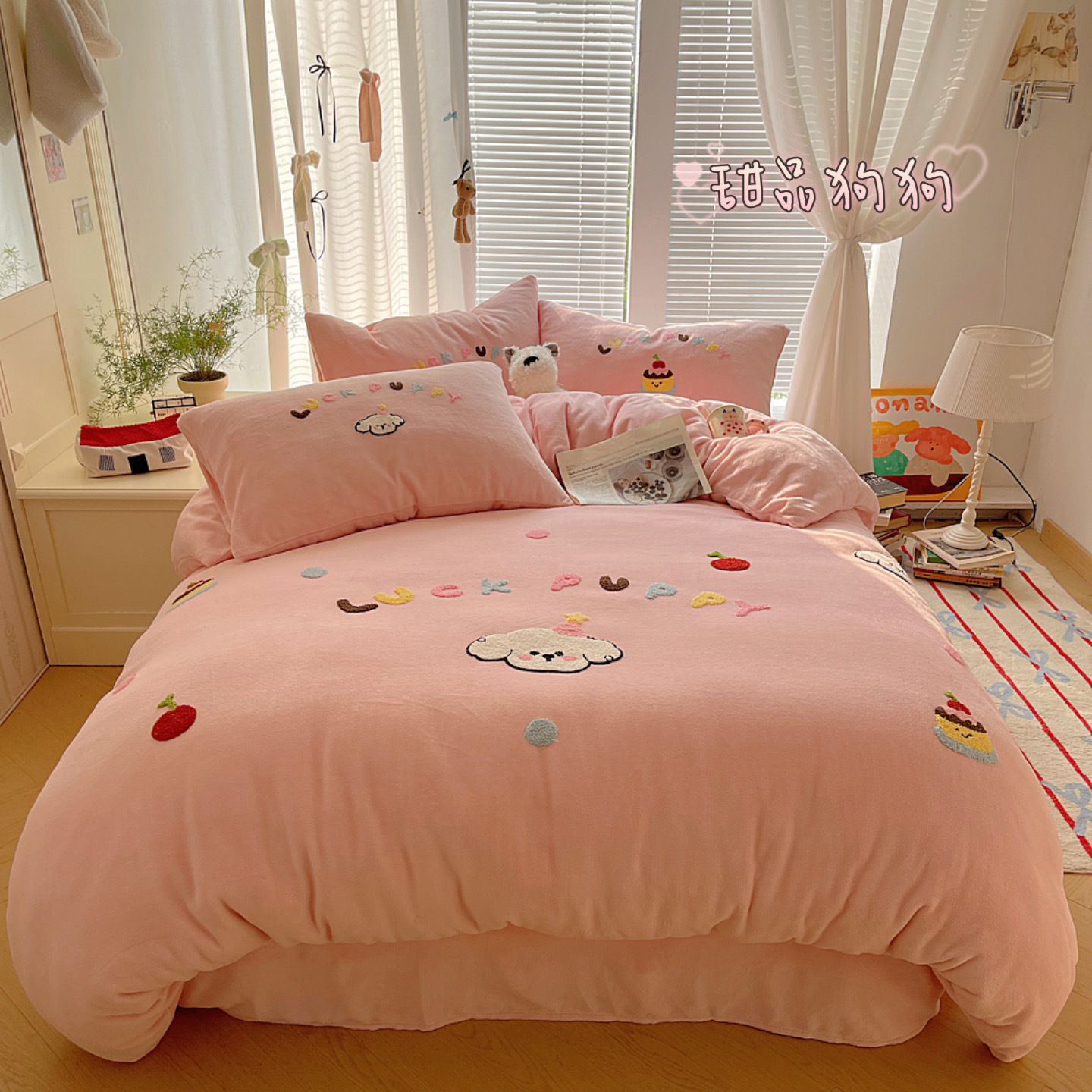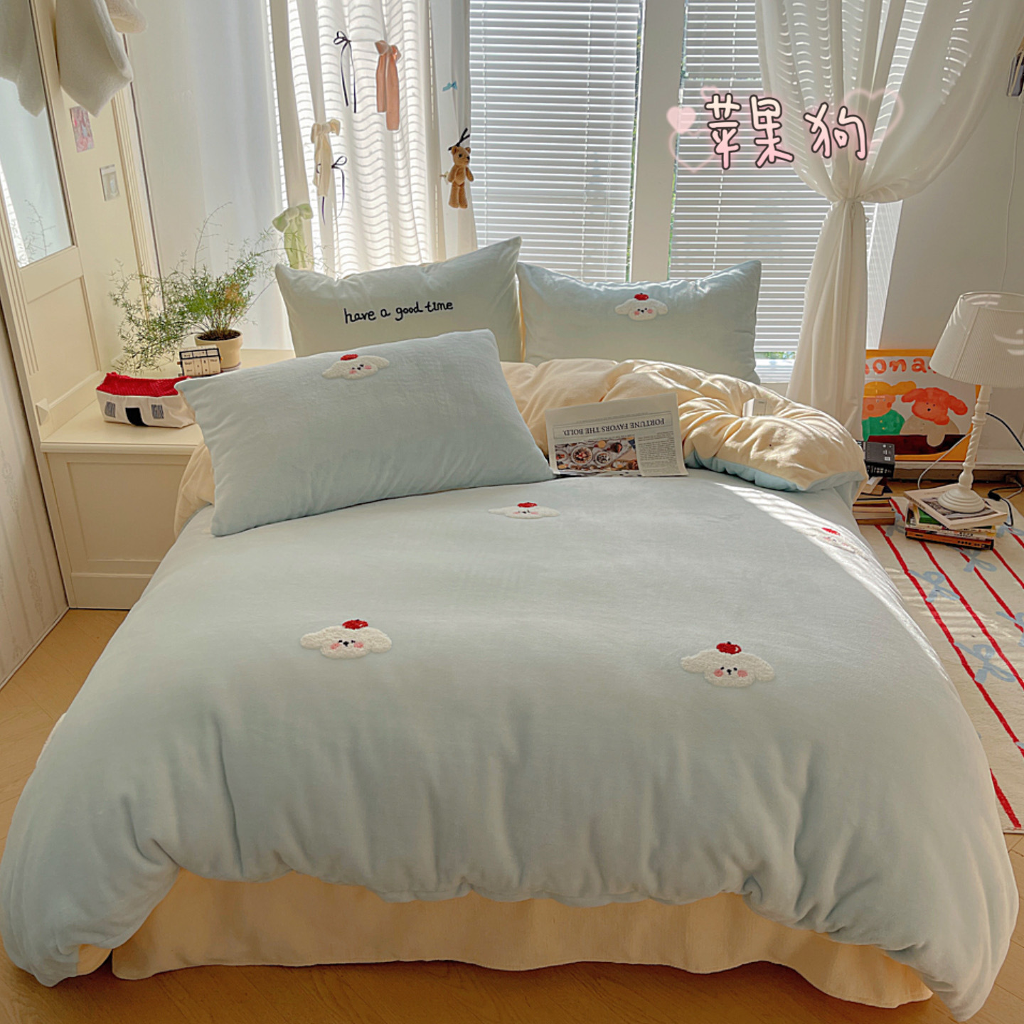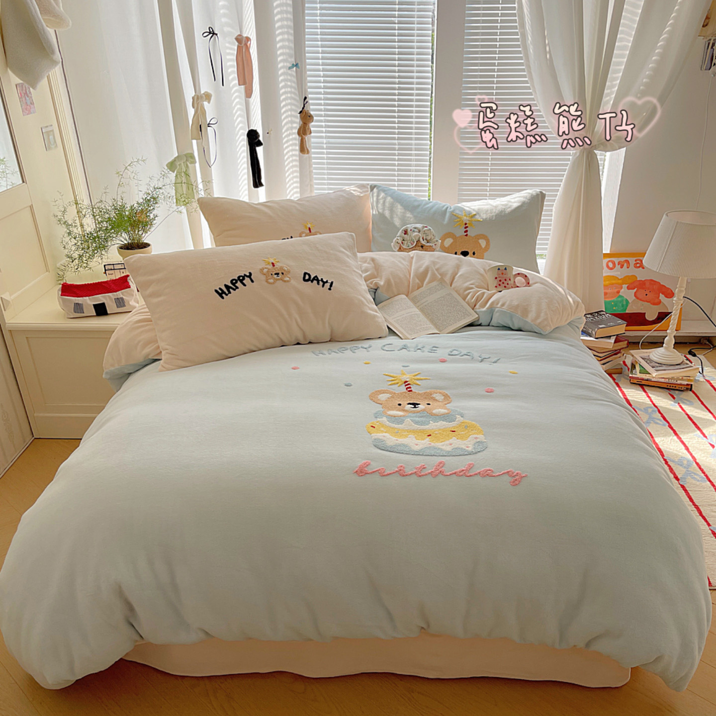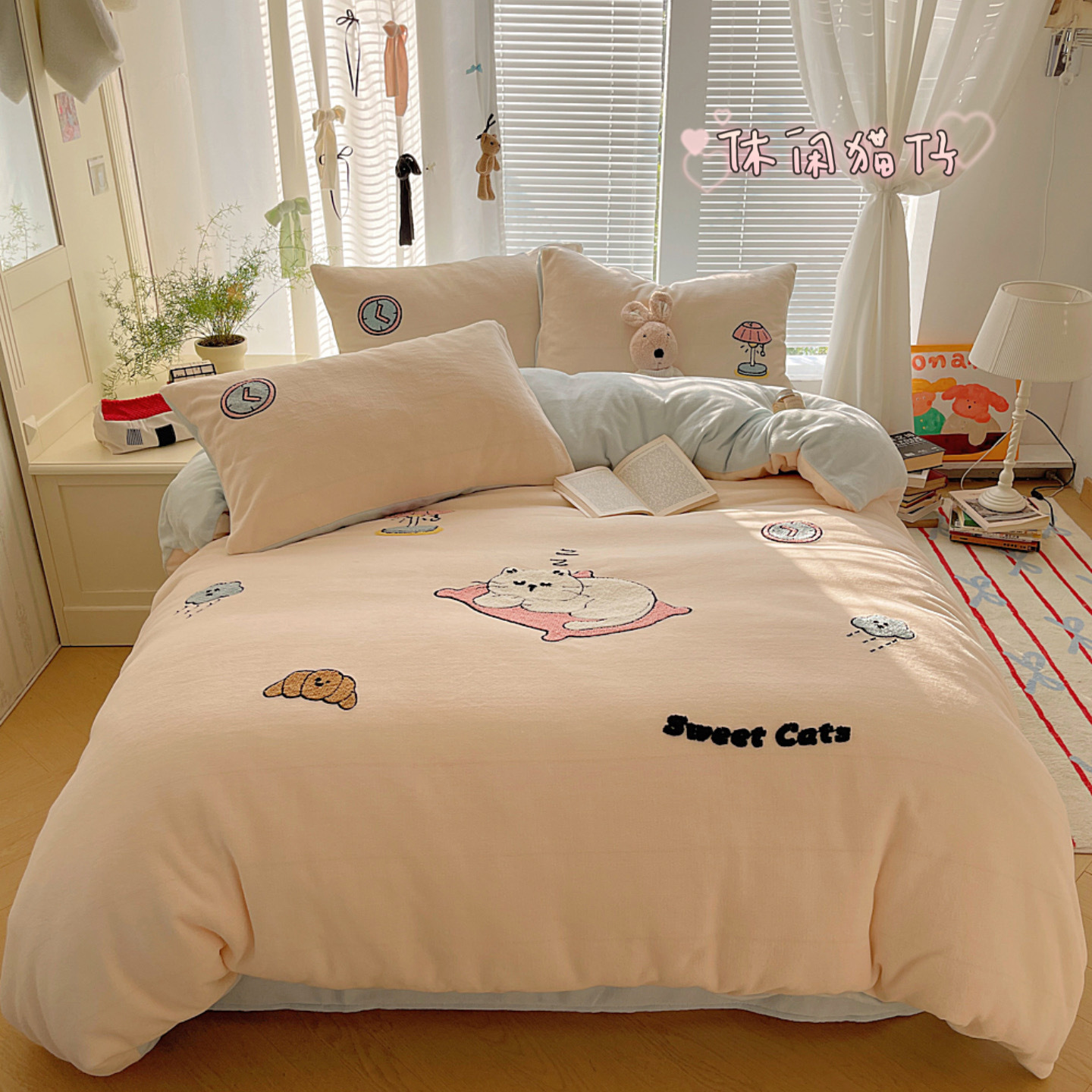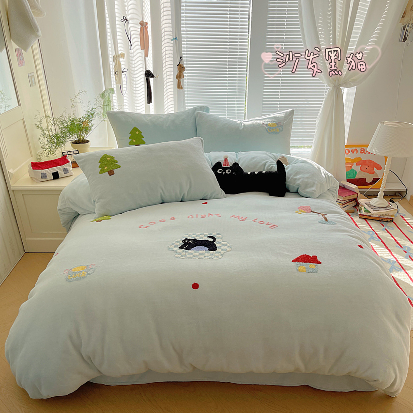 ✅클래스 밀크 벨벳 4 조각 세트 만화 수건 자수 퀼트 커버 플란넬 침대 시트 산호 벨벳 학생 기숙사 3 조각