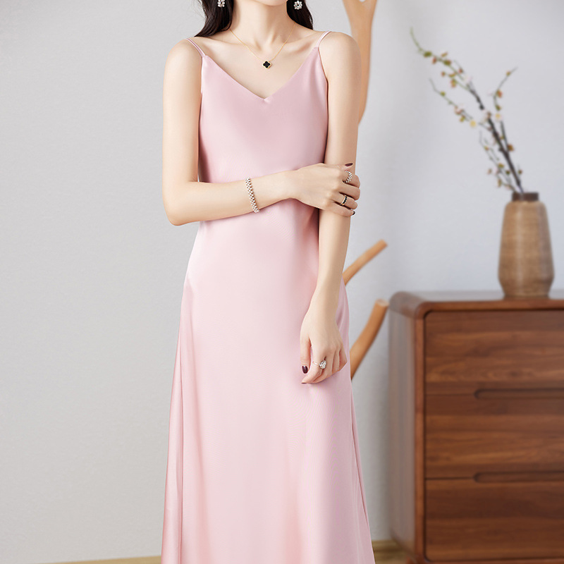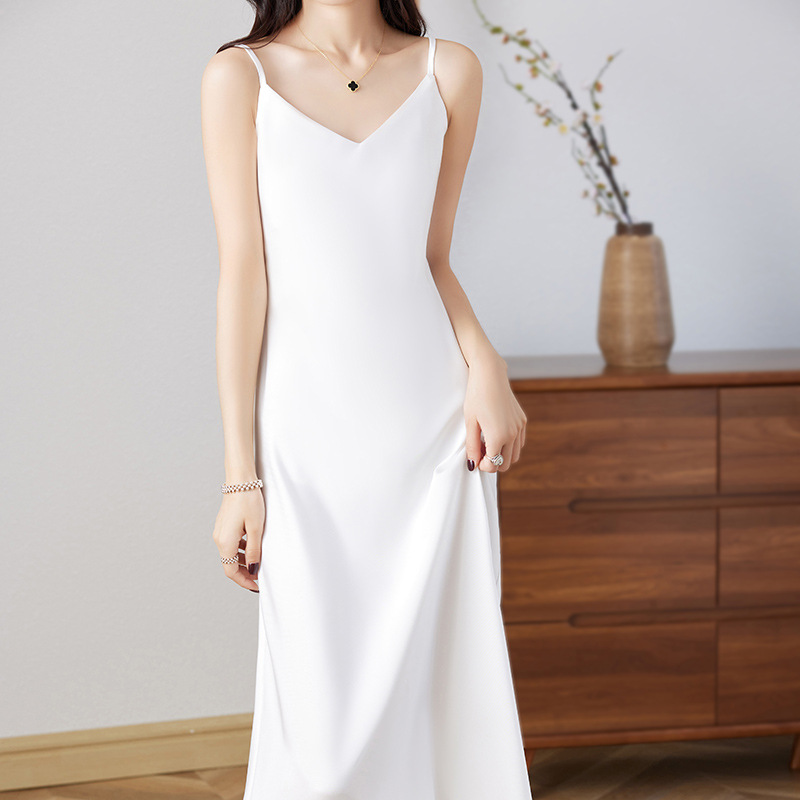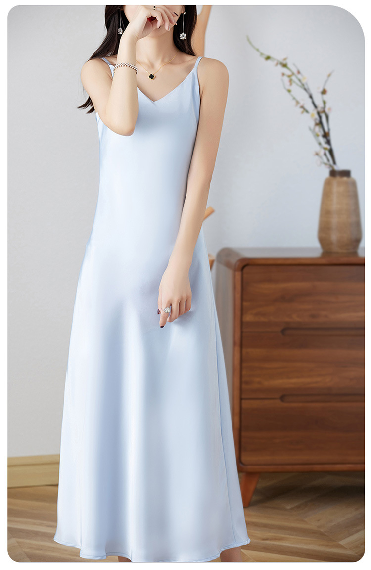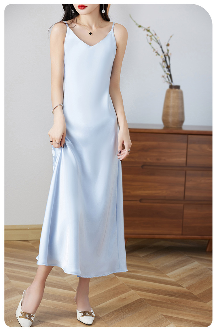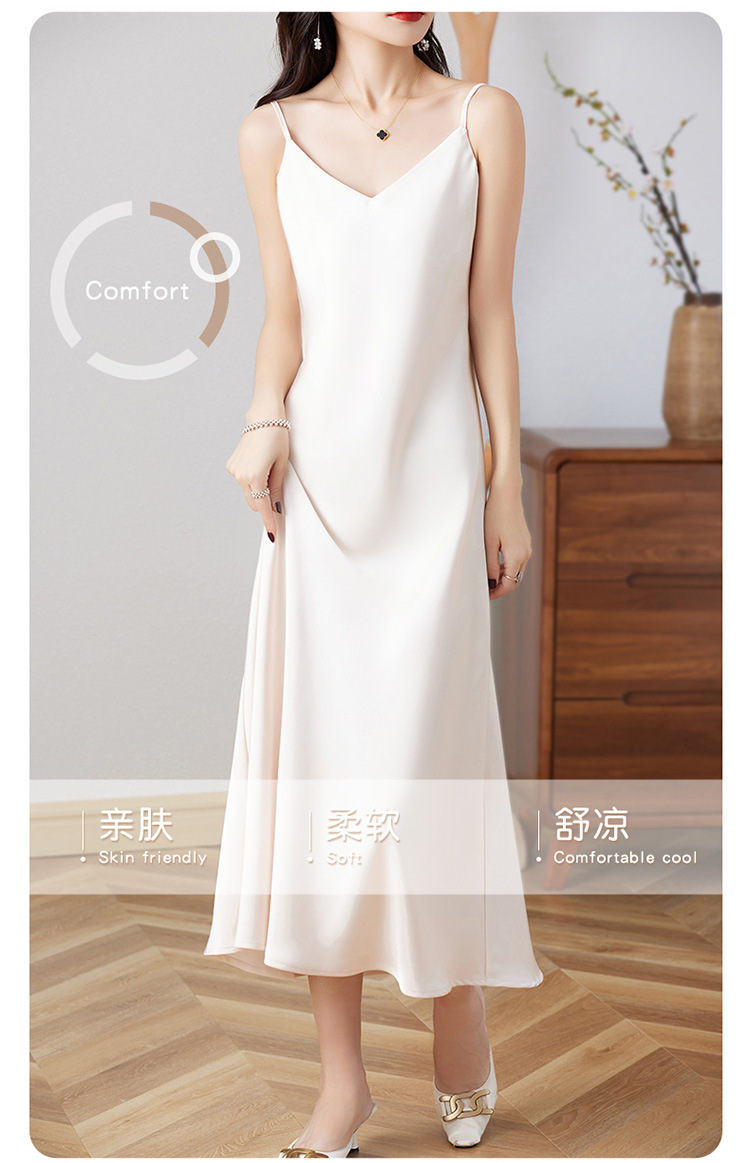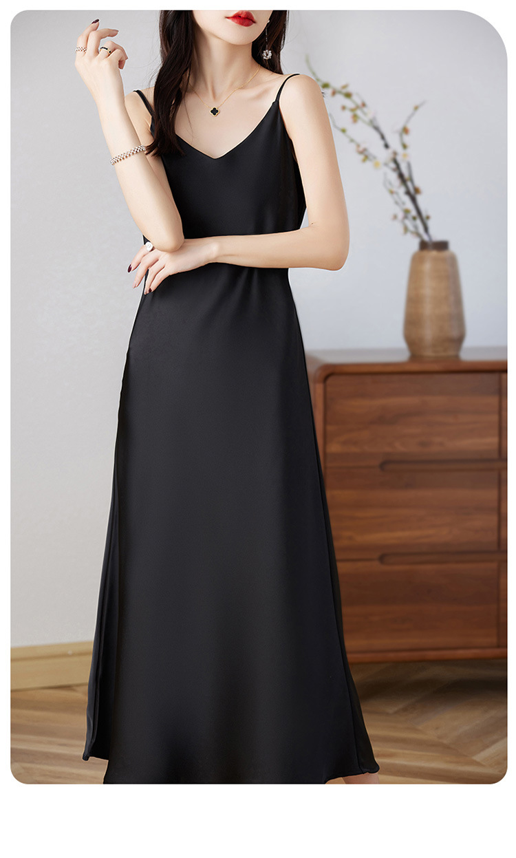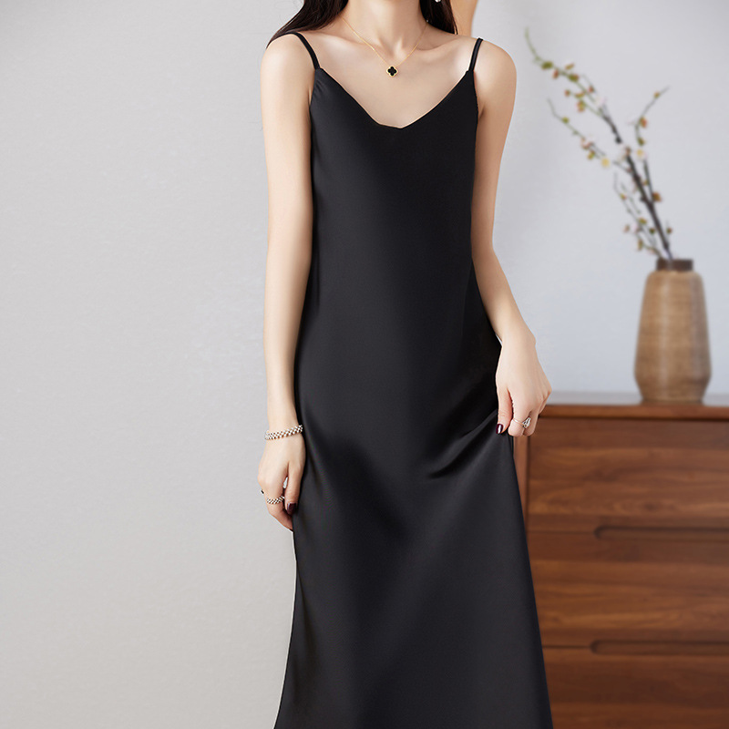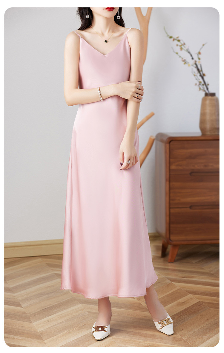 25 새로운 우아한 Acetic Acid Sling Skirt V-Neck Satin 원피스 원피스 긴 스커트 슬림 한 광택 포장