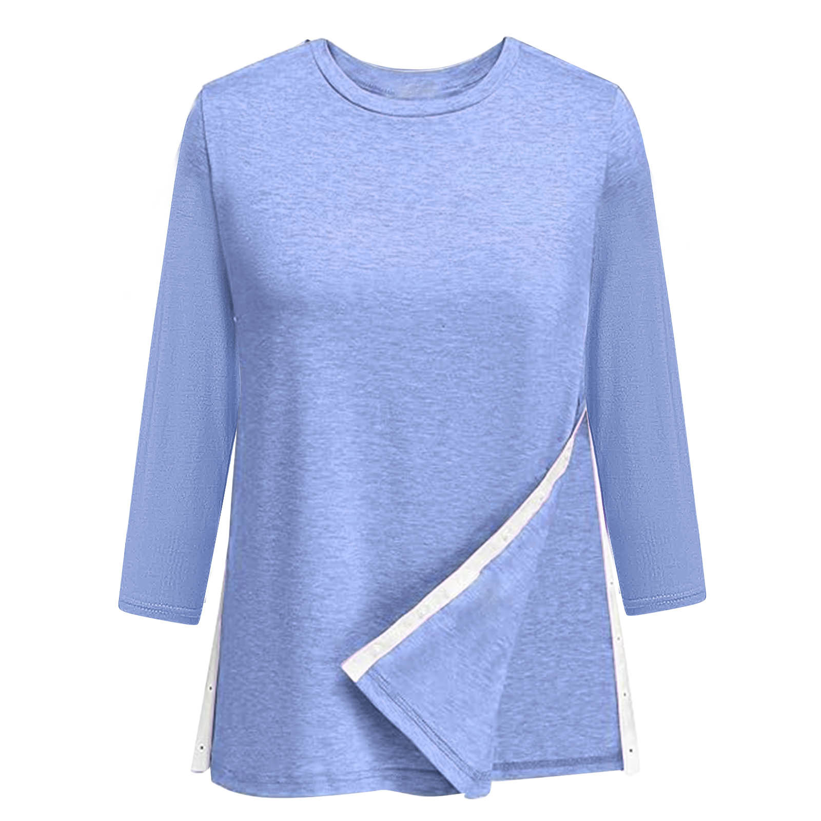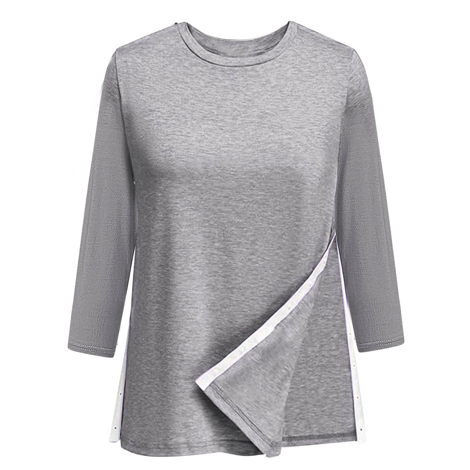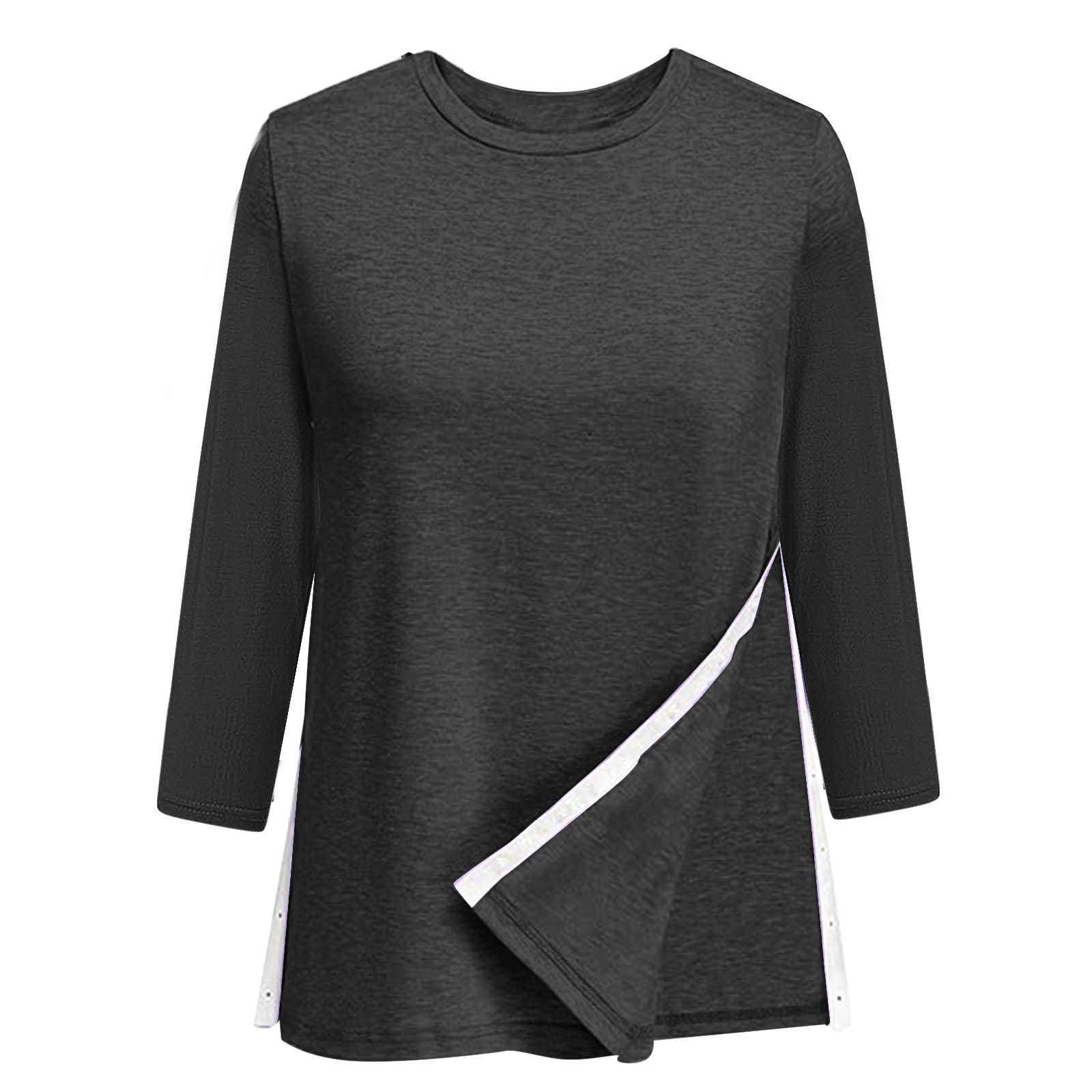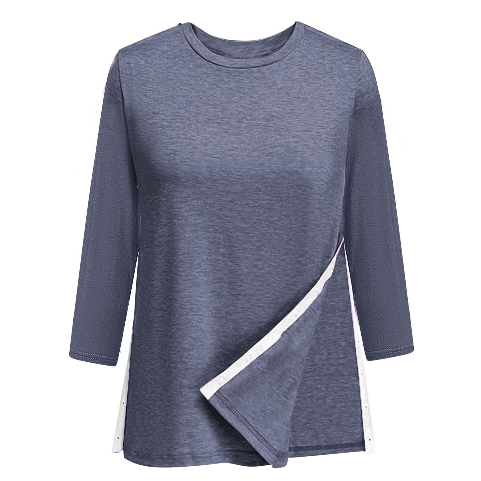 유럽과 미국의 아마존 여성 티셔츠 사이드 바느질 긴 소매 조정 가능한 버튼 라운드 캐주얼 루즈 탑스토어 가기
