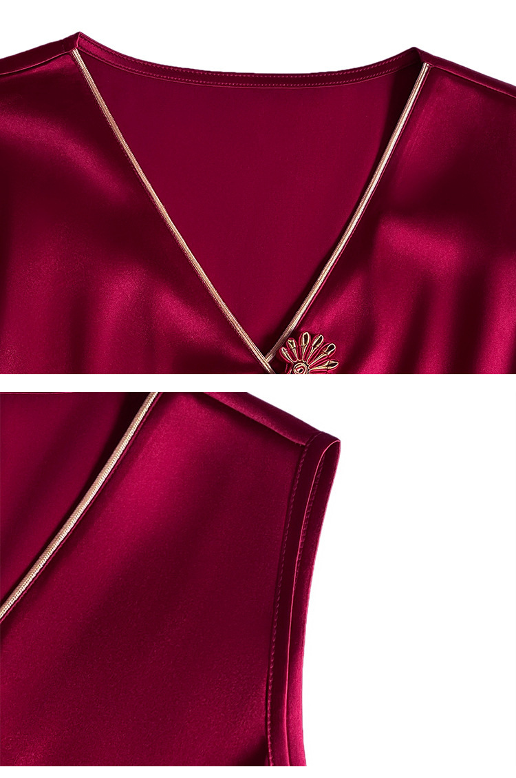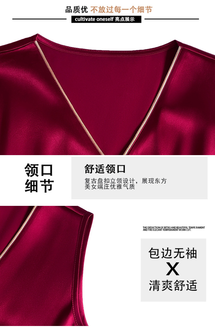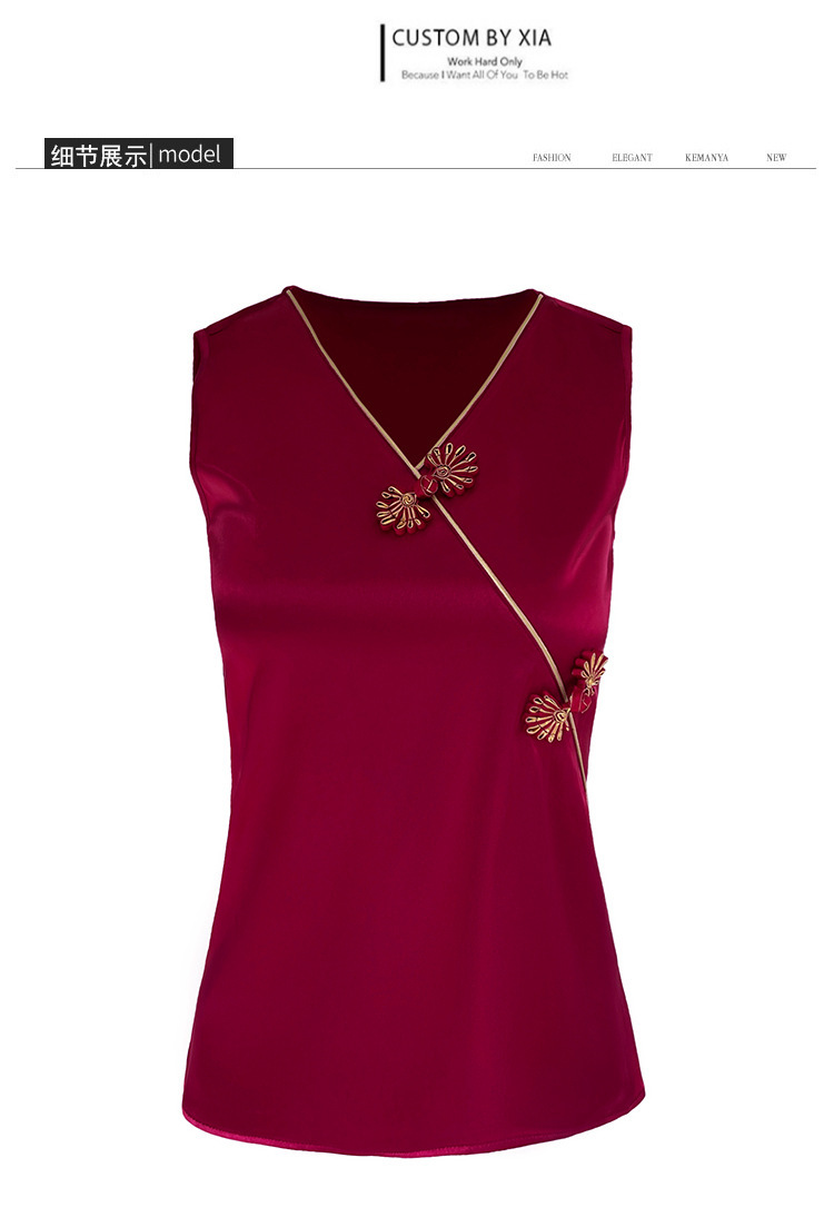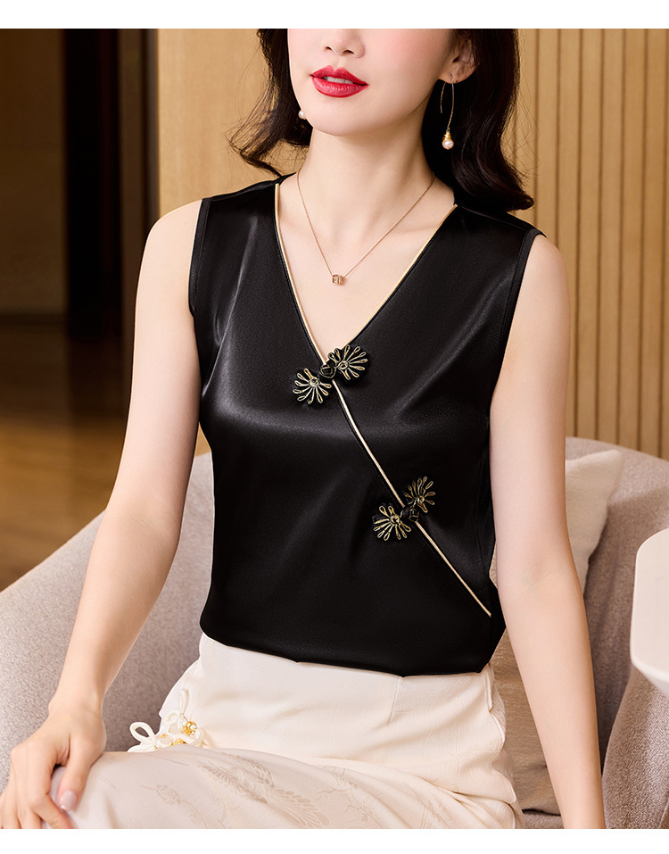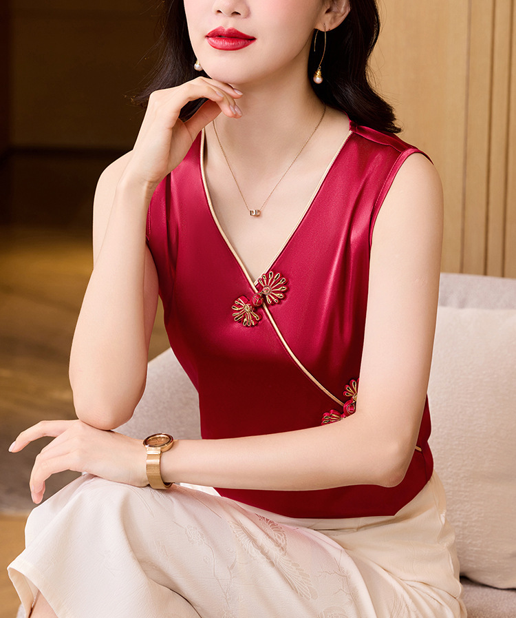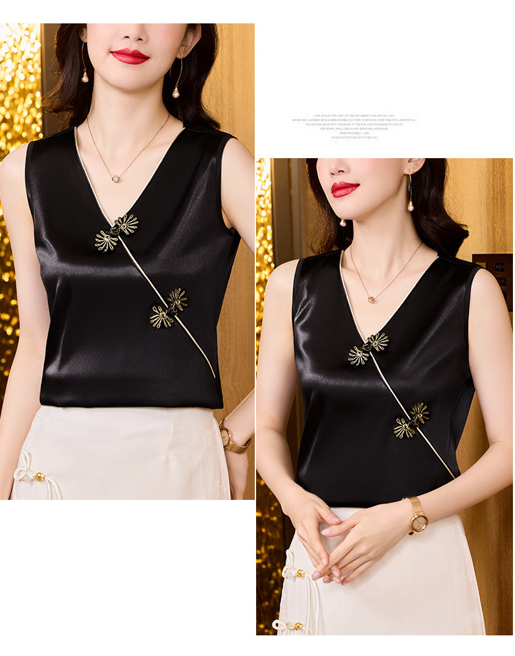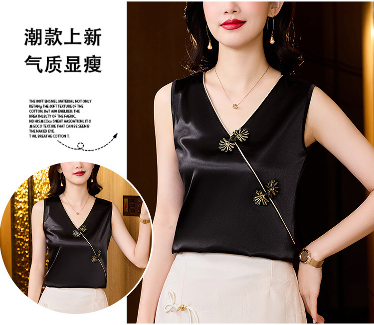 2025 새로운 Acetic Acid Satin Base 외부 민소매 탑으로 새로운 중국 스타일 V 넥 카미 솔 여성 내부 조끼