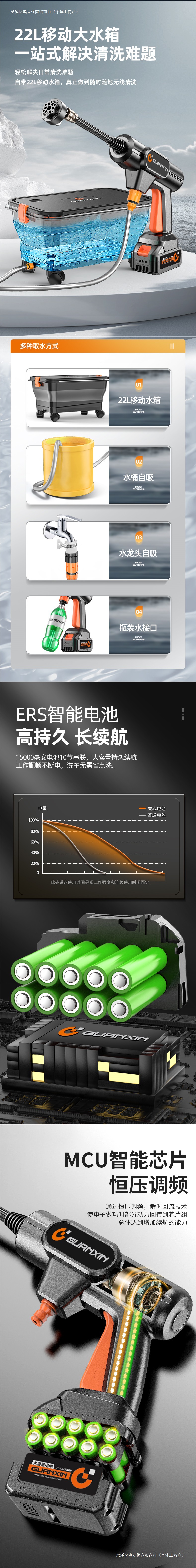 • 에너지 집중형 브러시리스 플래그십 모델 A - 이동식 접이식 저장 물탱크 - 15000MAh 단일 배터리 - 에너지 집중형 강력 가압 6-in-1 노즐