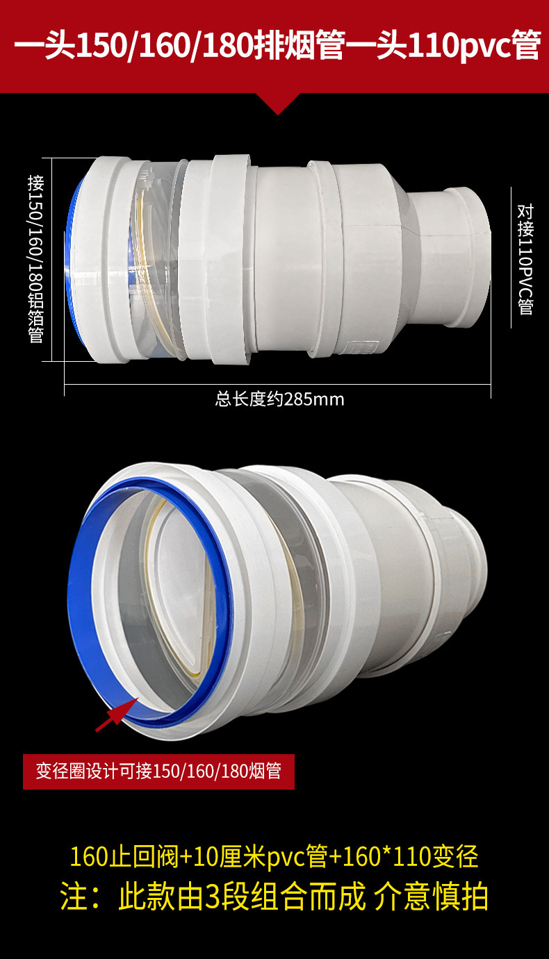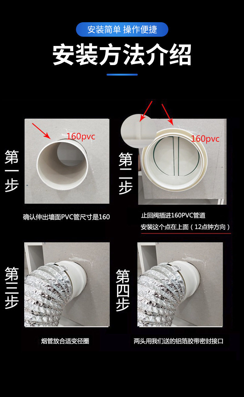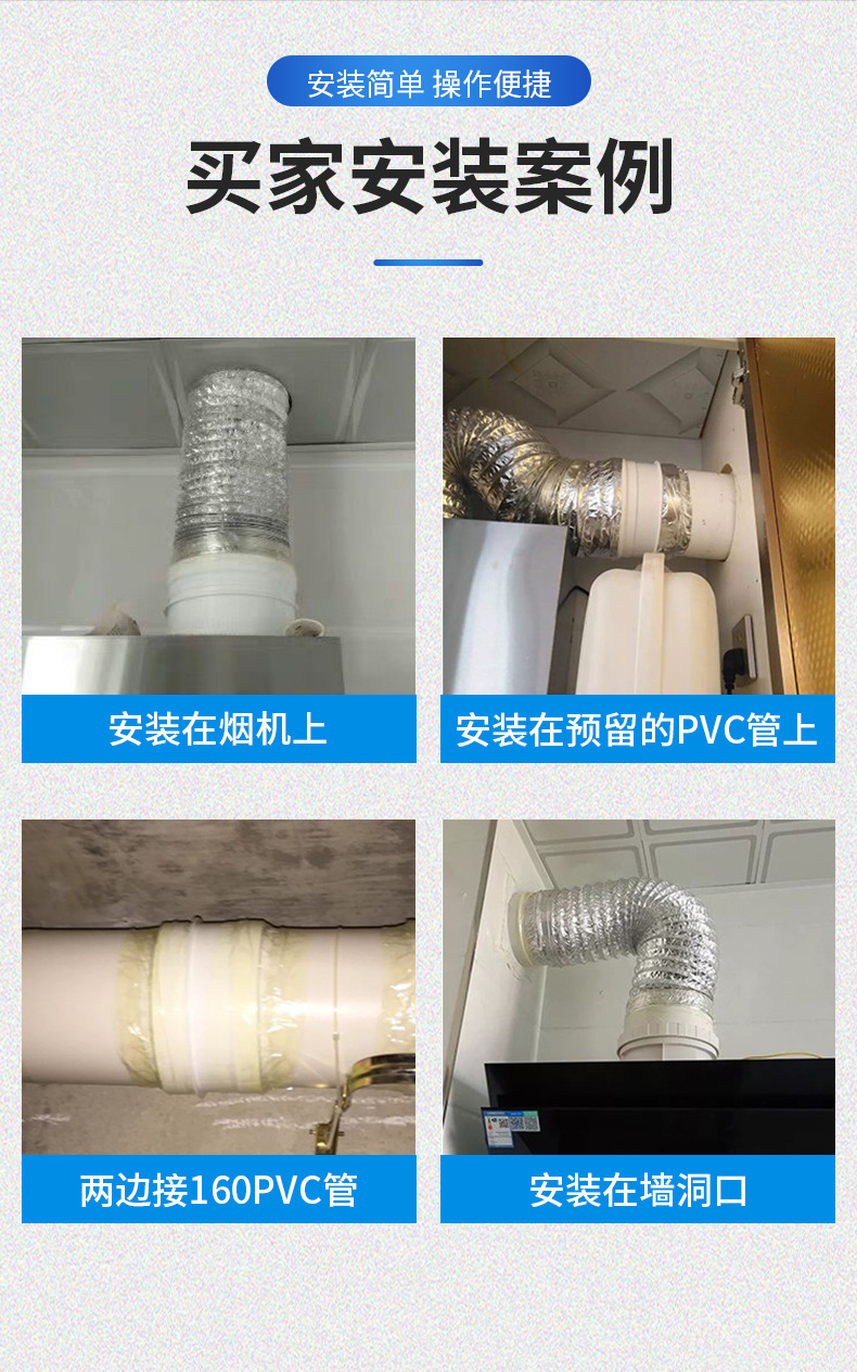 • 한쪽 끝은 160PVC 파이프에 연결되고 다른 쪽 끝은 배기관에 연결됩니다.
