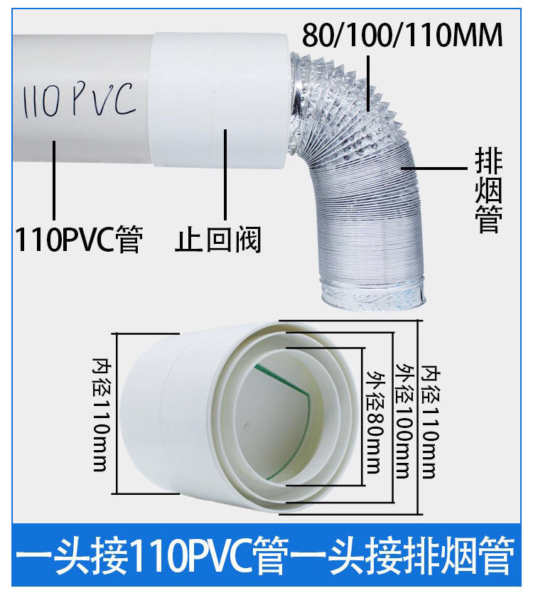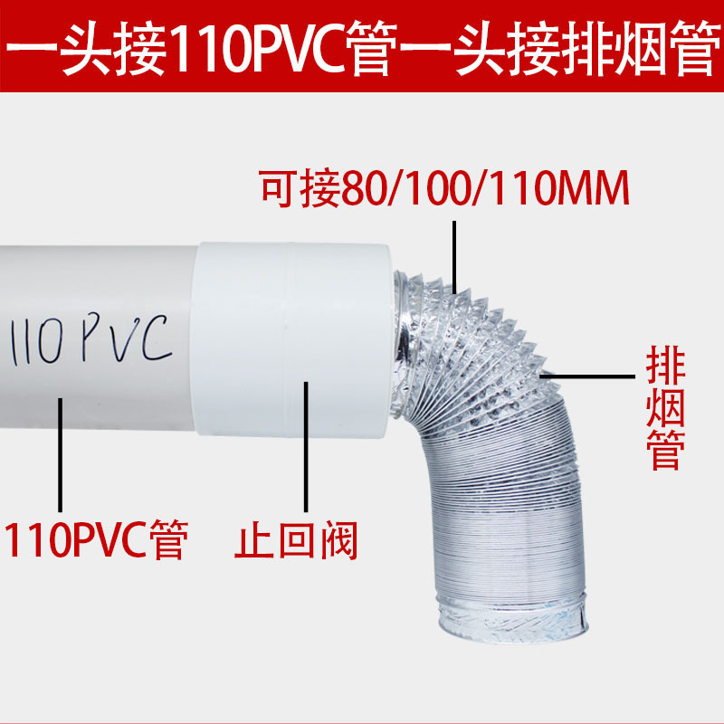 • 한쪽 끝은 110PVC 파이프에 연결되고 다른 쪽 끝은 배기관에 연결됩니다.