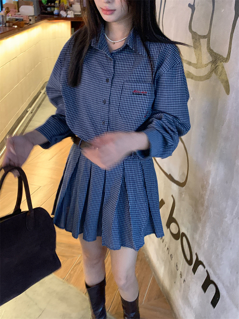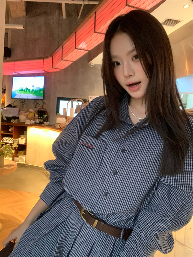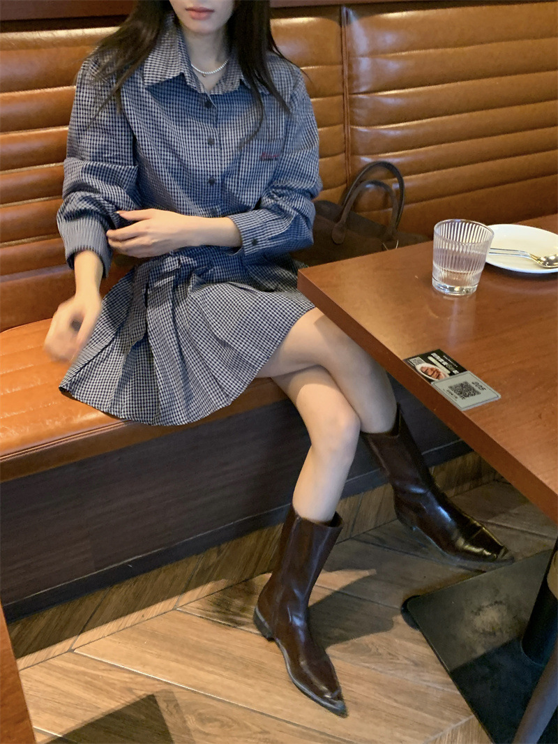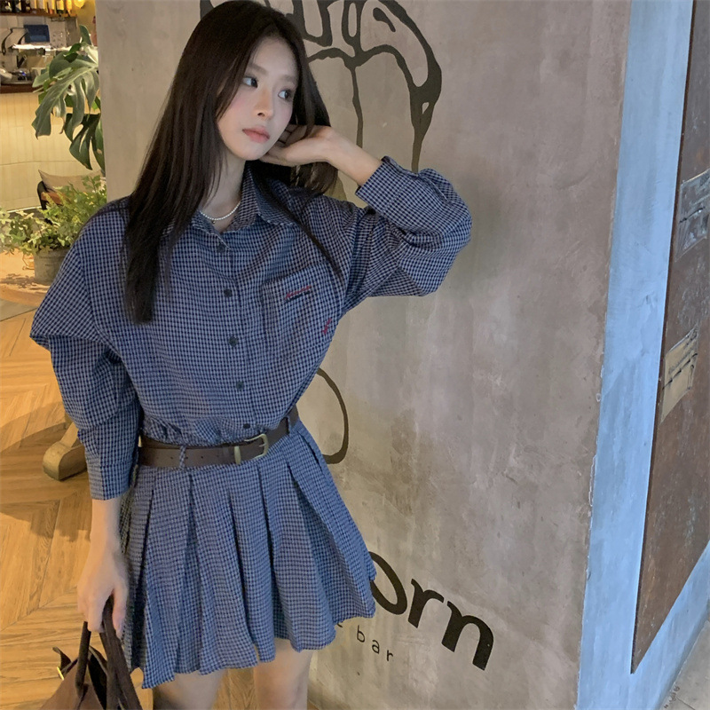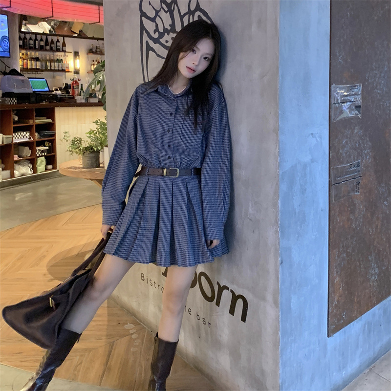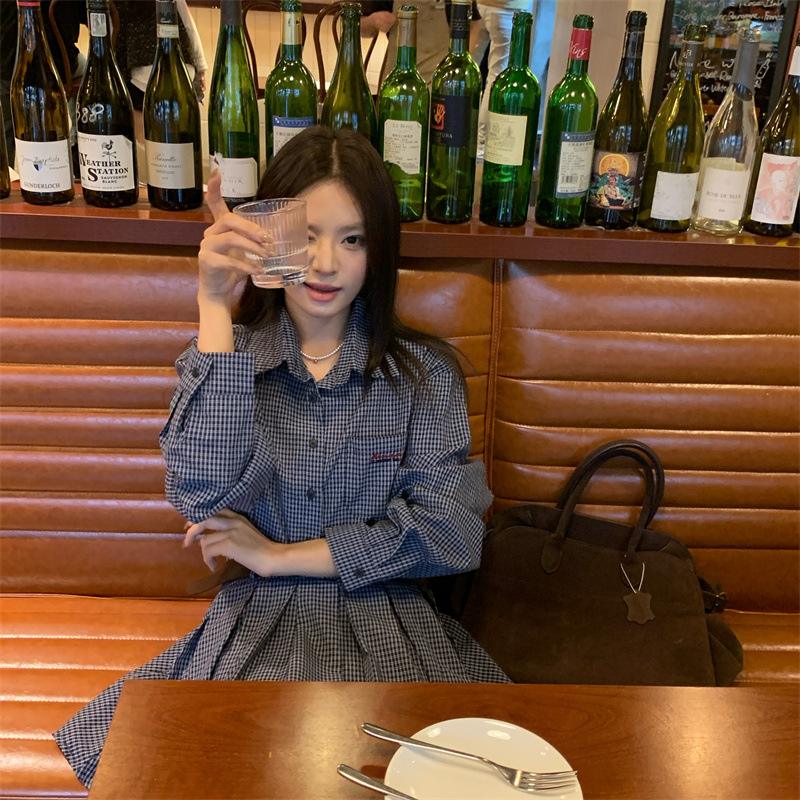 빈티지 숙녀 이른 봄 한국 스타일 느슨한 옷깃 슬림 셔츠 체크 무늬 원피스 트렌디스토어 가기