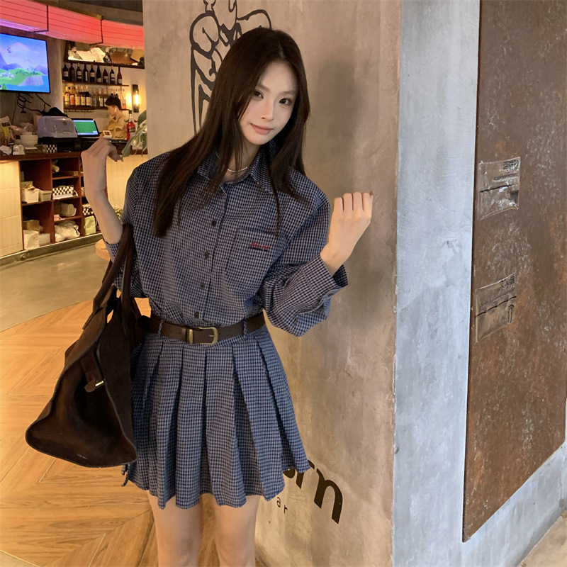 • 블루 체크 스커트 + 벨트
