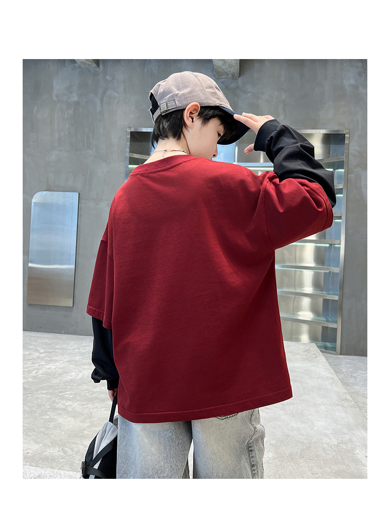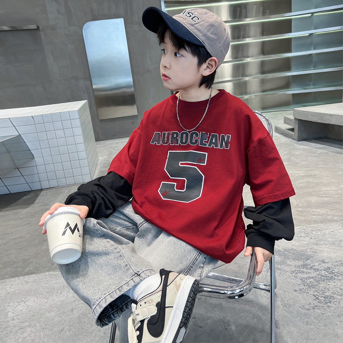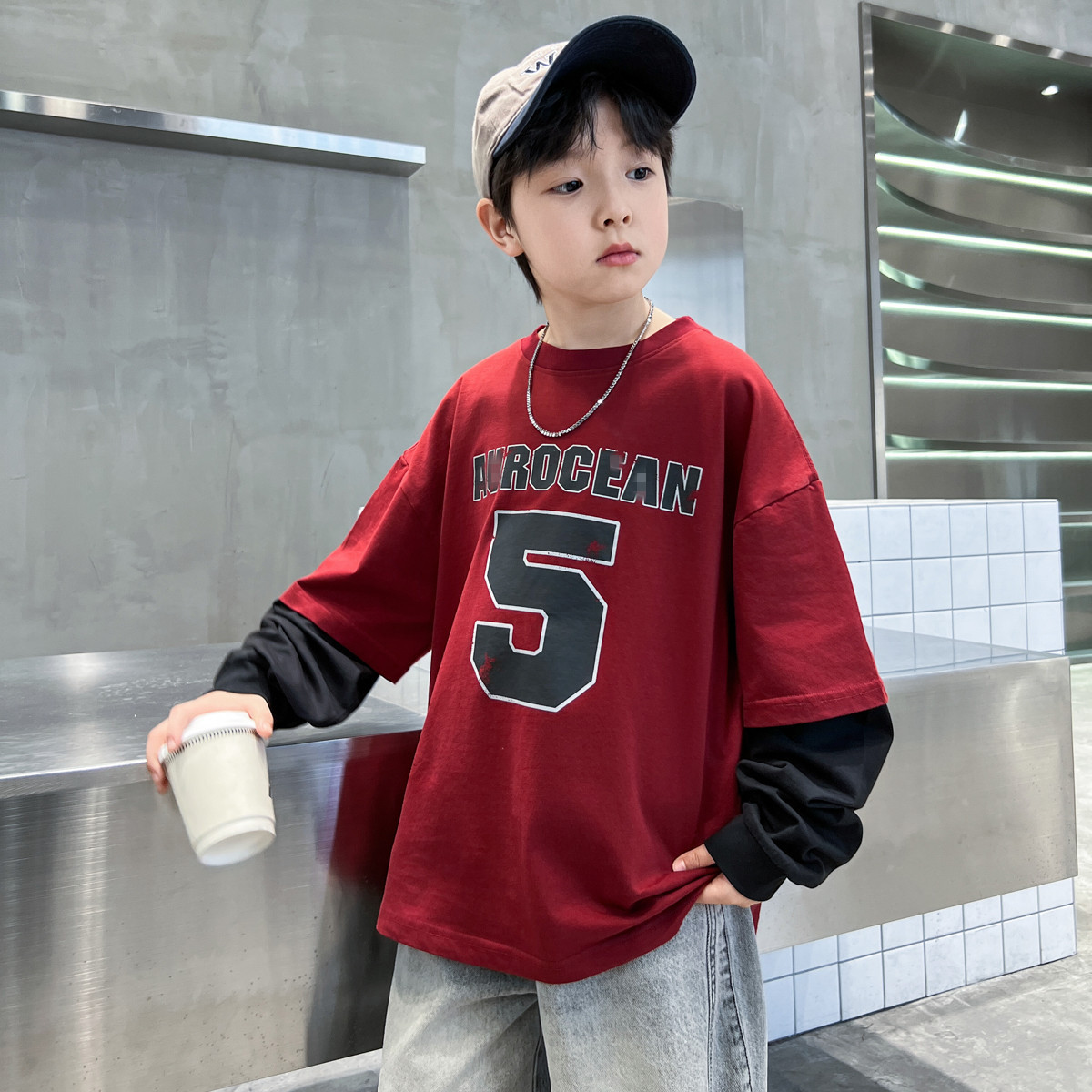 봄 소년 긴팔 티셔츠 아동복 어린이 십대 소년 5 스플라이스 슬리브 페이크 투피스 탑 루즈 티셔츠스토어 가기
