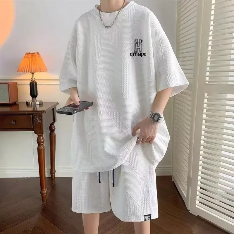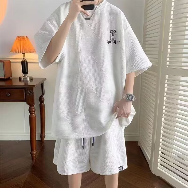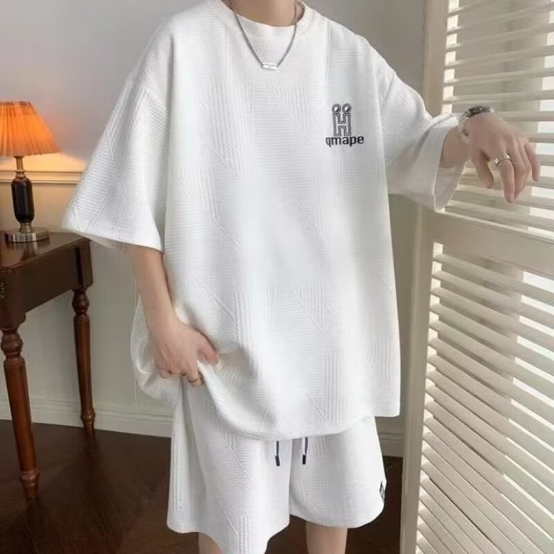 2025 새로운 도착 와플 러 남자 티셔츠 여름 느슨한 플러스 사이즈 십대 짧은 소매 반바지 캐주얼 스포츠 세트