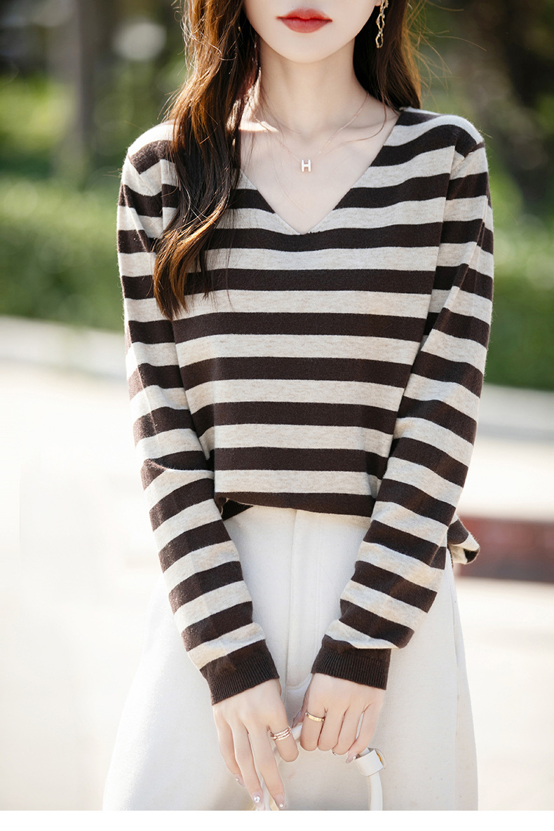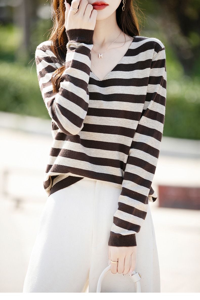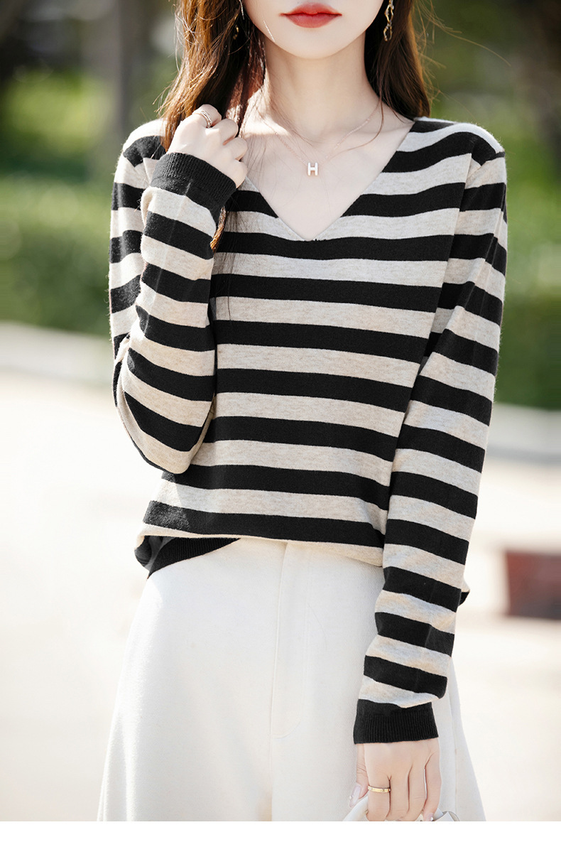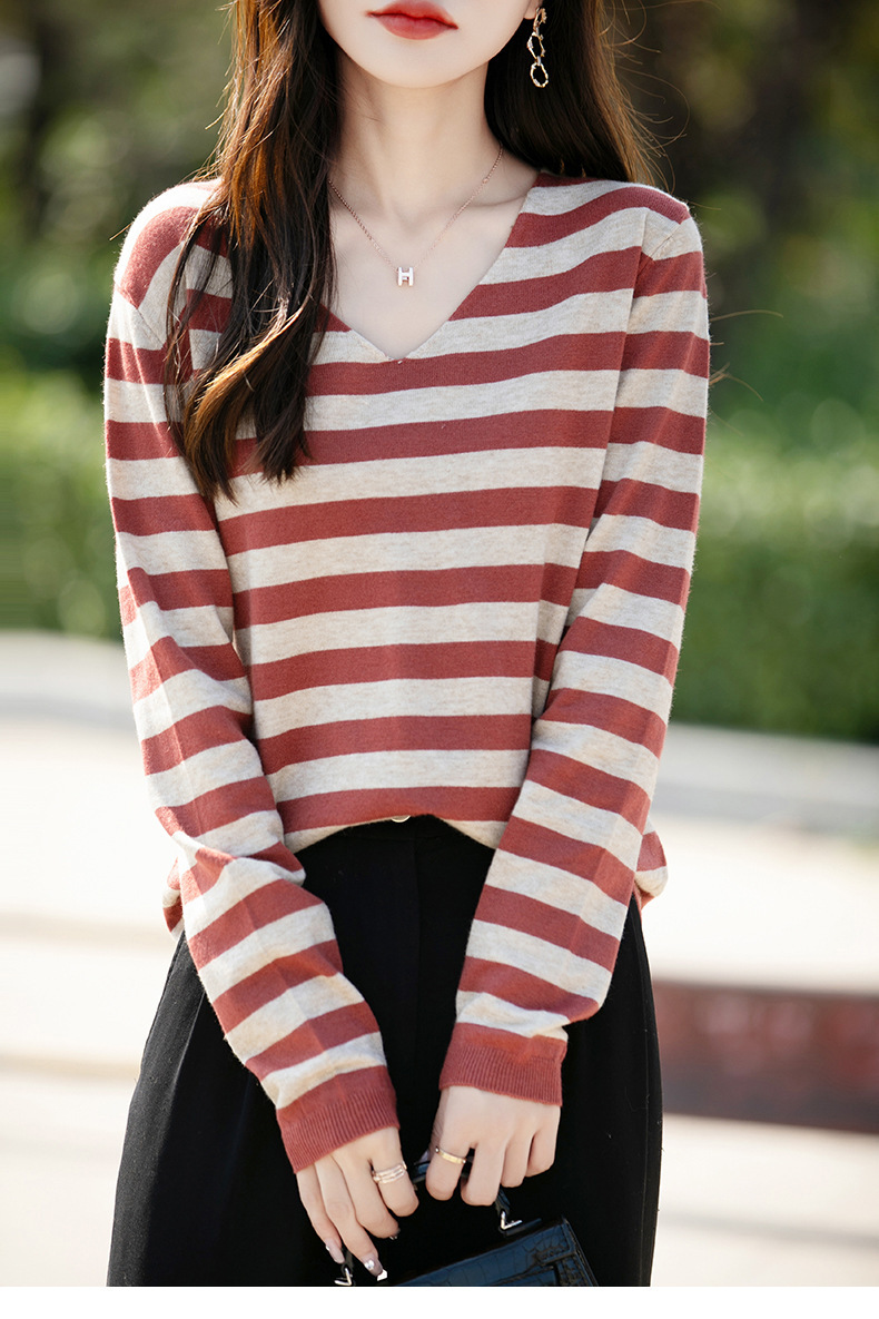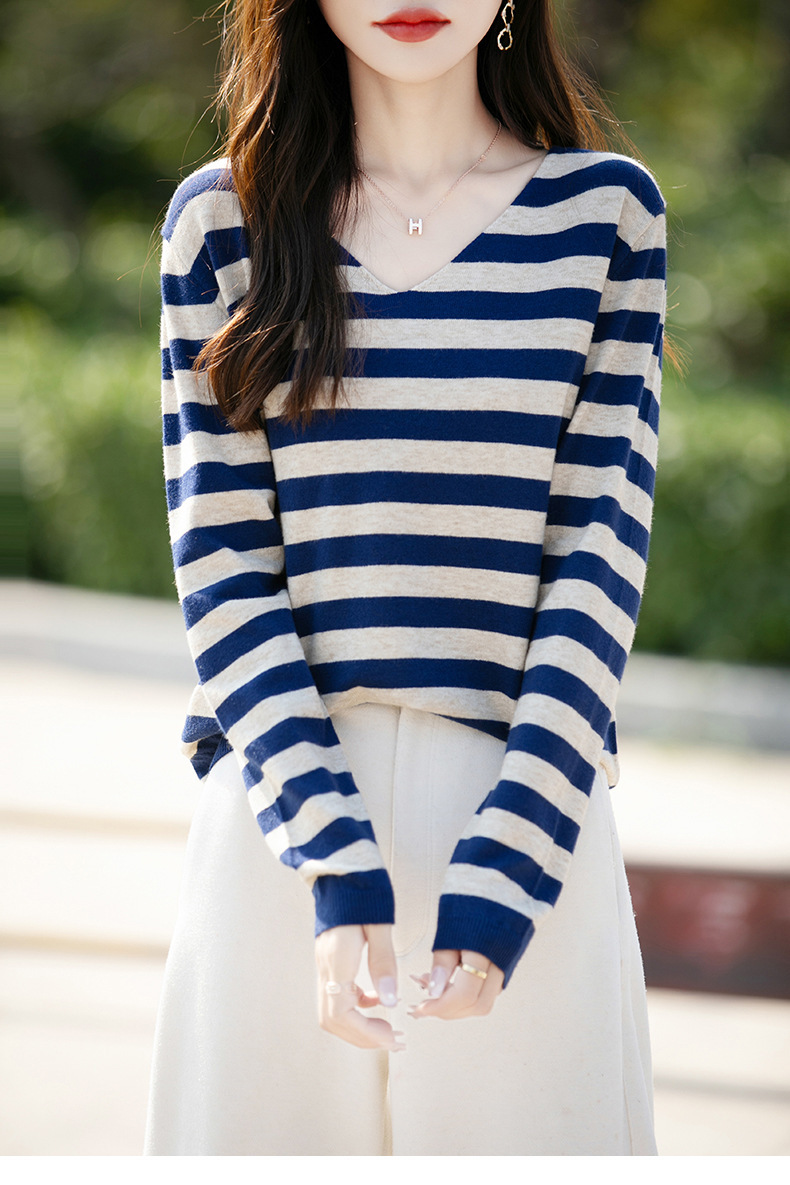 25 년의 봄과 가을 새로운 여성 스웨터 v 칼라 스트라이프 느슨한 바닥 셔츠 대비 패션 스웨터 헤어 세대스토어 가기