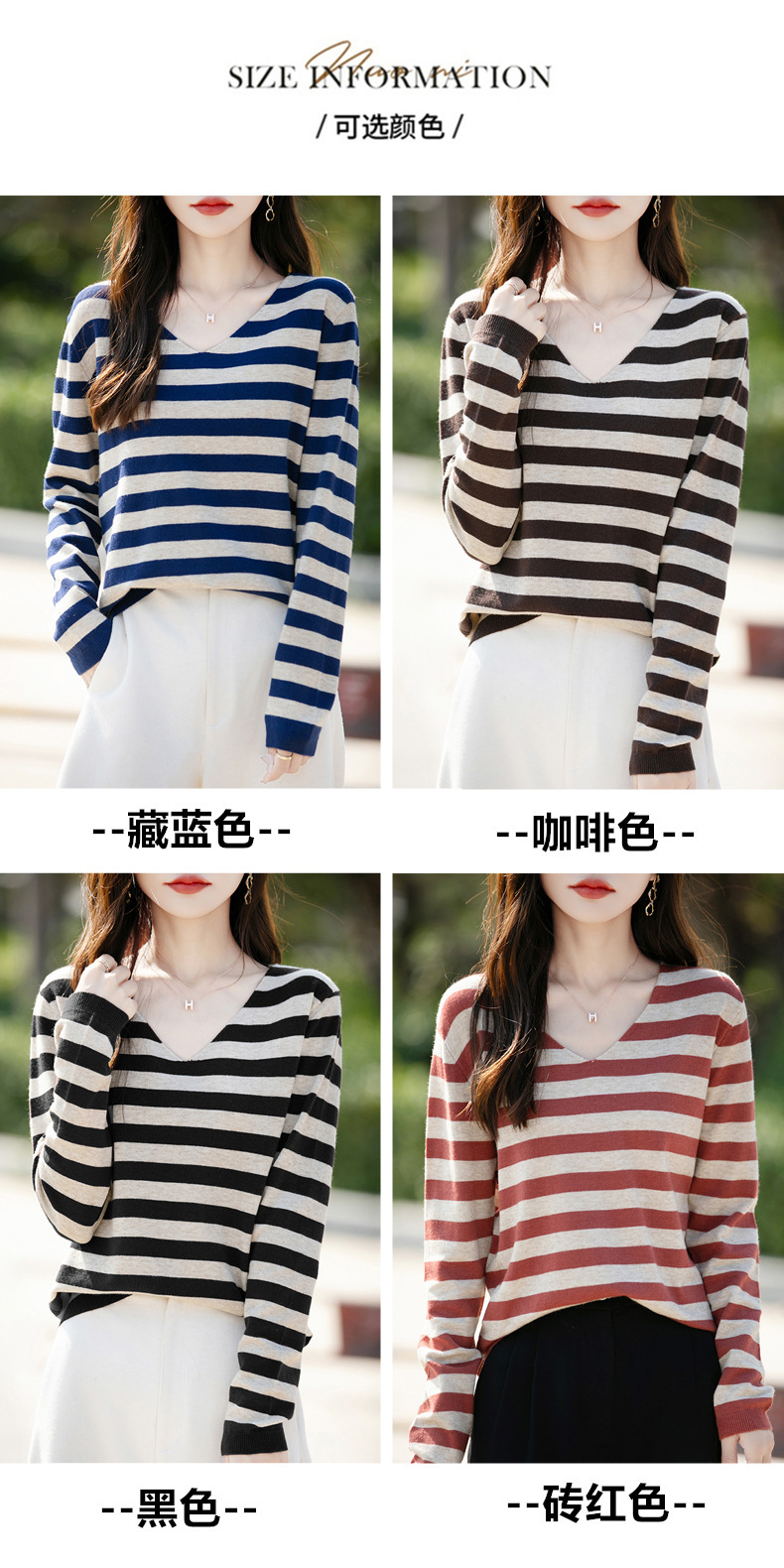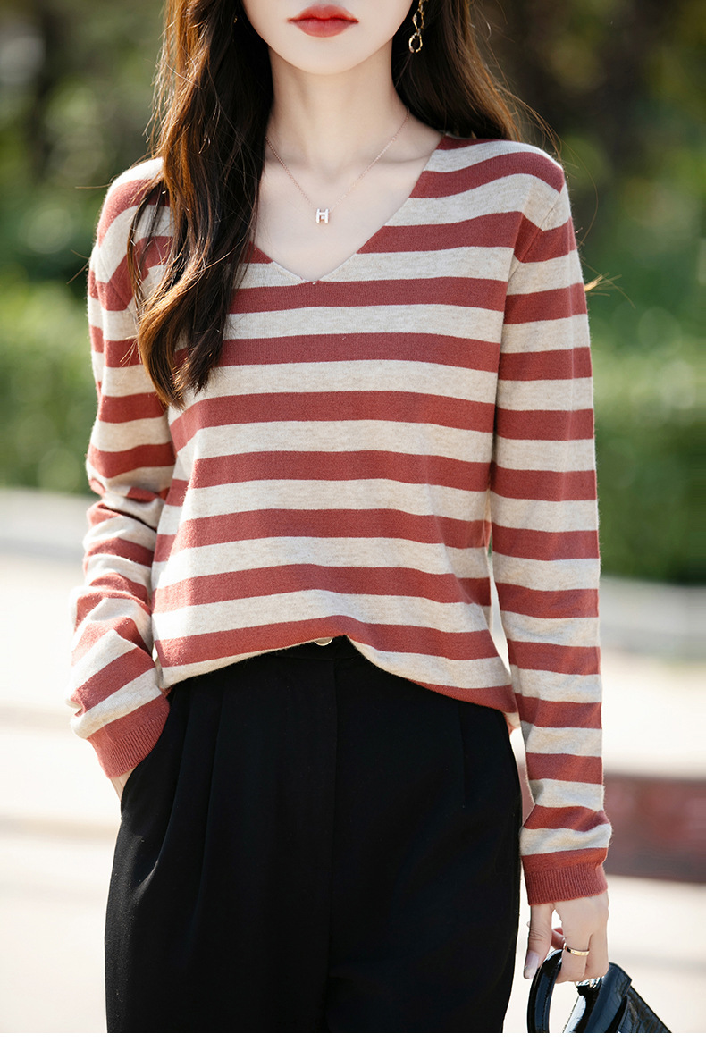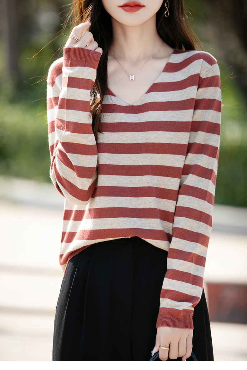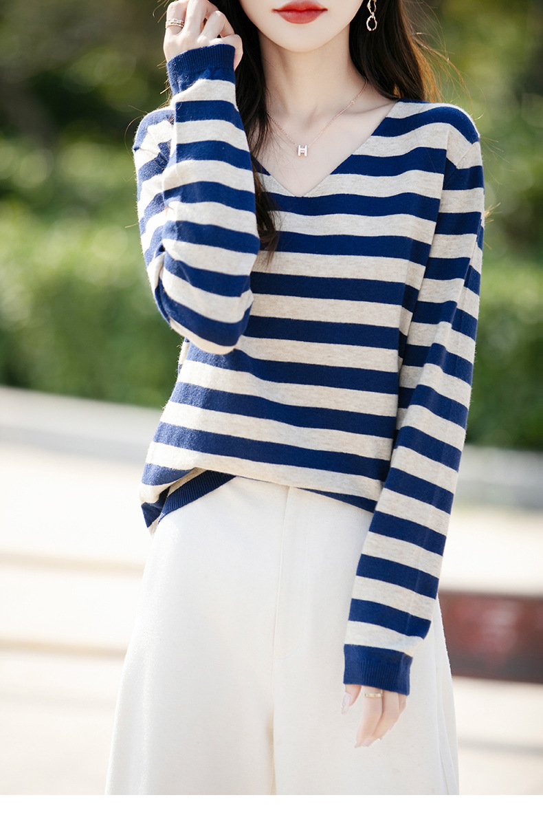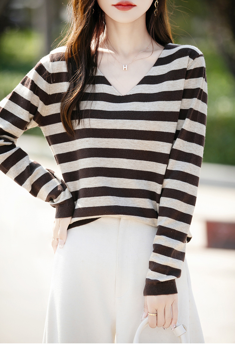 25 년의 봄과 가을 새로운 여성 스웨터 v 칼라 스트라이프 느슨한 바닥 셔츠 대비 패션 스웨터 헤어 세대스토어 가기