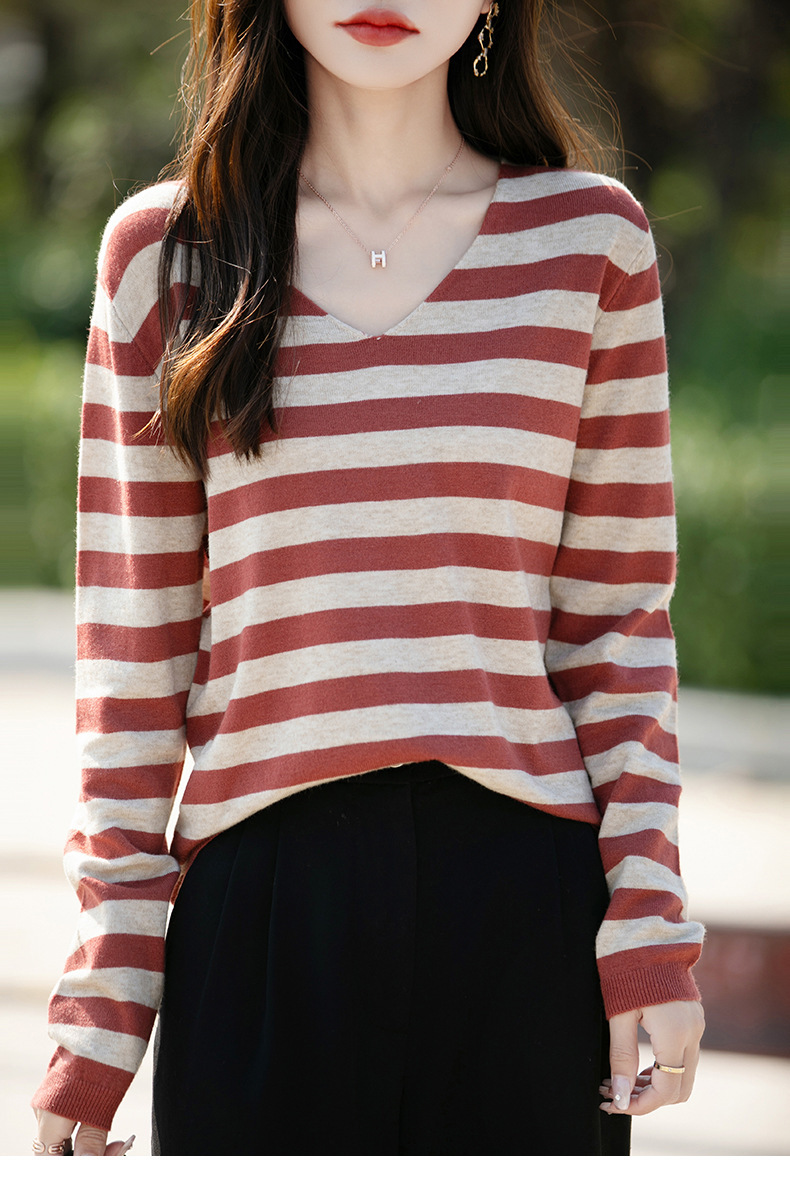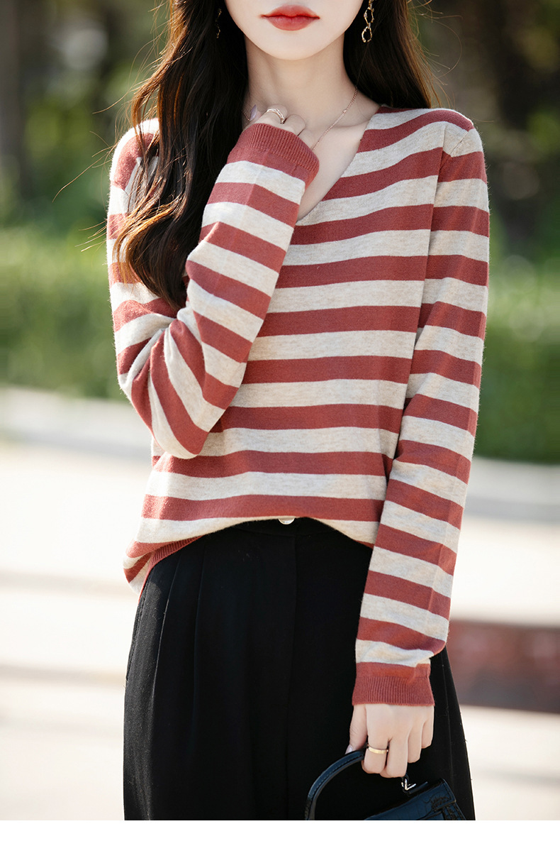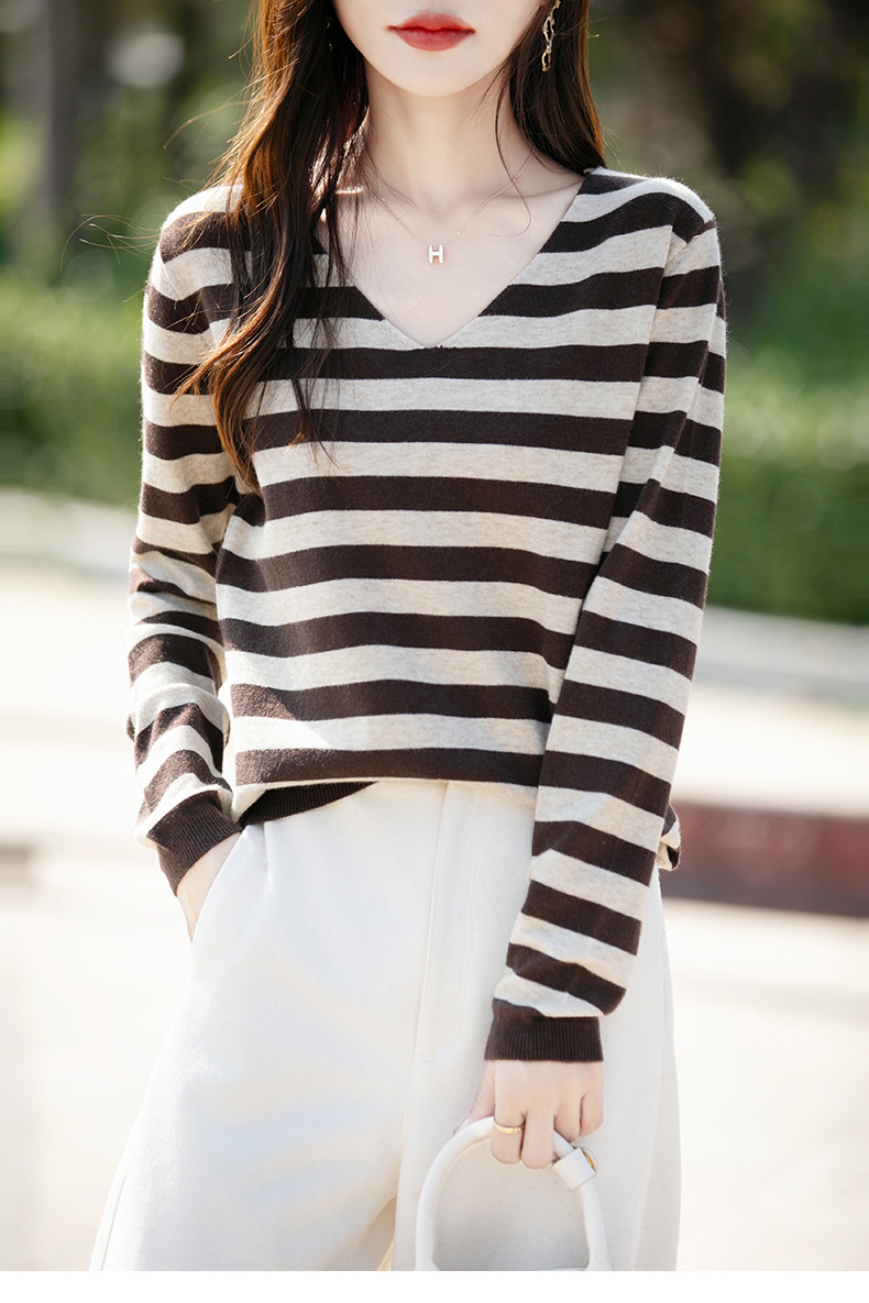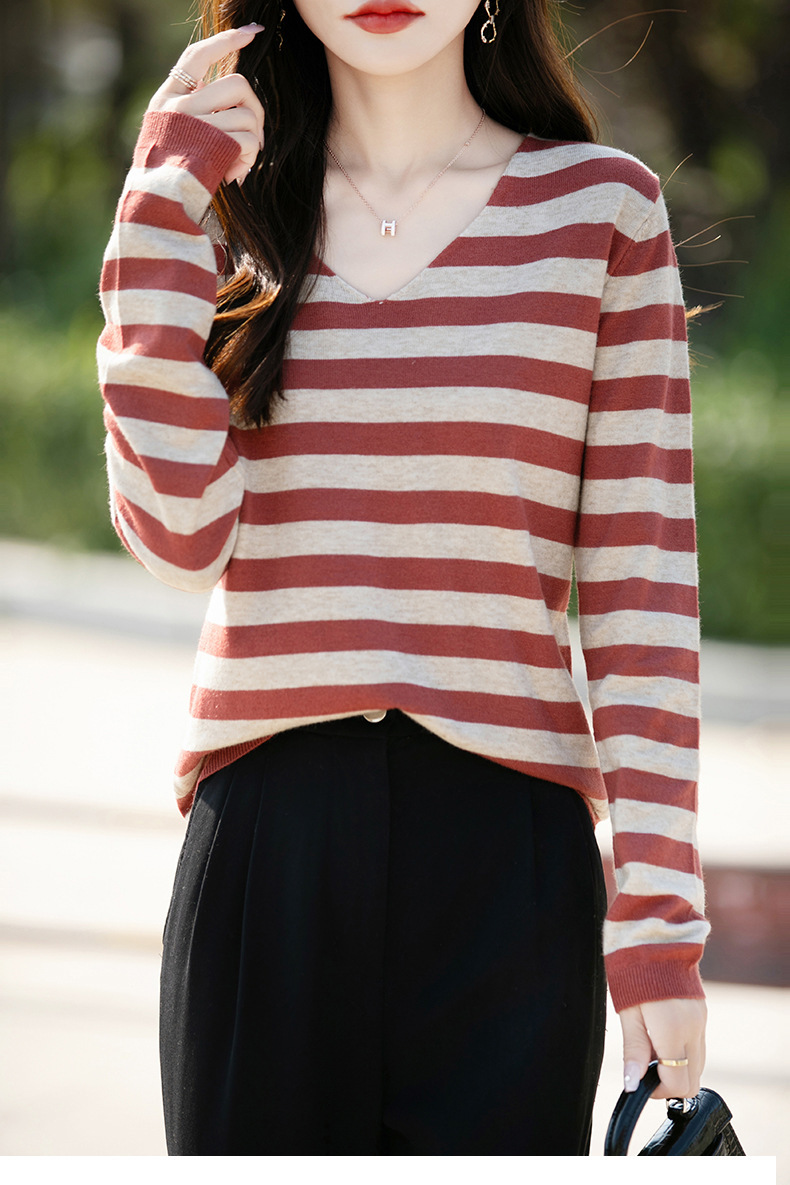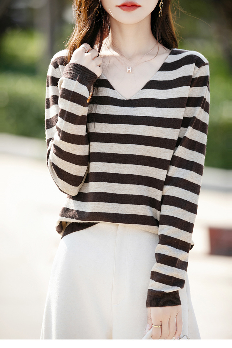 25 년의 봄과 가을 새로운 여성 스웨터 v 칼라 스트라이프 느슨한 바닥 셔츠 대비 패션 스웨터 헤어 세대스토어 가기