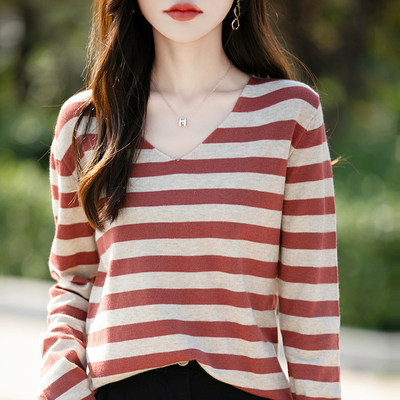 25 년의 봄과 가을 새로운 여성 스웨터 v 칼라 스트라이프 느슨한 바닥 셔츠 대비 패션 스웨터 헤어 세대