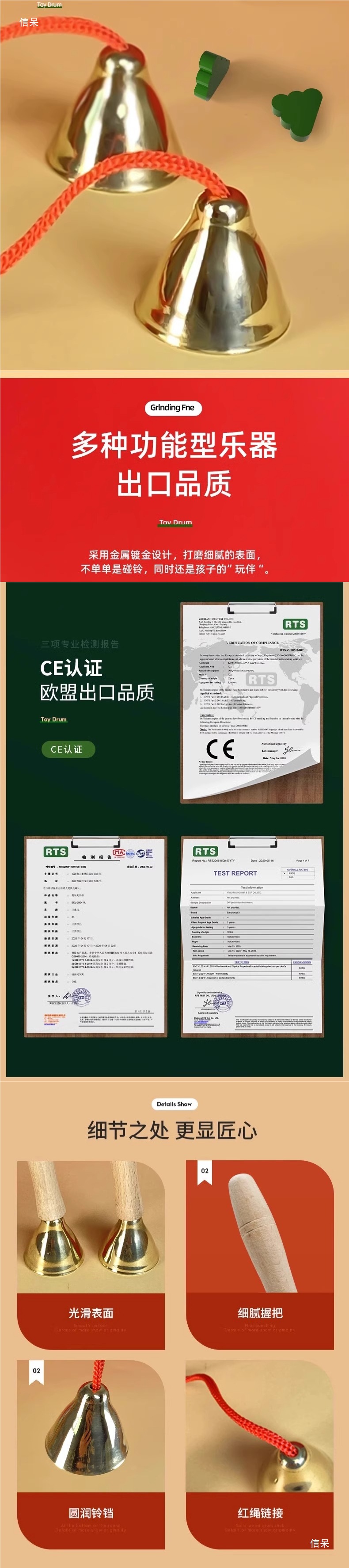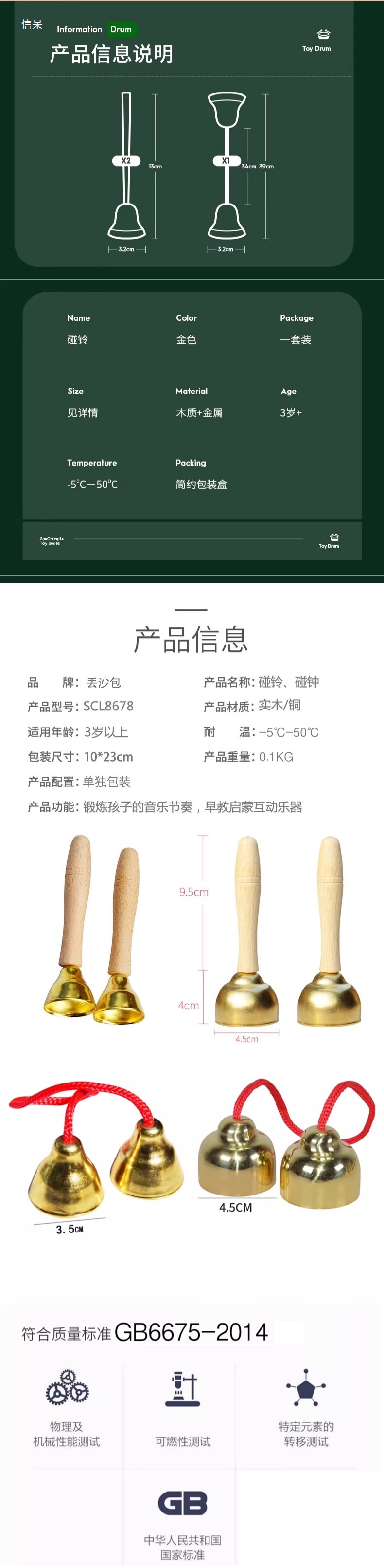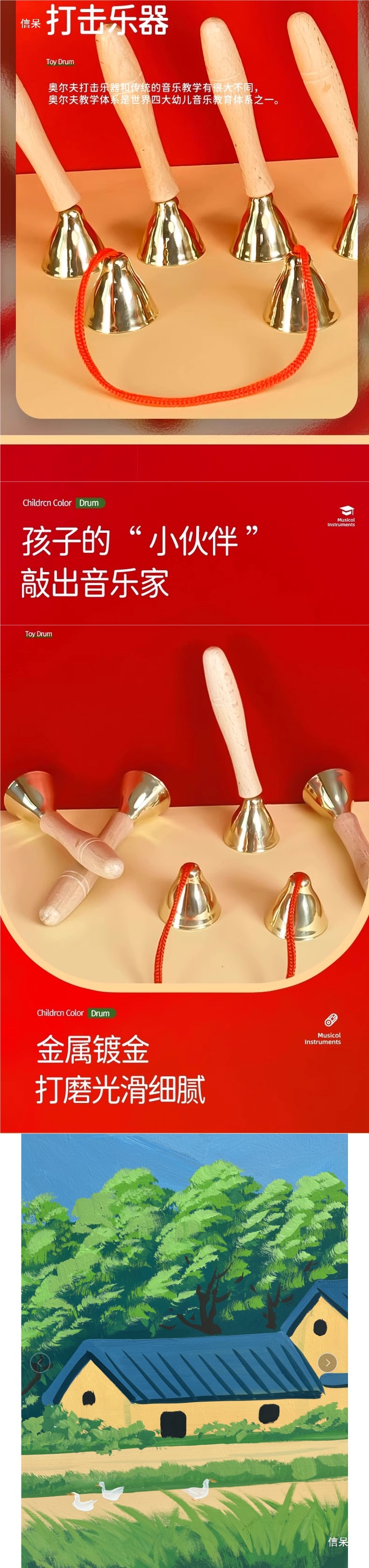초등학생을 위한 벨과 종악기, 1학년, 3학년 음악 수업 교구, 나무 손잡이, 붉은 밧줄, 구리 도금 마우스 벨스토어 가기