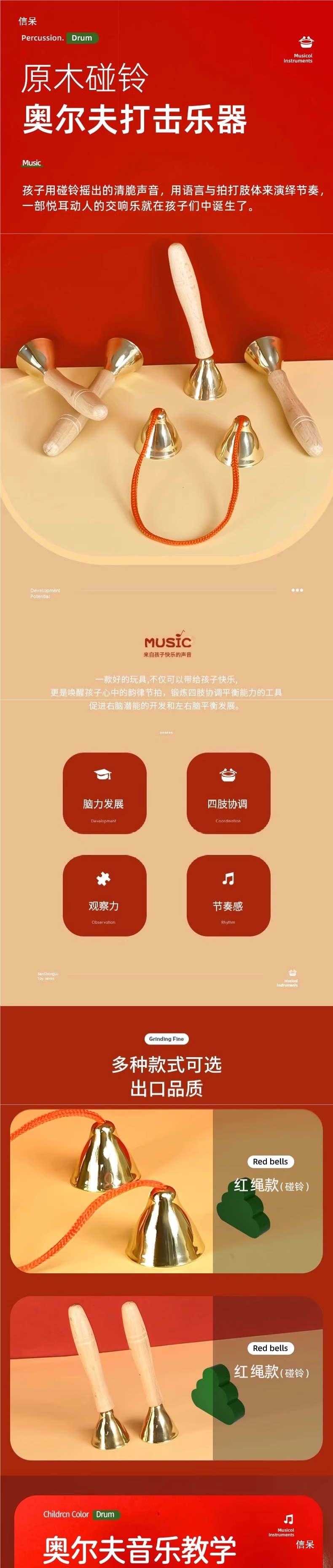초등학생을 위한 벨과 종악기, 1학년, 3학년 음악 수업 교구, 나무 손잡이, 붉은 밧줄, 구리 도금 마우스 벨