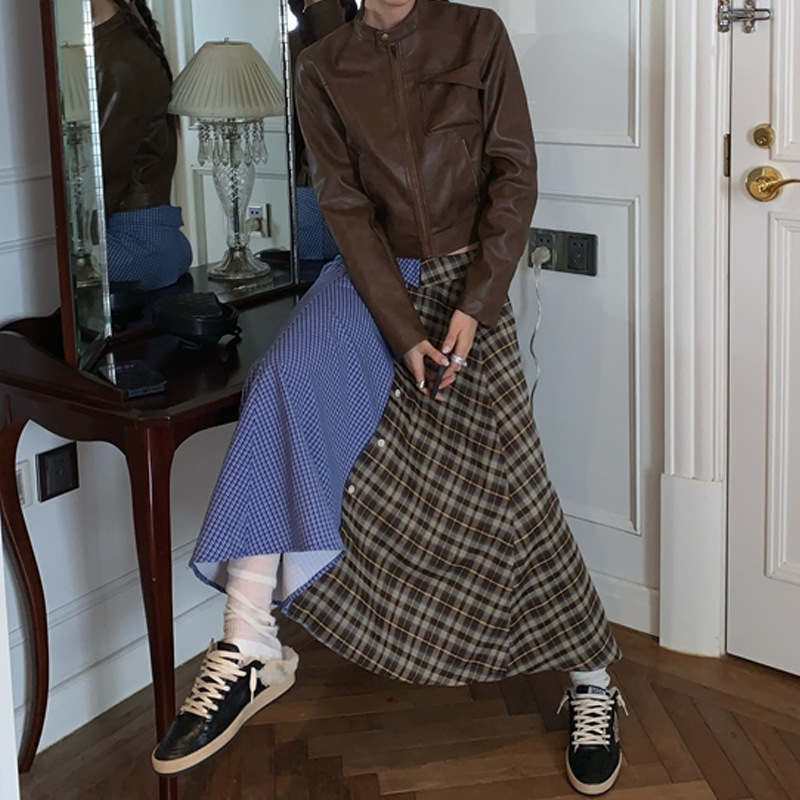 히비스커스는 복고풍 패딩 가죽 셔츠 체크 무늬 스티칭 스커트 여성과 함께 je * nie 착용에 너무 능숙합니다.스토어 가기