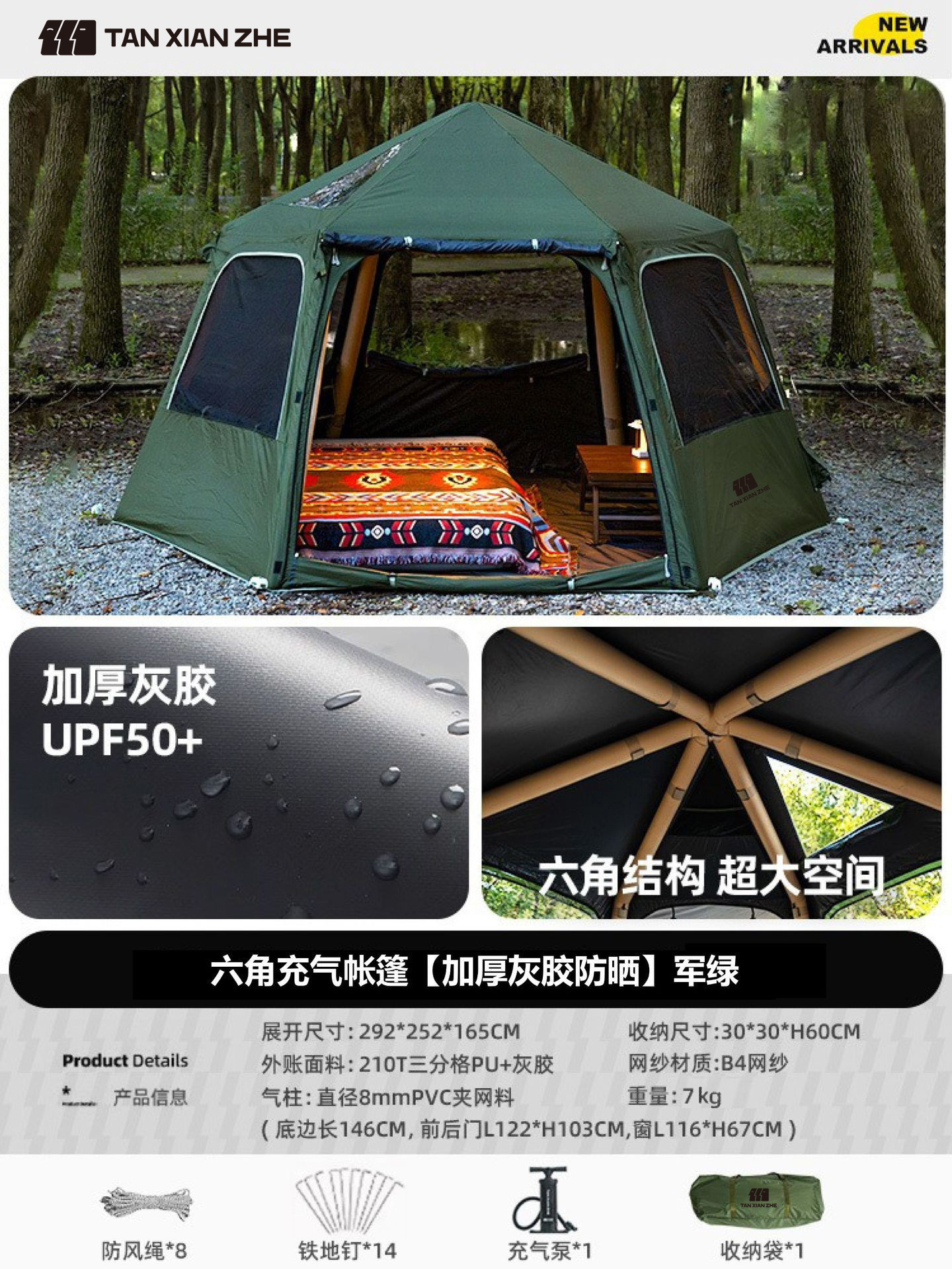 • [회색 접착제 코팅 자외선 차단 업그레이드] 밀리터리 그린 육각형 풍선 텐트 [2194D]