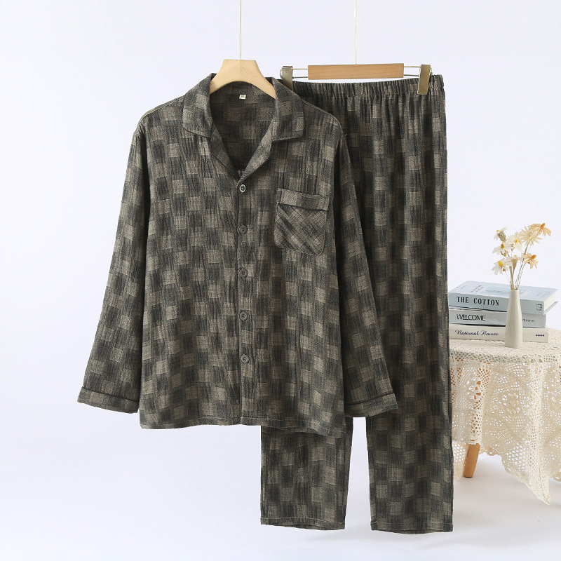 남성용 잠옷 원사 염색 더블 레이어 퓨어 코튼 비 프린트 일본식 격자 무늬 홈 착용 긴팔 바지 봄 여름 가을 얇은 홈 착용