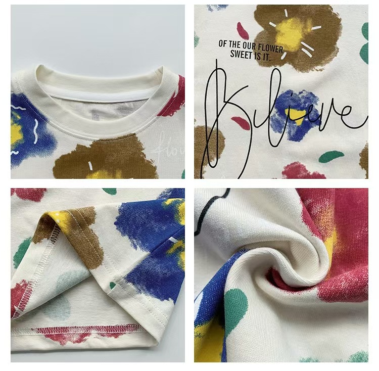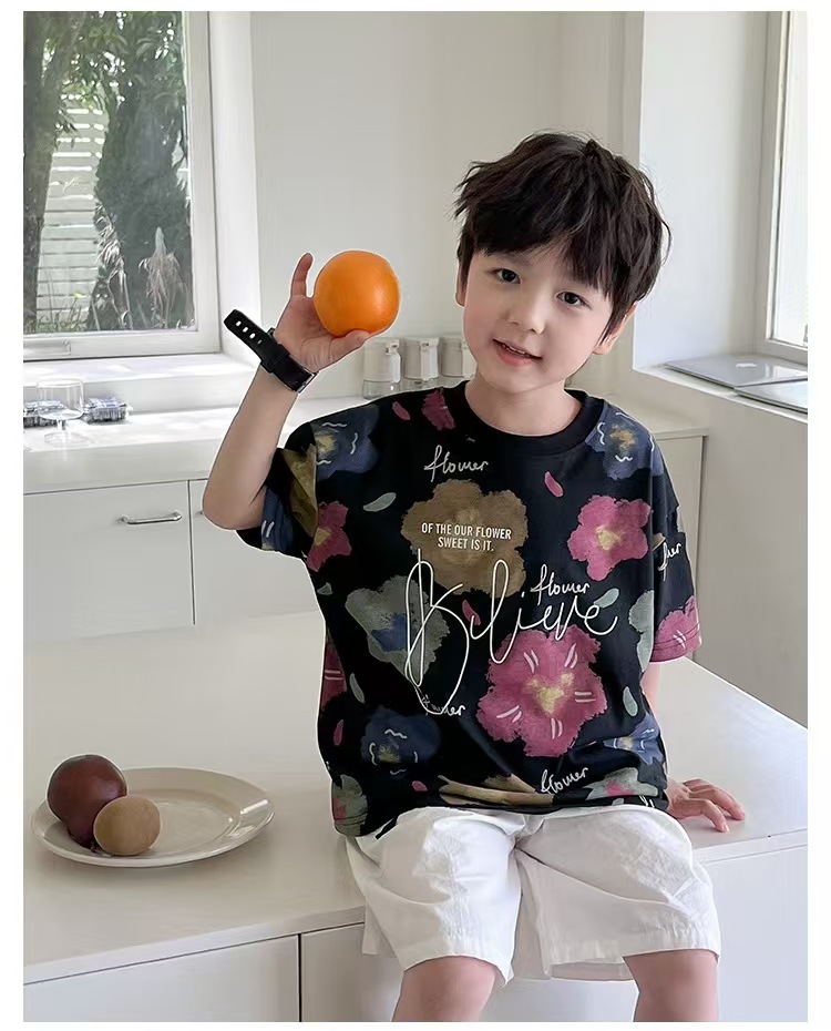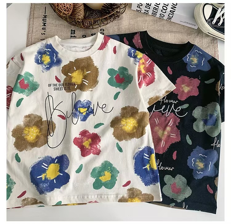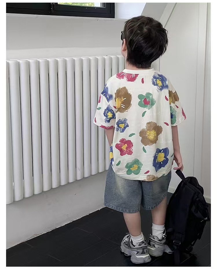 2025 반팔 여름 새로운 어린이 패션 브랜드 반팔 크루 넥 심플 루즈 티셔츠 풀 프린트 반팔스토어 가기