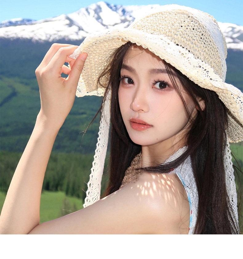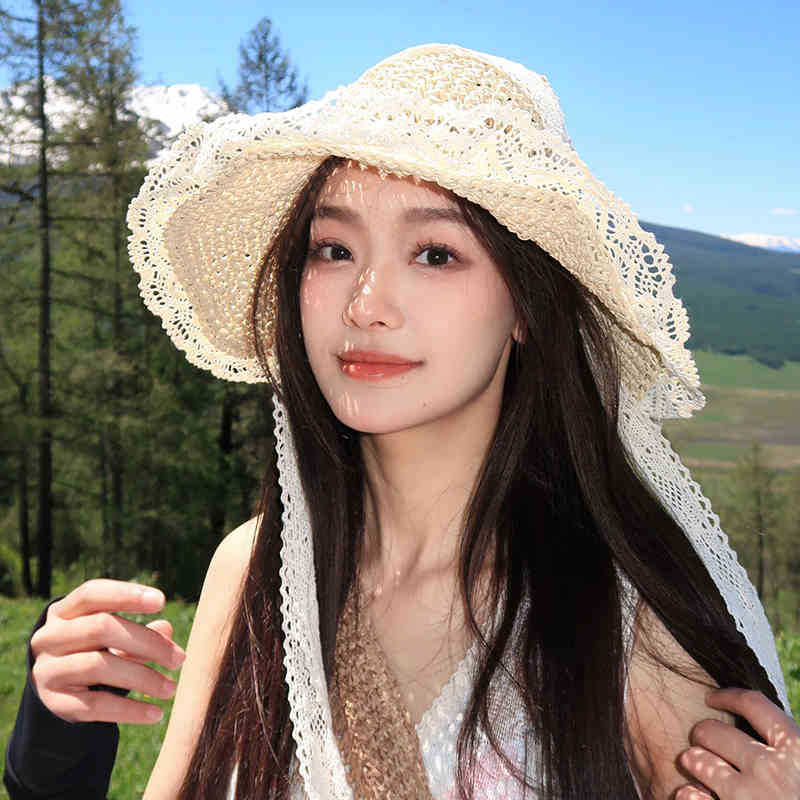 INS 스타일 여름 레이스 리본 넓은 챙 햇빛 가리개 밀짚모자 여성용 2025 신상 해변 휴가용 자외선 차단 모자