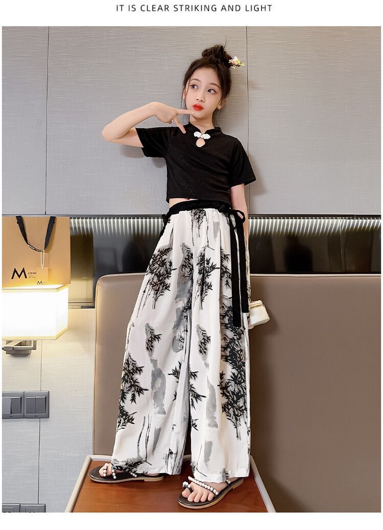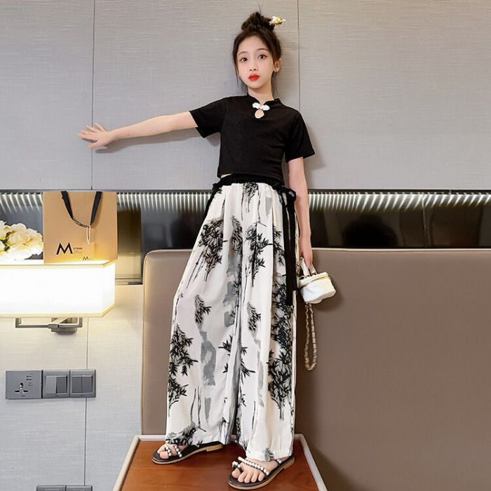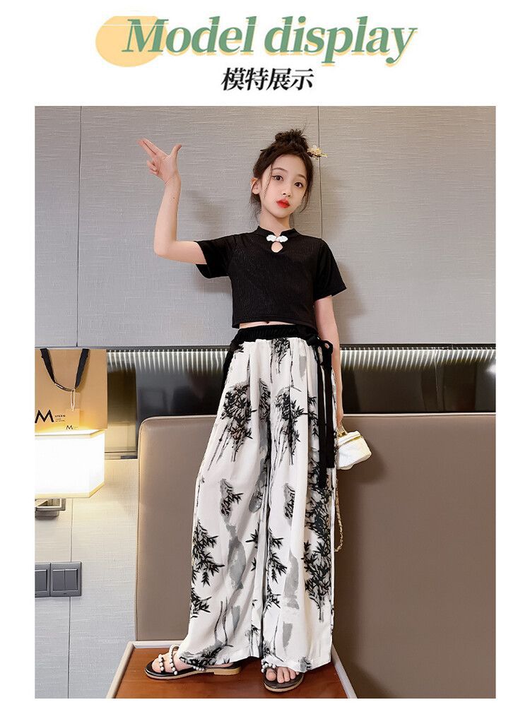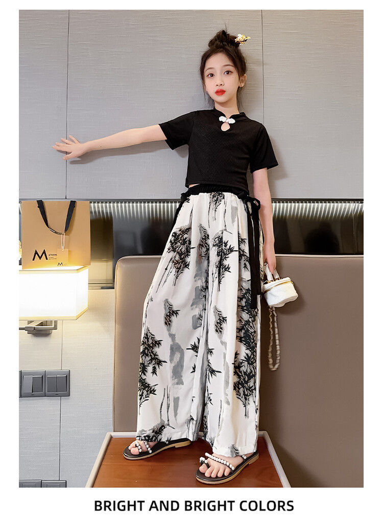 여자 중국 스타일 잉크 그림 넓은 다리 바지 세트 2025 새로운 여름 어린이 스트레이트 바지 투피스 세트