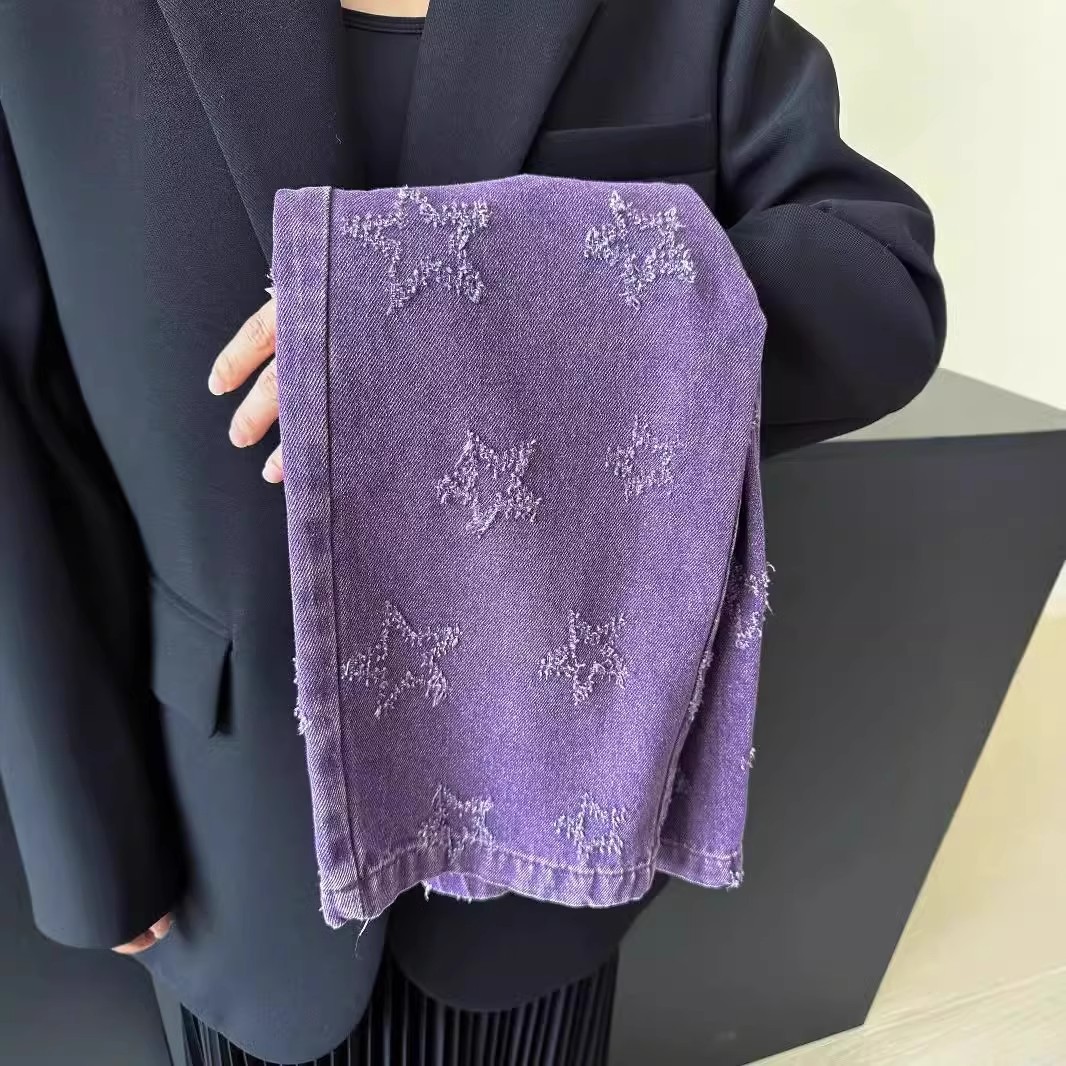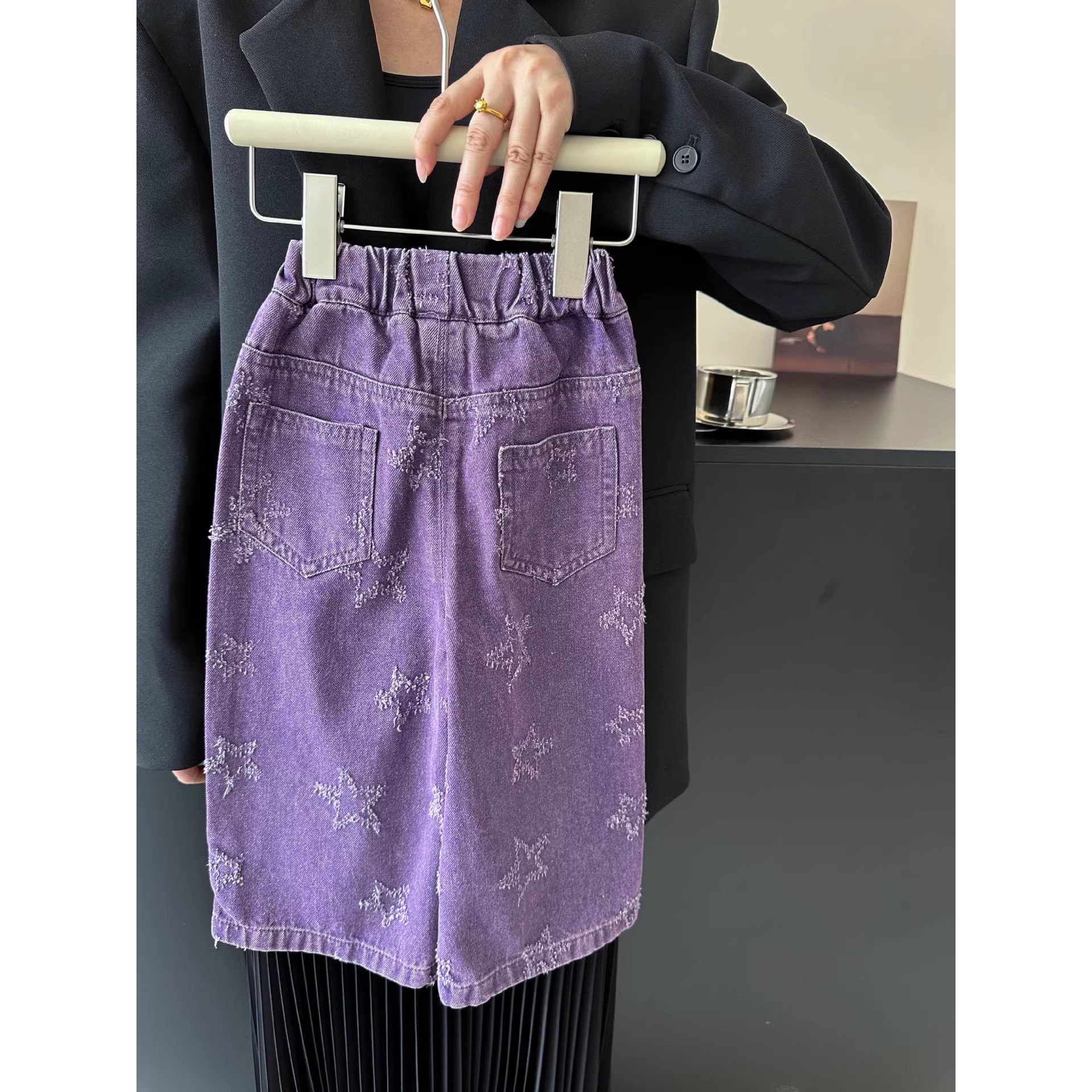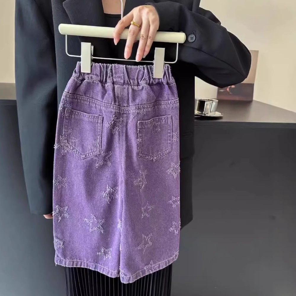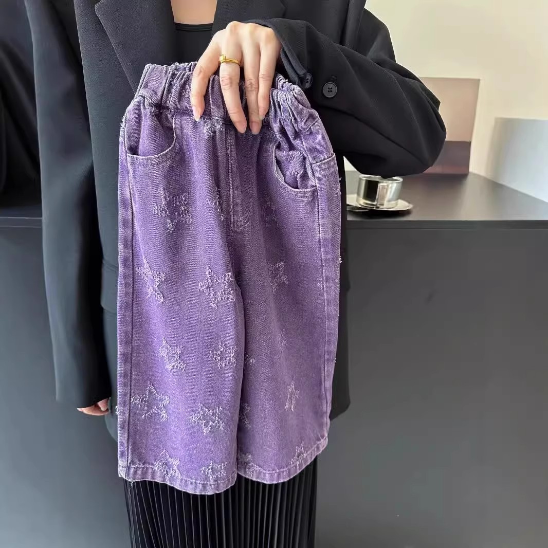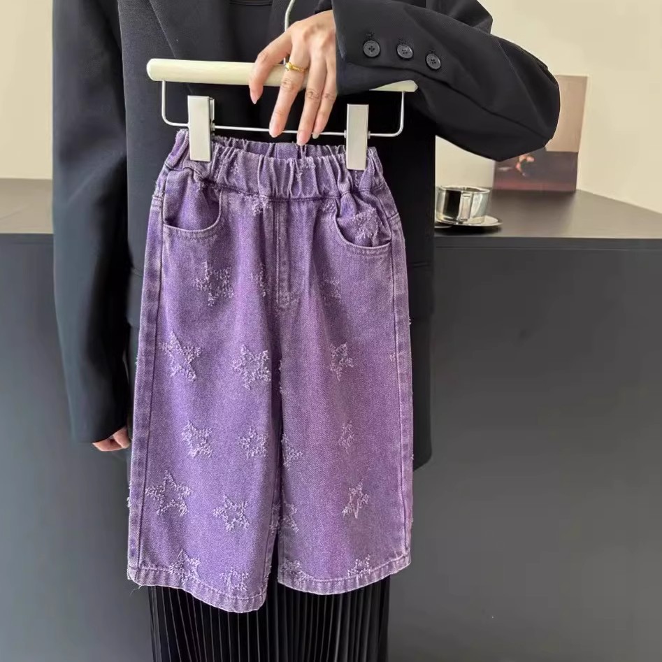 어린이 봄 가을 청바지 2025 여성 아기의 새로운 한국 스타일 유행 보라색 다섯개 별 크로 셰 스트레이트 바지스토어 가기