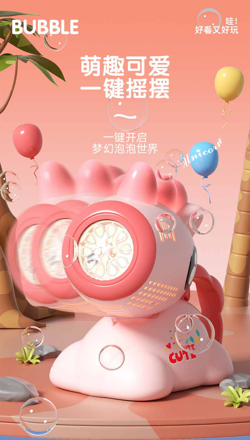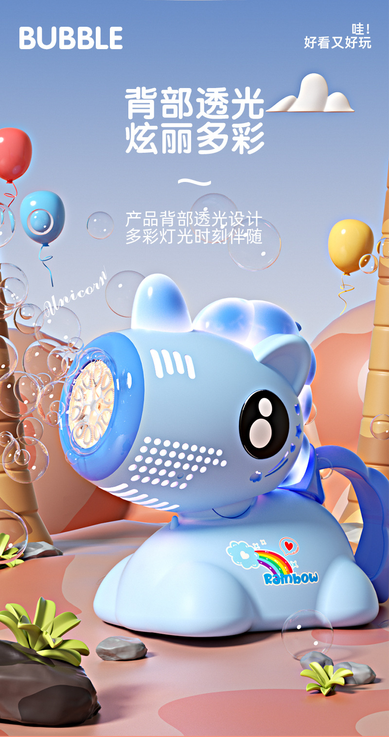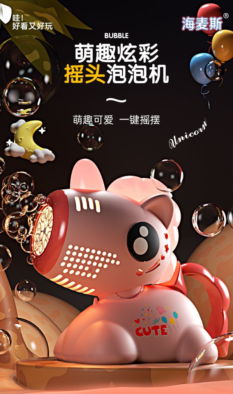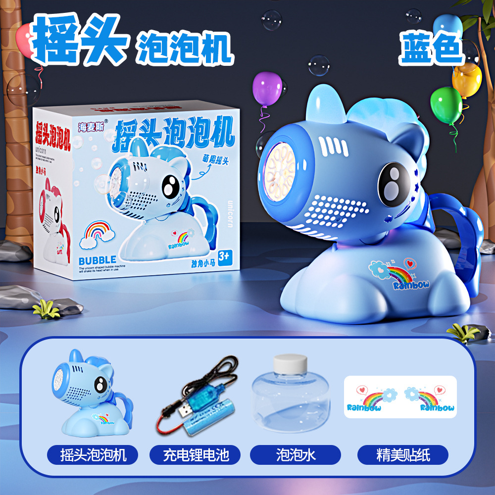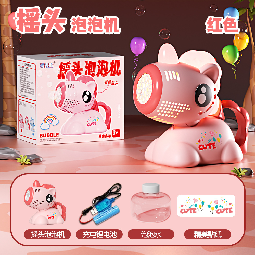새로운 전기 흔들리는 머리 조랑말 거품 기계 가벼운 어린이 자동 액체 타이트 만화 부는 거품 장난감 국경스토어 가기