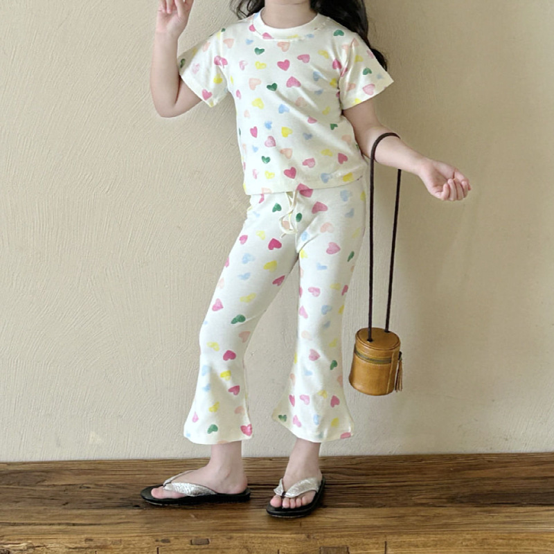 소녀의 화려한 사랑 패션 세트 여름 소녀의 슬림 핏 귀여운 반팔 꽃 바지 스트레치 투피스 세트
