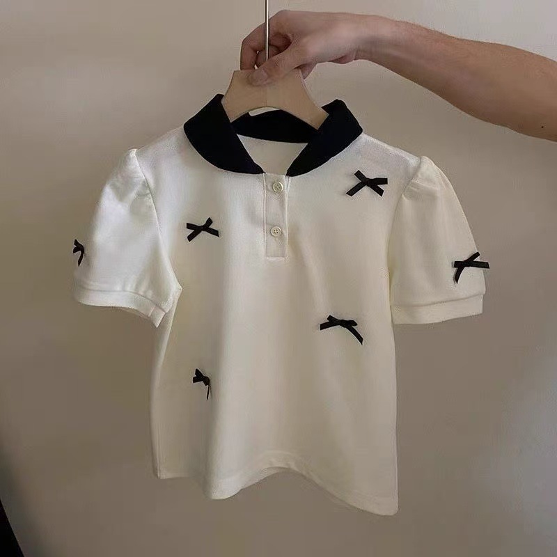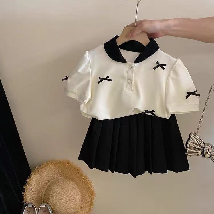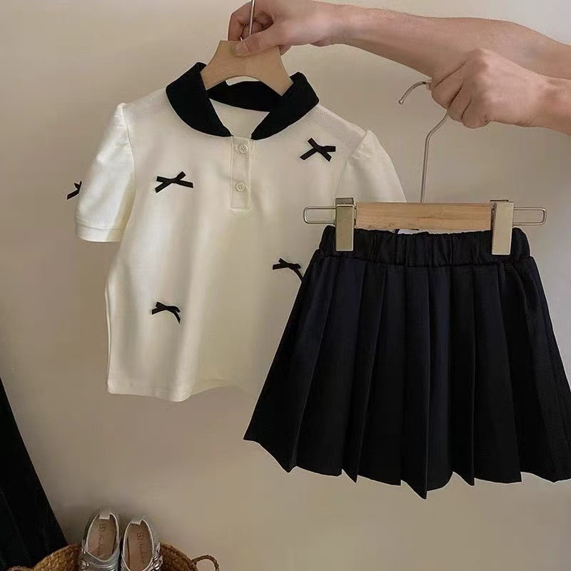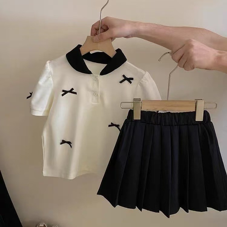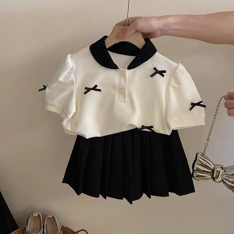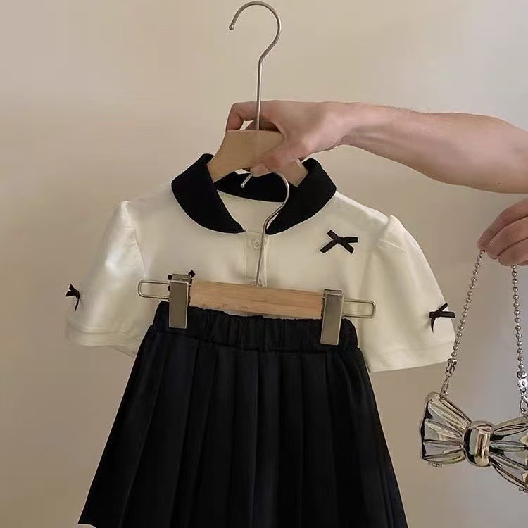 어린이 착용 아기 소녀의 아카데미 스타일 세트 2025 여름 원피스 소녀의 활 반팔 최고 주름 치마 투피스 세트 패션