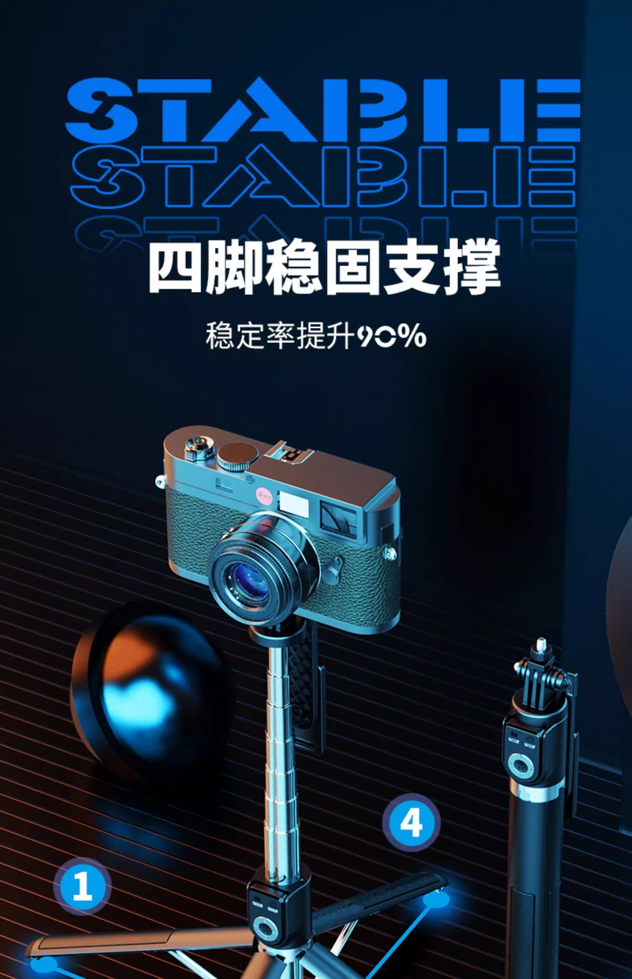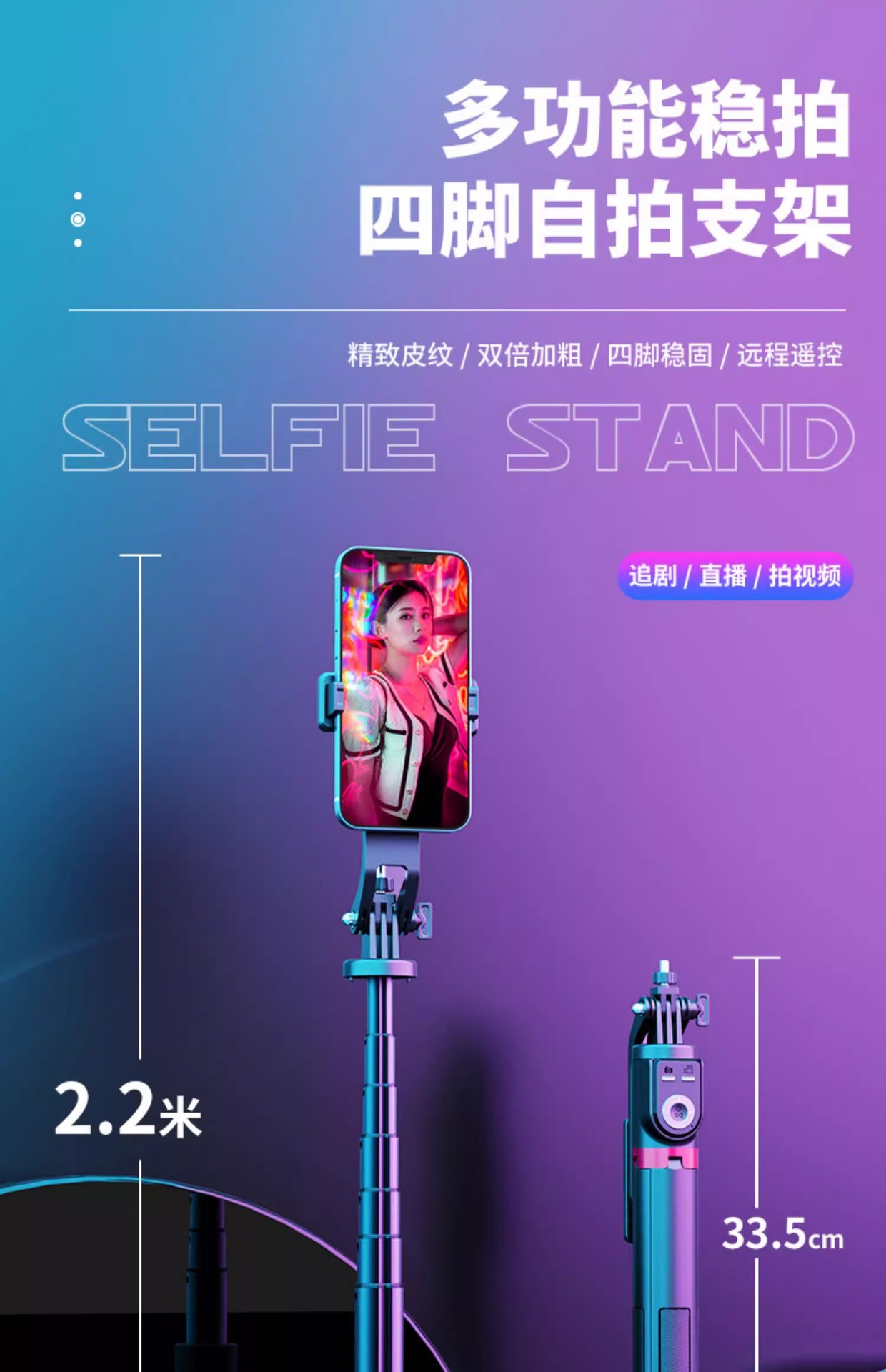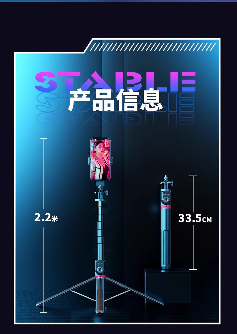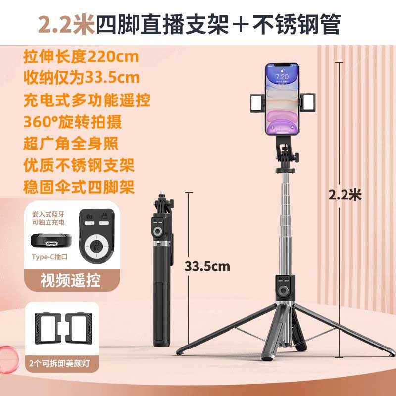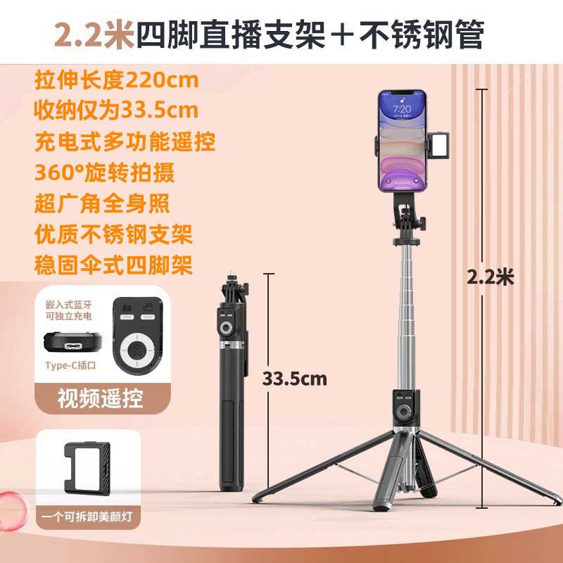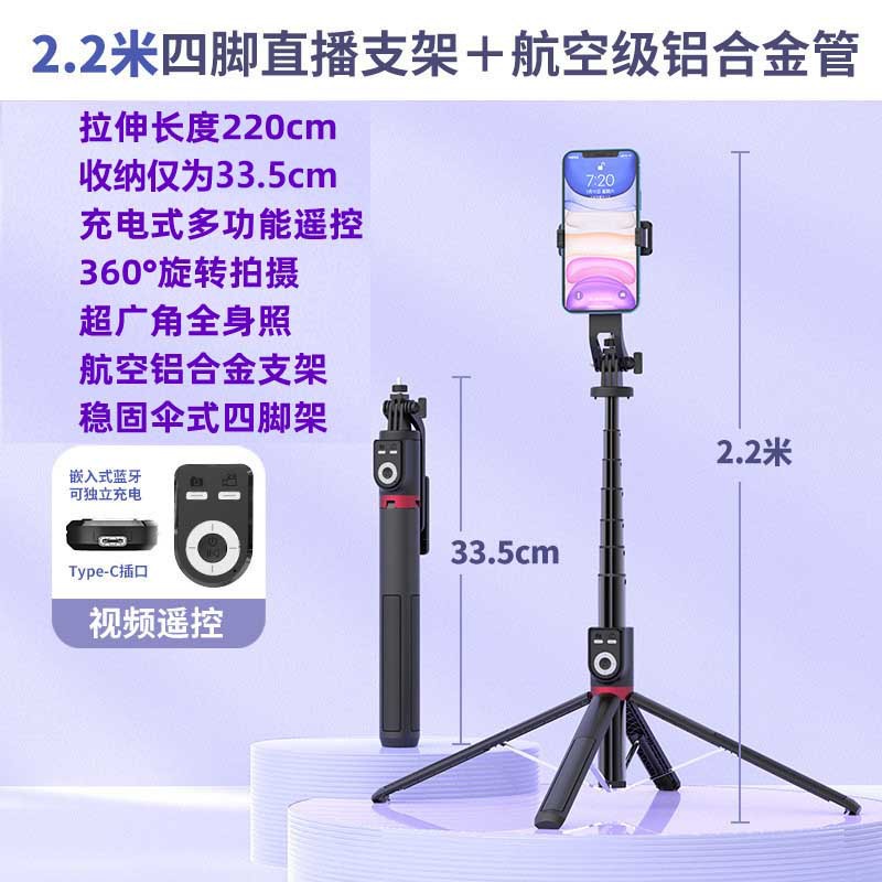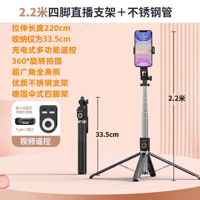 P225TK 알루미늄 합금 블루투스 셀카 스틱 2.2 m 유니버설 트레몰로 원격 제어 쿼드 라이브 플로어 스탠드