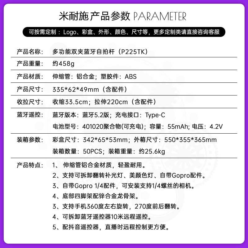 • P225TK-F1【 2.2m + Douyin 리모컨 + 알루미늄 합금 튜브 + 미러 라이트 1개 】