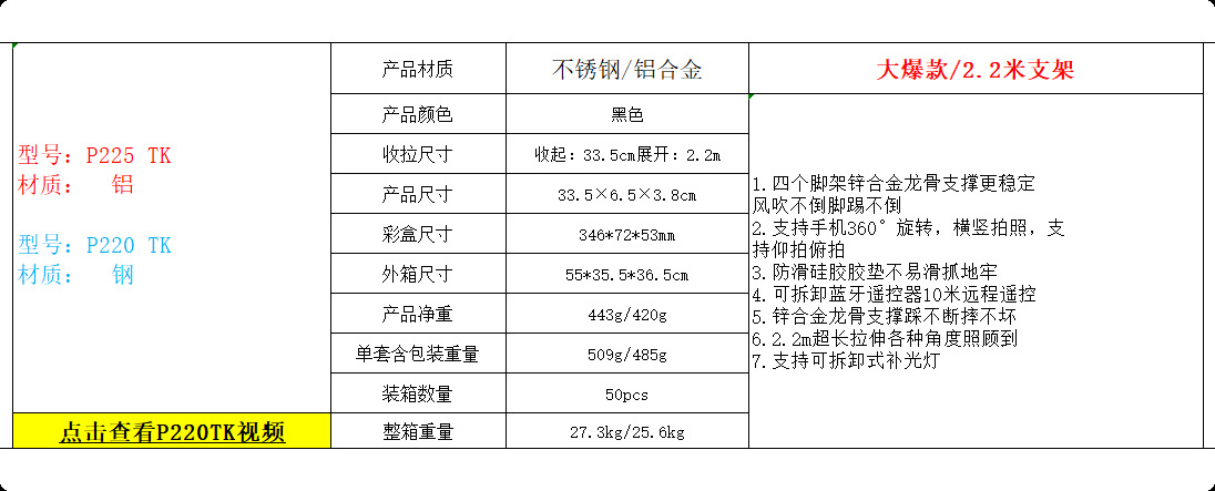 • P225TK【 2.2m + Douyin 리모컨 + 알루미늄 합금 튜브】
