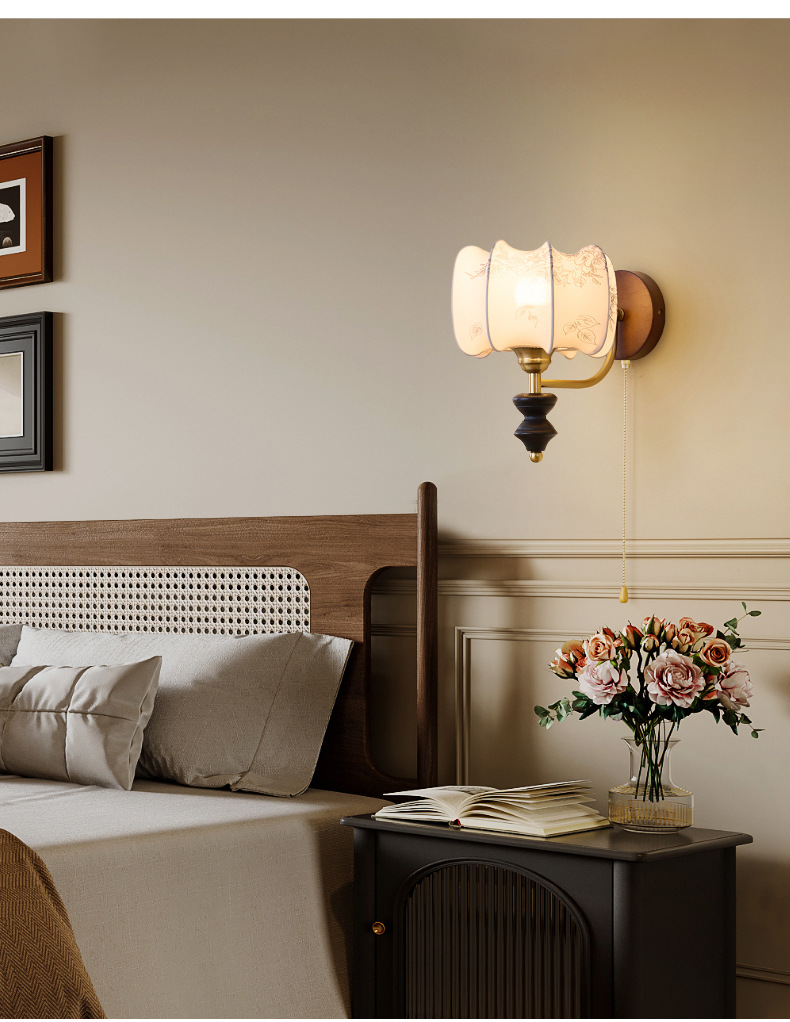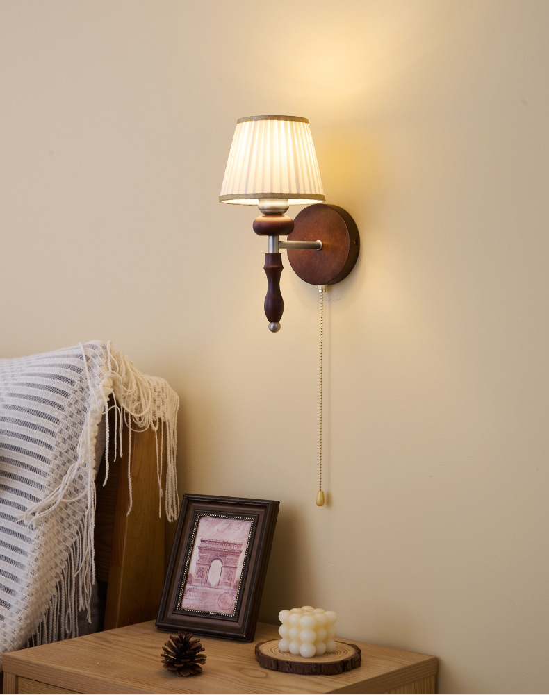 프랑스 중세 벽 램프 미국 복고풍 단단한 나무 고급 침실 침대 옆 램프 케이블 스위치 거실 배경 벽 램프