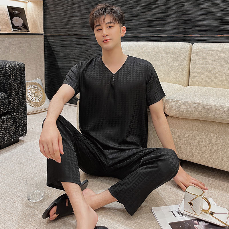 도매 봄과 여름 새로운 아이스 실크 파자마 남성 반팔 바지 얇은 실크 홈 의류 세트 머리카락 세대스토어 가기