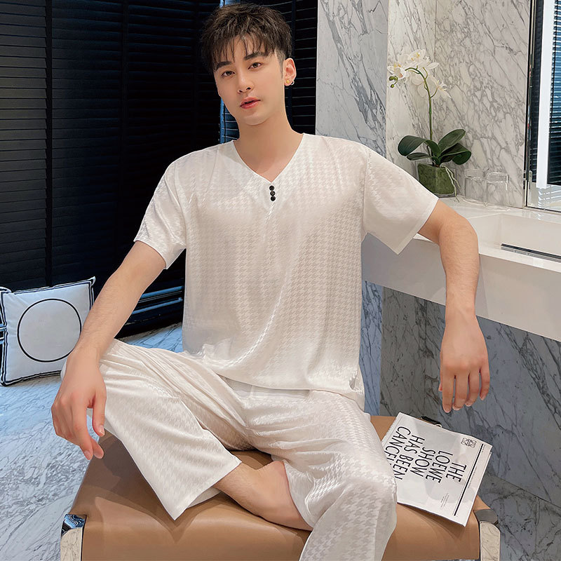 도매 봄과 여름 새로운 아이스 실크 파자마 남성 반팔 바지 얇은 실크 홈 의류 세트 머리카락 세대