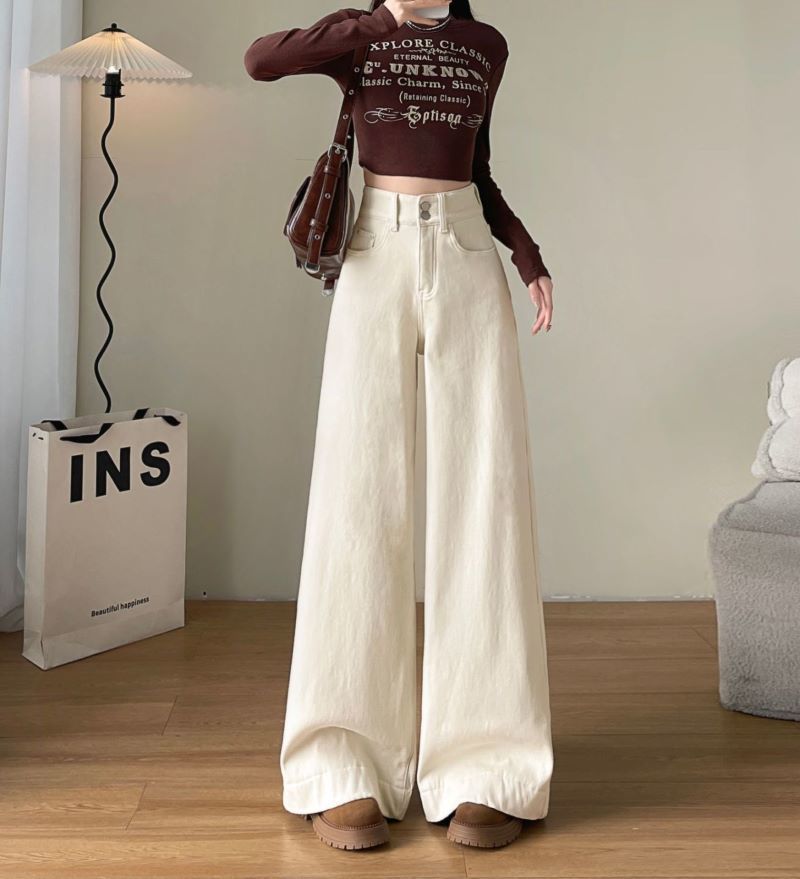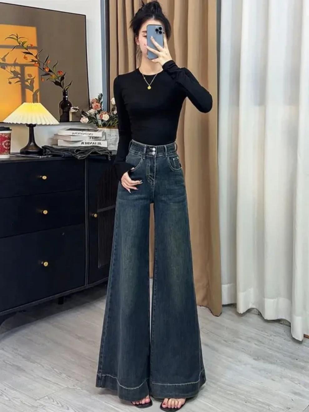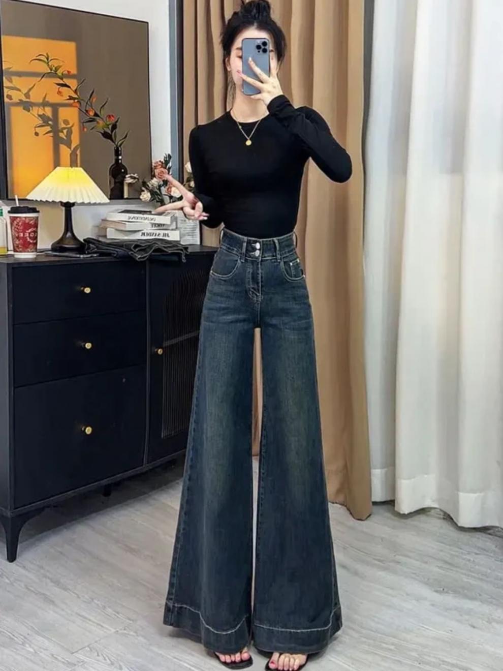와이드 레그 청바지 여성 봄과 여름 2025 새로운 온라인 연예인 리얼 샷 오리지널 올 매치 슬림 핏 루즈 플라 드 팬츠