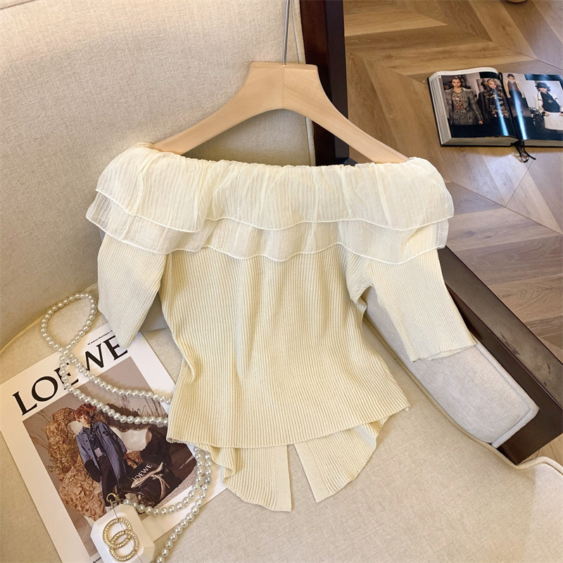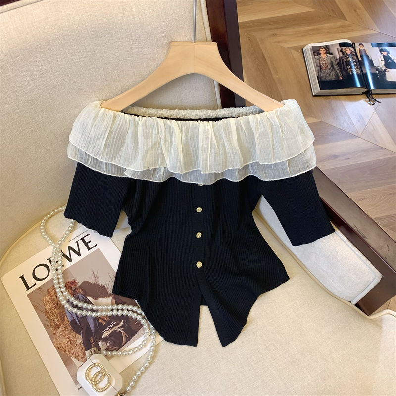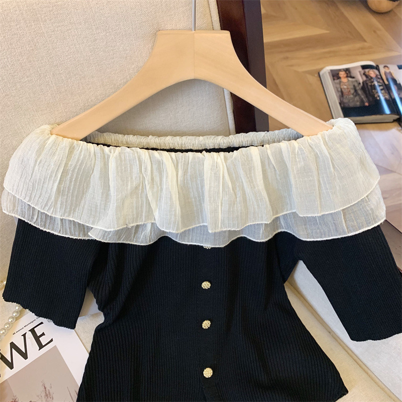 프렌치 컬러 대비 러플 반팔 어깨 셔츠 여성 여름 디자인 센스 니쉬 독특한 세련된 아름다운 탑