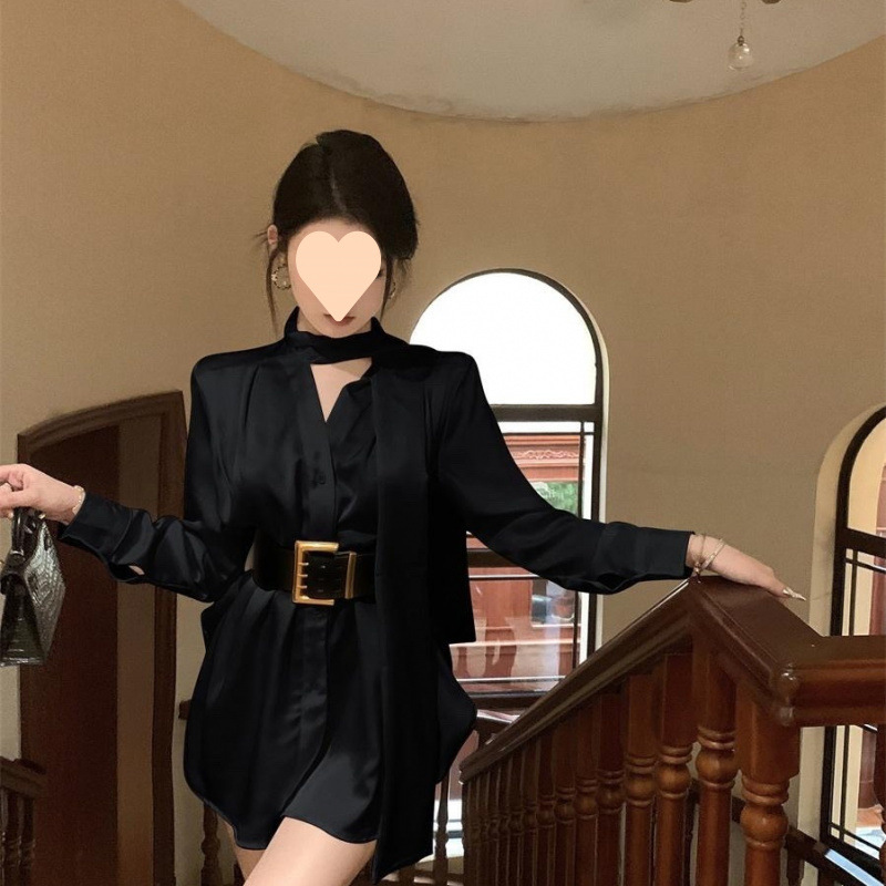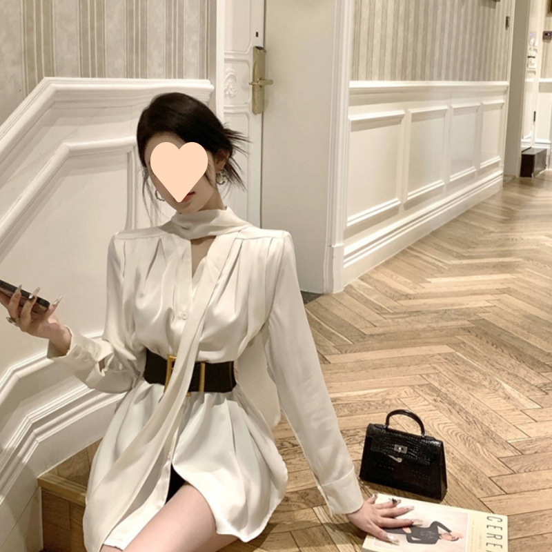 프랑스 원피스 우아한 사교계 하이 엔드 여신 스타일 하이 엔드 사틴 칼라 리본 웨이스트 셔츠 원피스스토어 가기