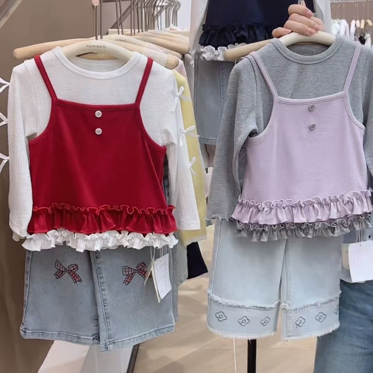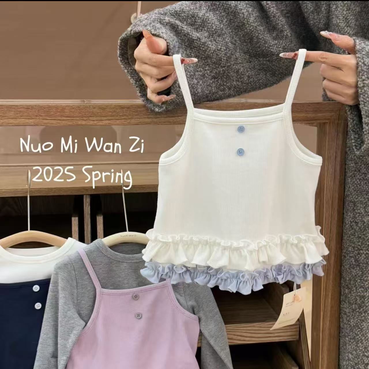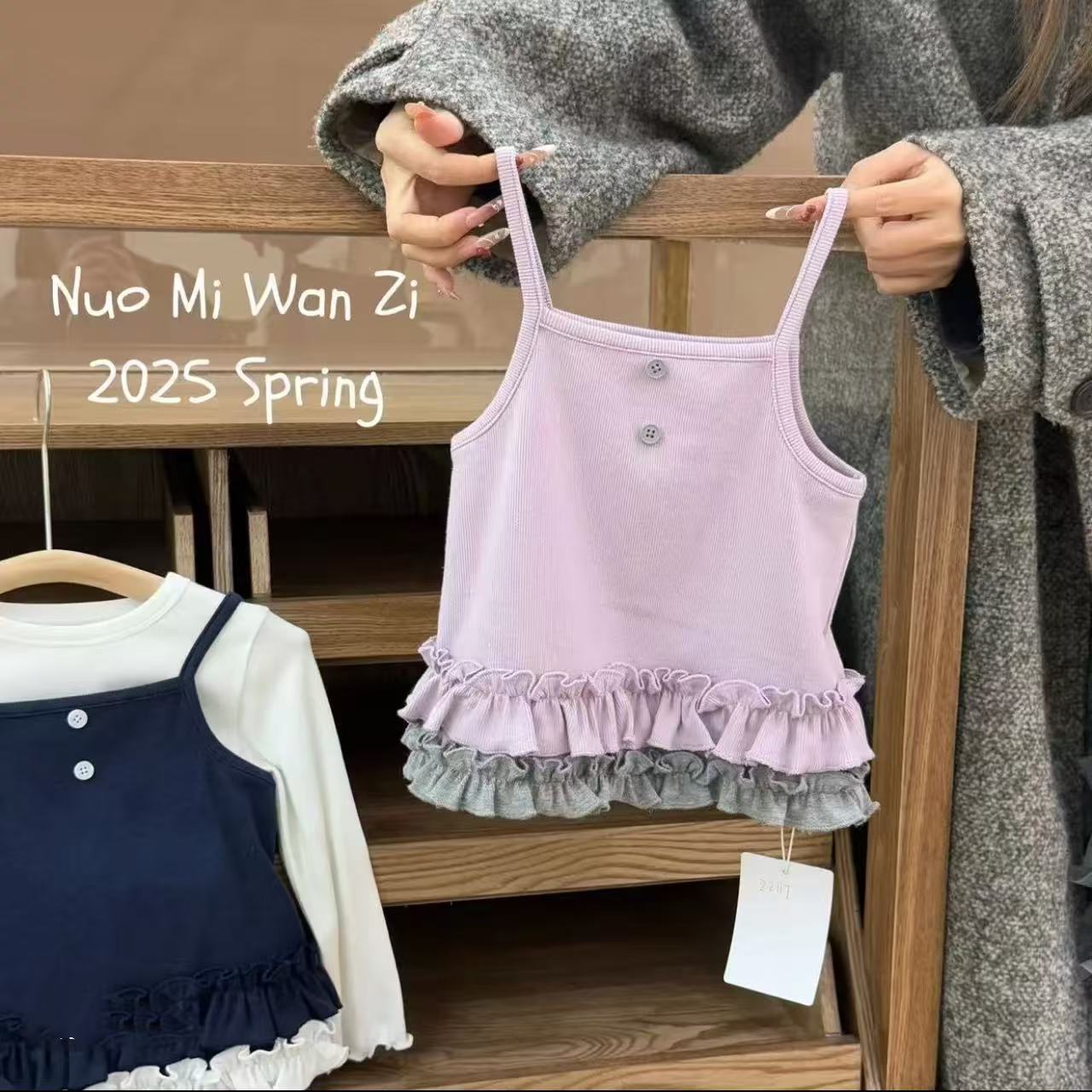 소녀의 봄과 여름 2025 새로운 한국 스타일 소녀의 세련된 슬링 긴 소매베이스 셔츠 레이스 슬링 조끼 T스토어 가기