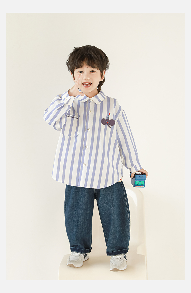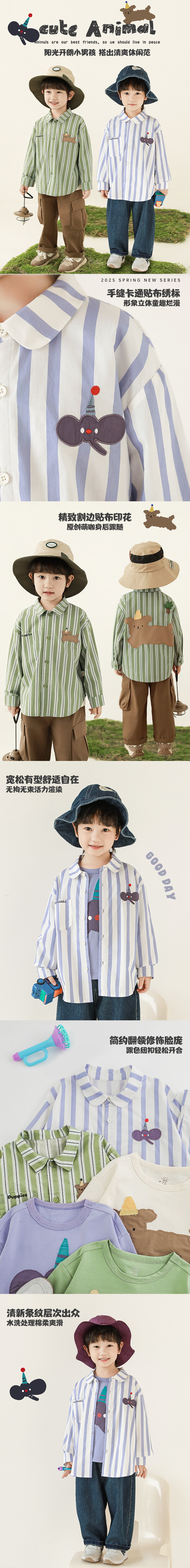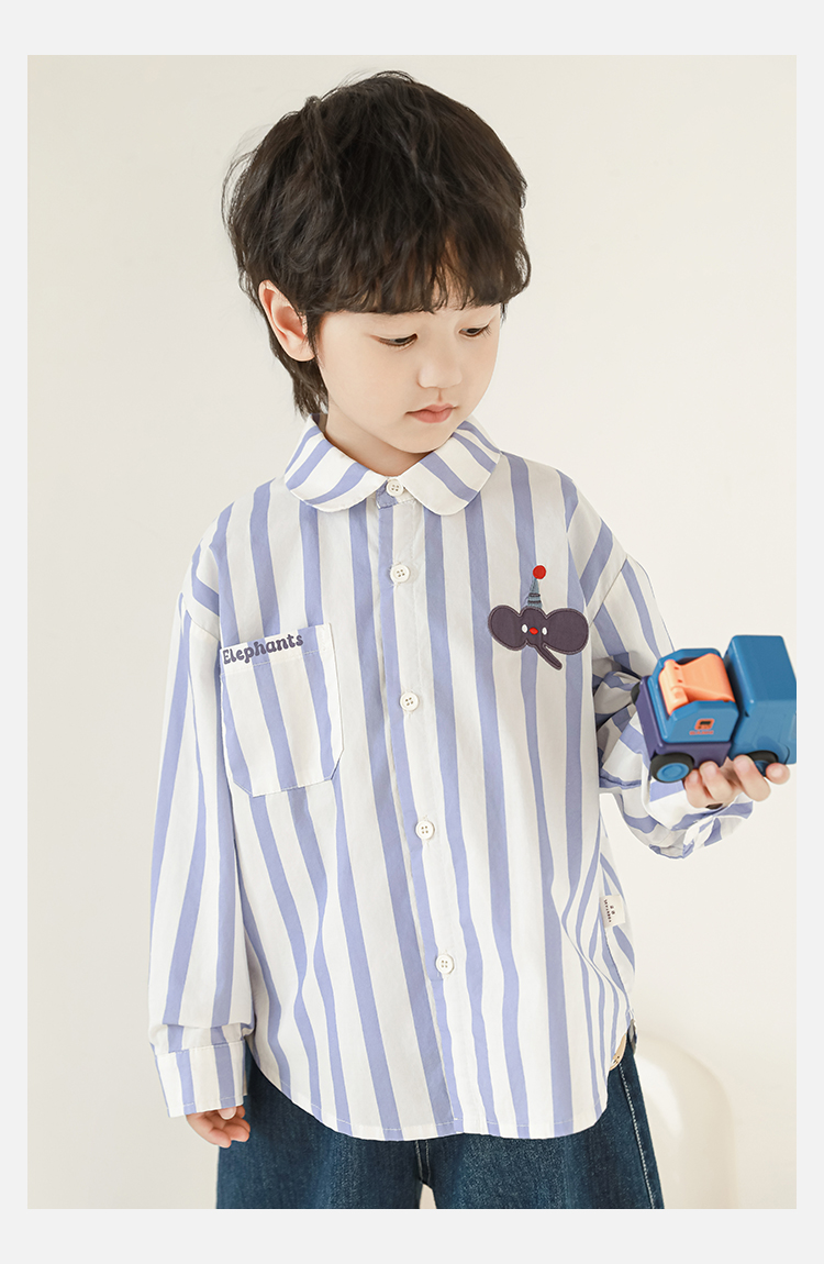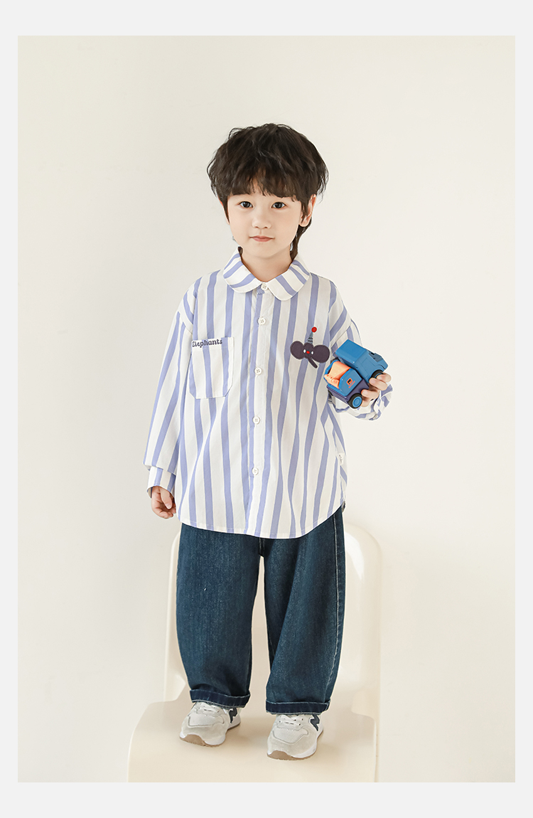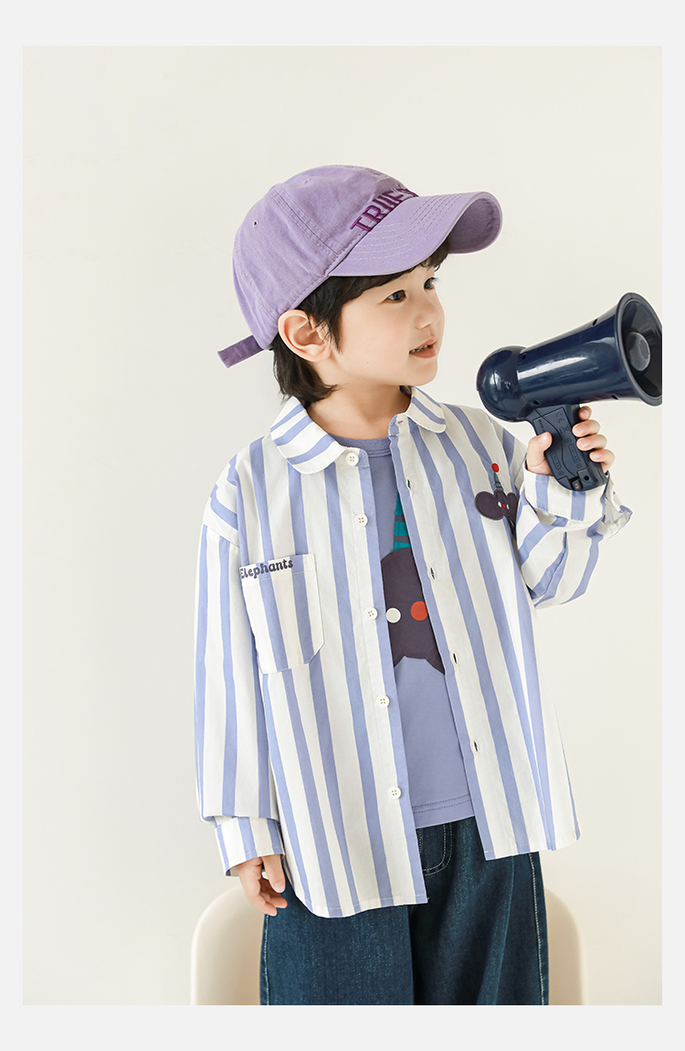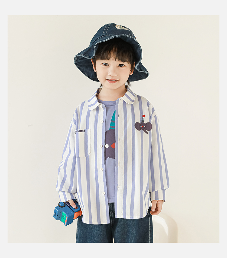 Wuri Boys의 2025 년 봄 새 긴 소매 옷깃 줄무늬 셔츠 캐주얼 느슨한 올매치 어린이 셔츠스토어 가기
