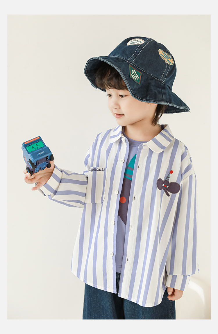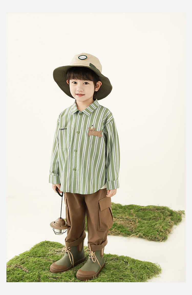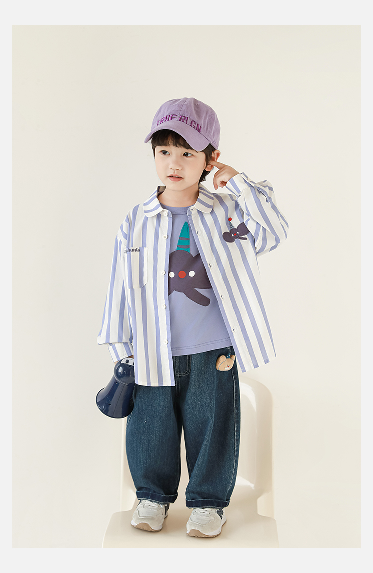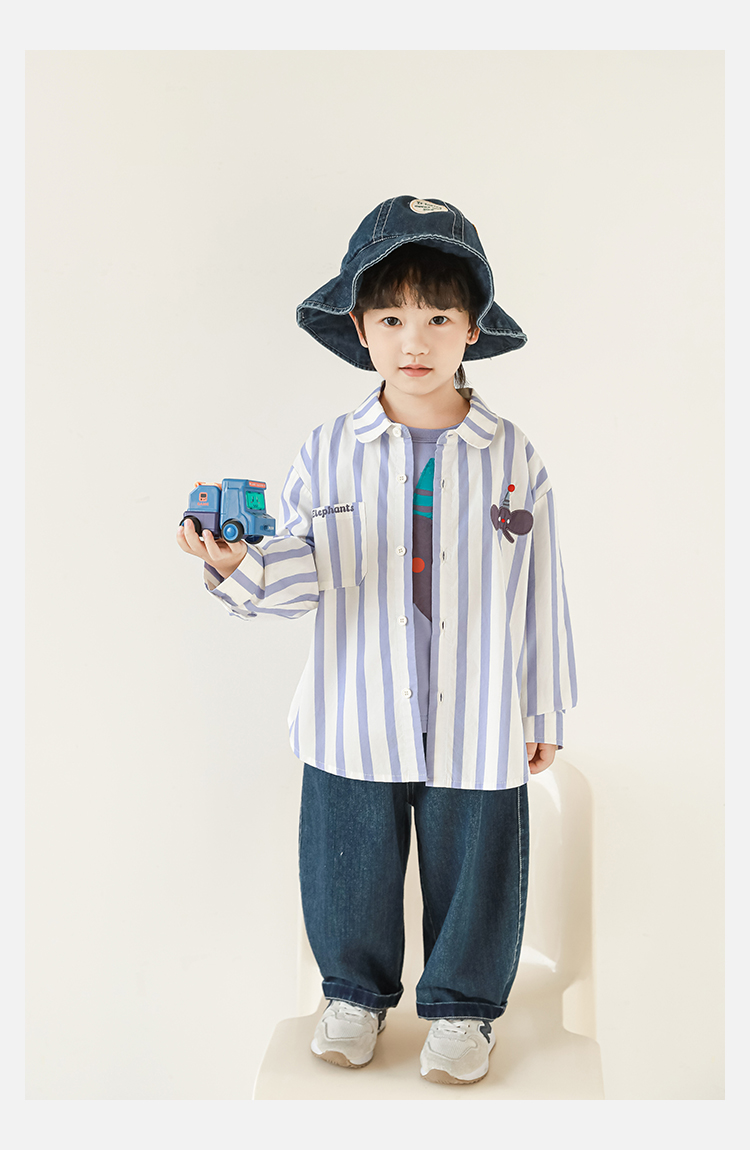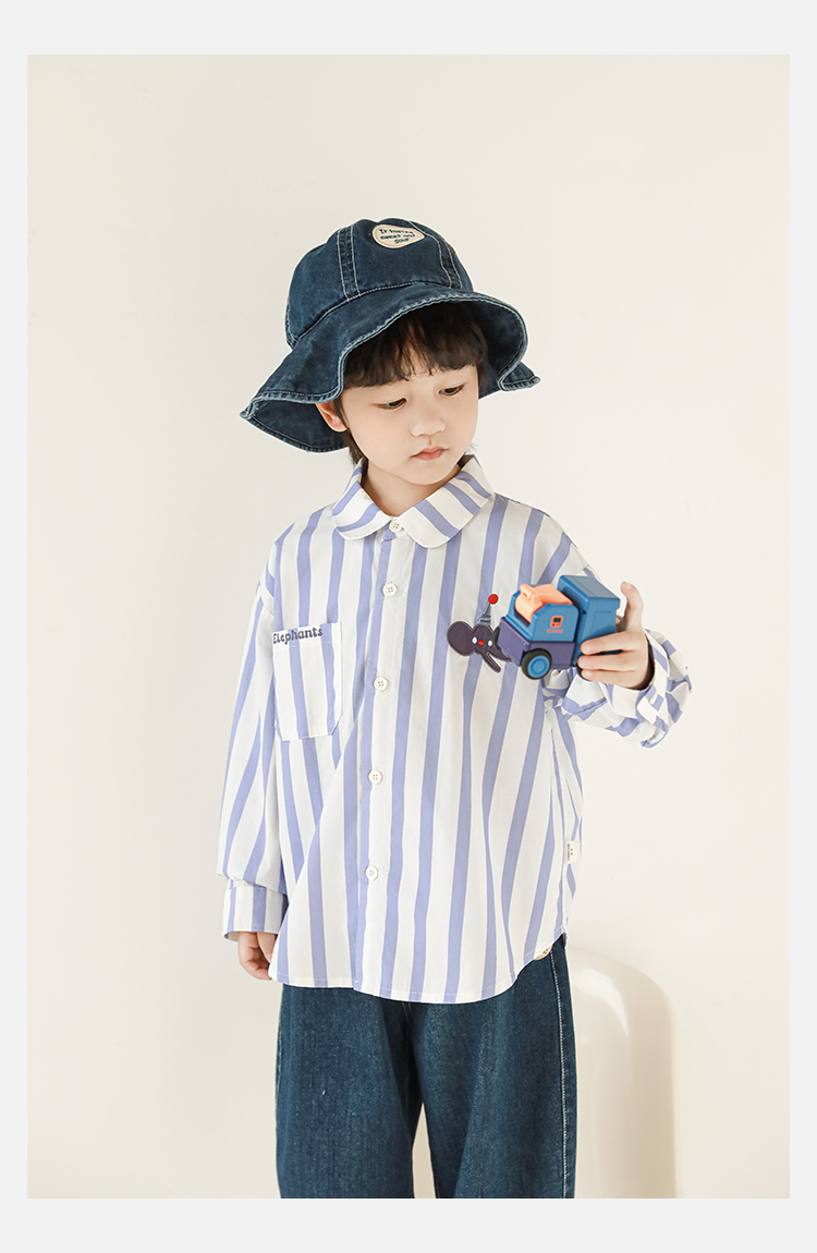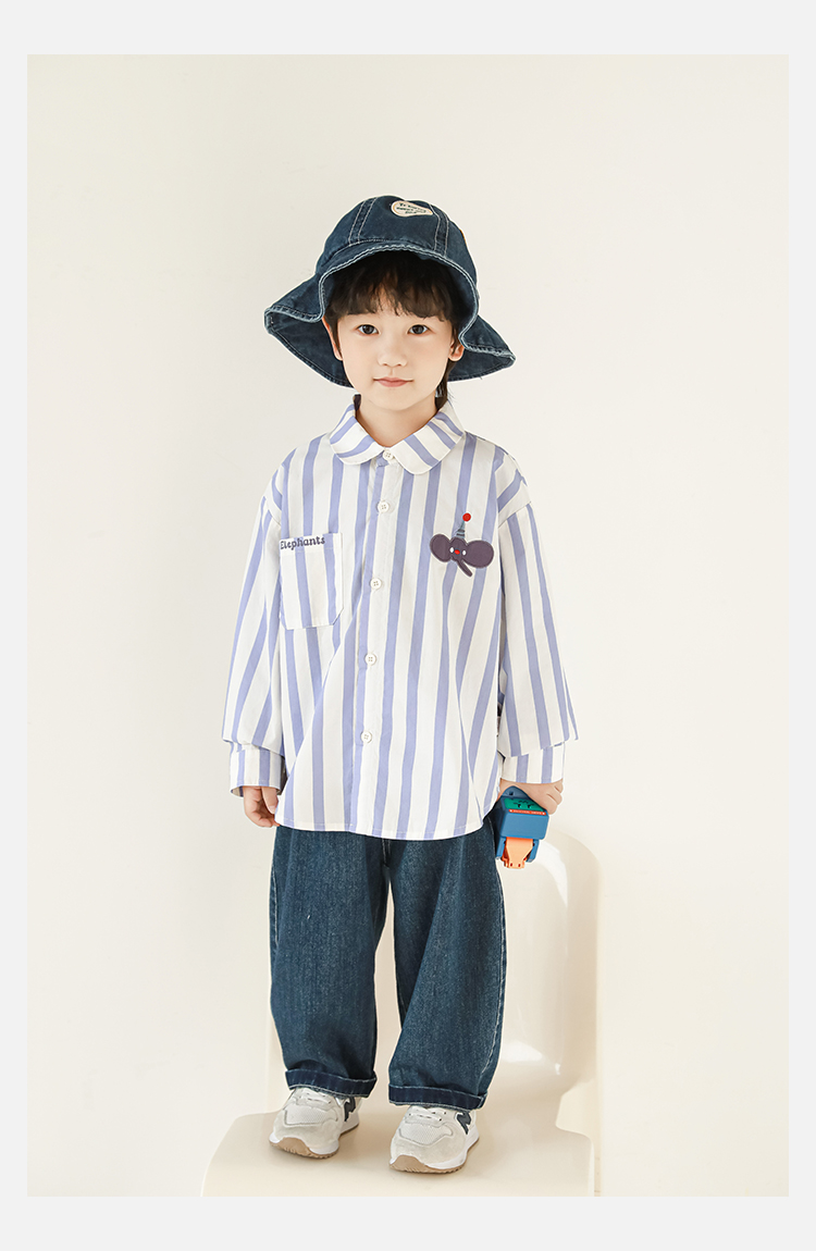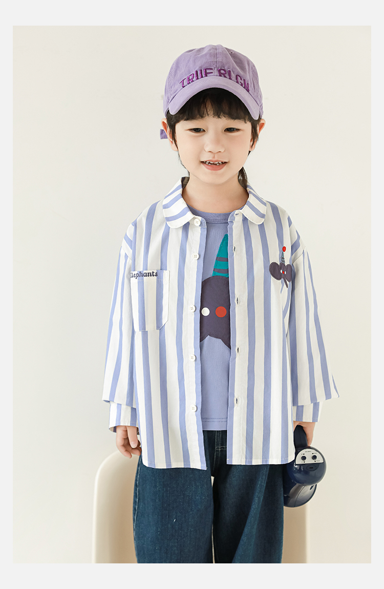 Wuri Boys의 2025 년 봄 새 긴 소매 옷깃 줄무늬 셔츠 캐주얼 느슨한 올매치 어린이 셔츠스토어 가기