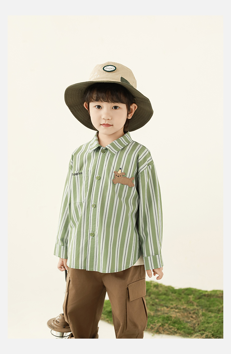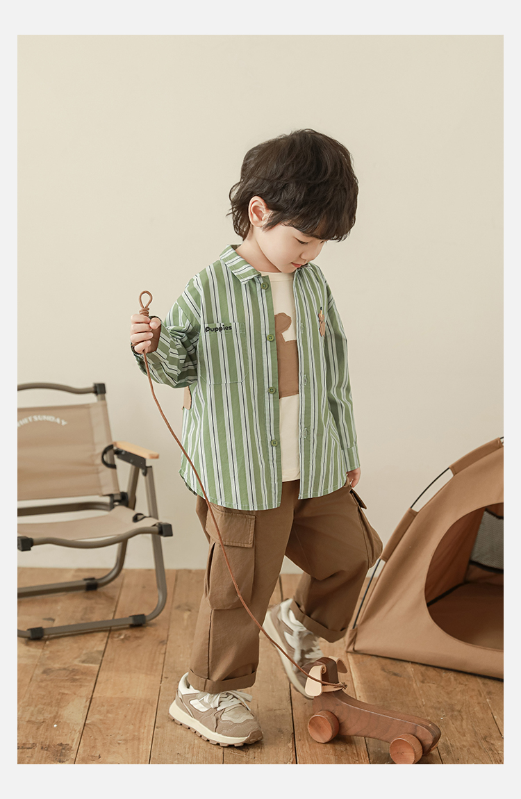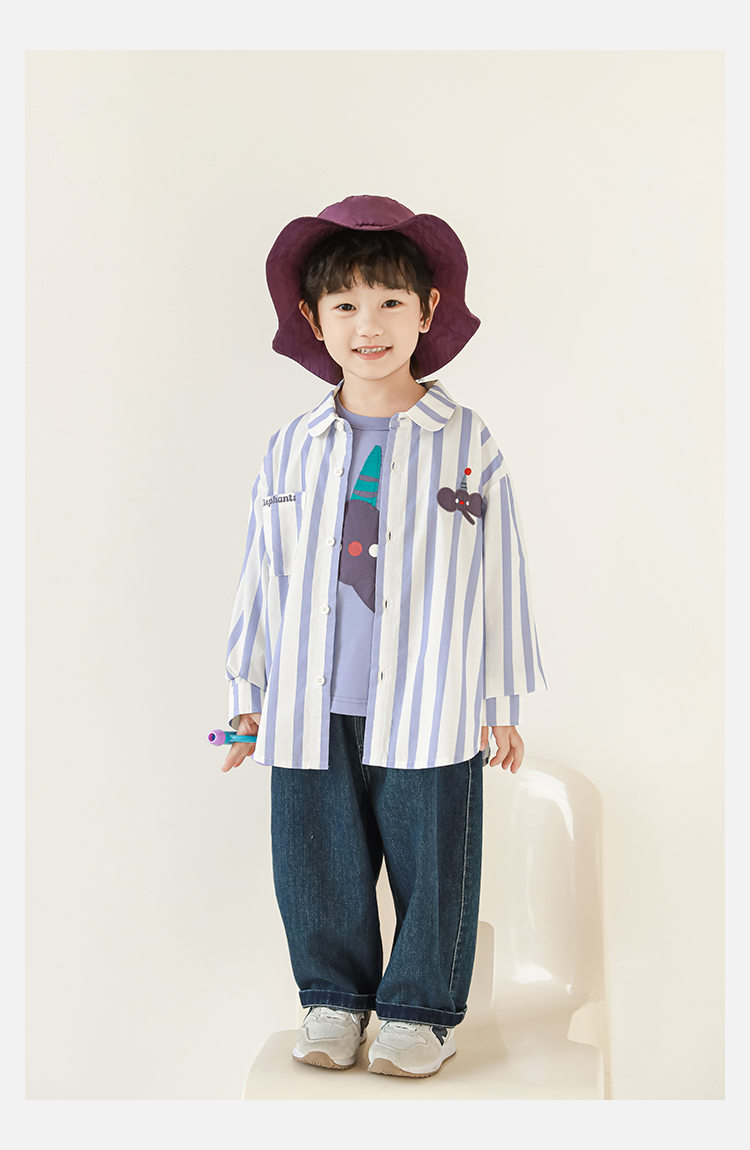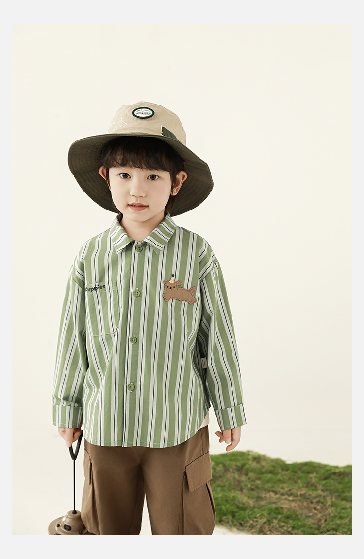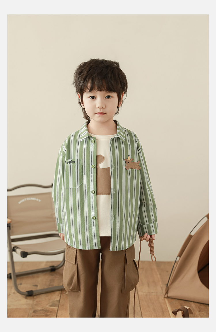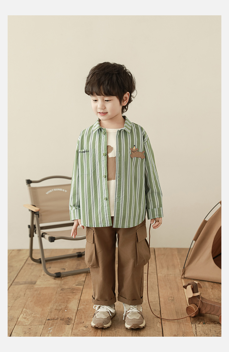 Wuri Boys의 2025 년 봄 새 긴 소매 옷깃 줄무늬 셔츠 캐주얼 느슨한 올매치 어린이 셔츠스토어 가기