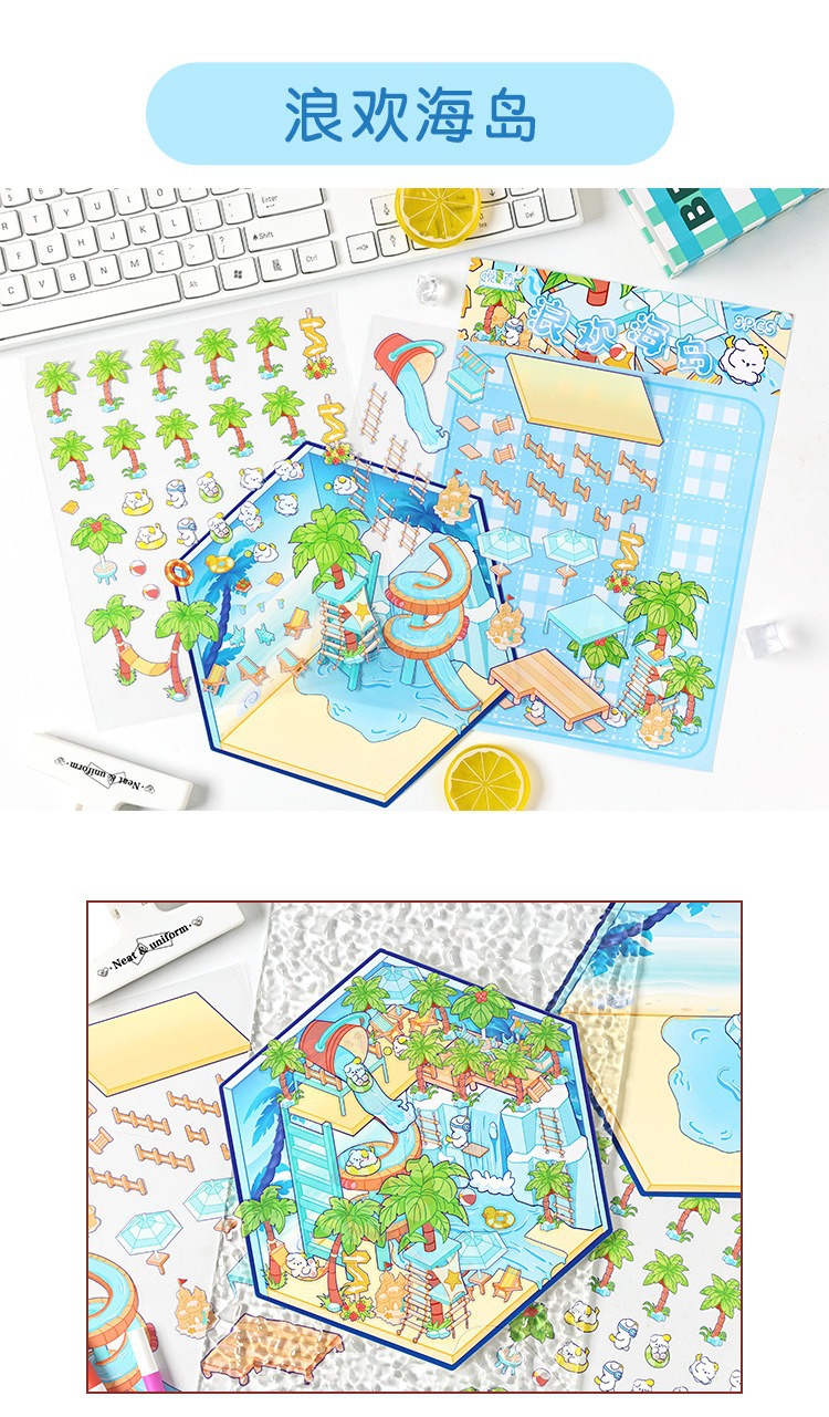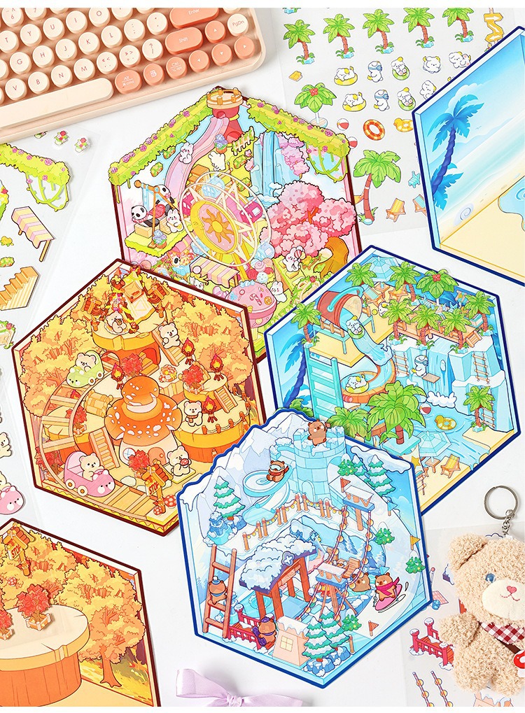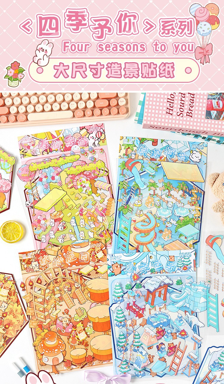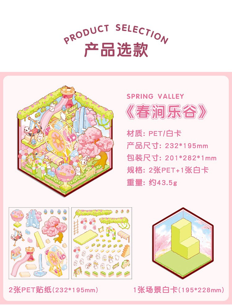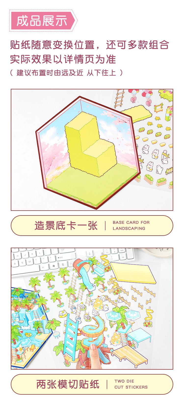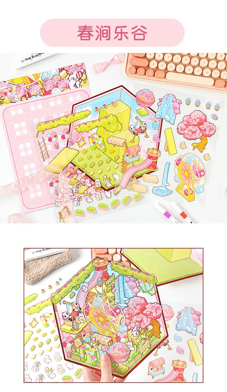 귀여운 봄 계곡 입체 조경 스티커 3D 시각 미니어처 장면 무컷팅 핸드북 스티커 해외 도매스토어 가기