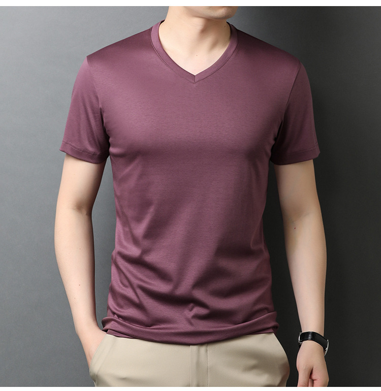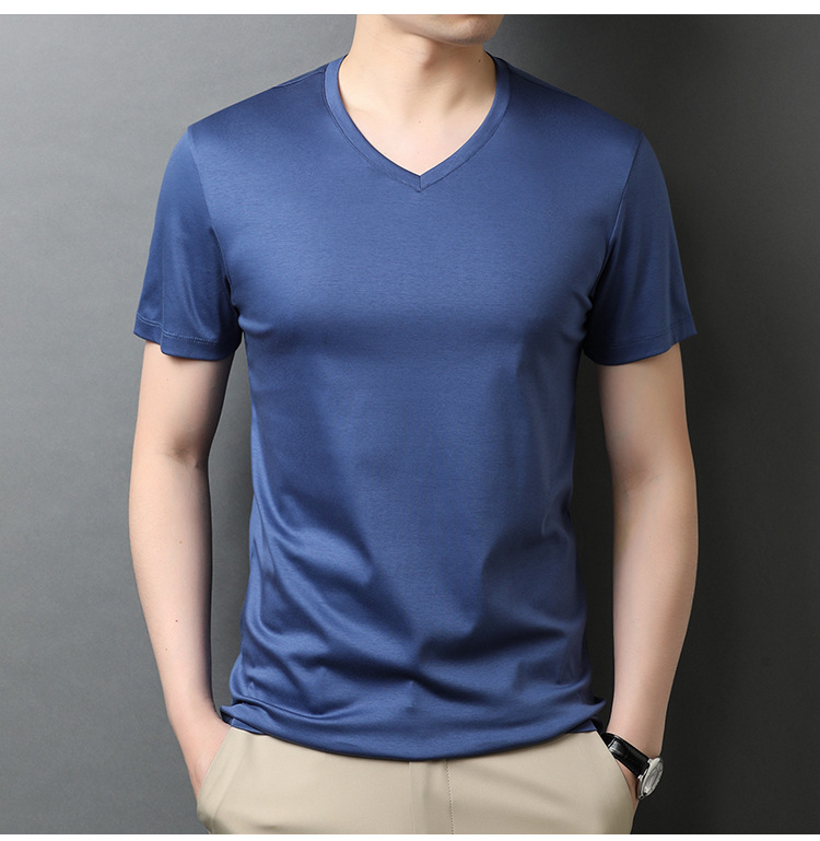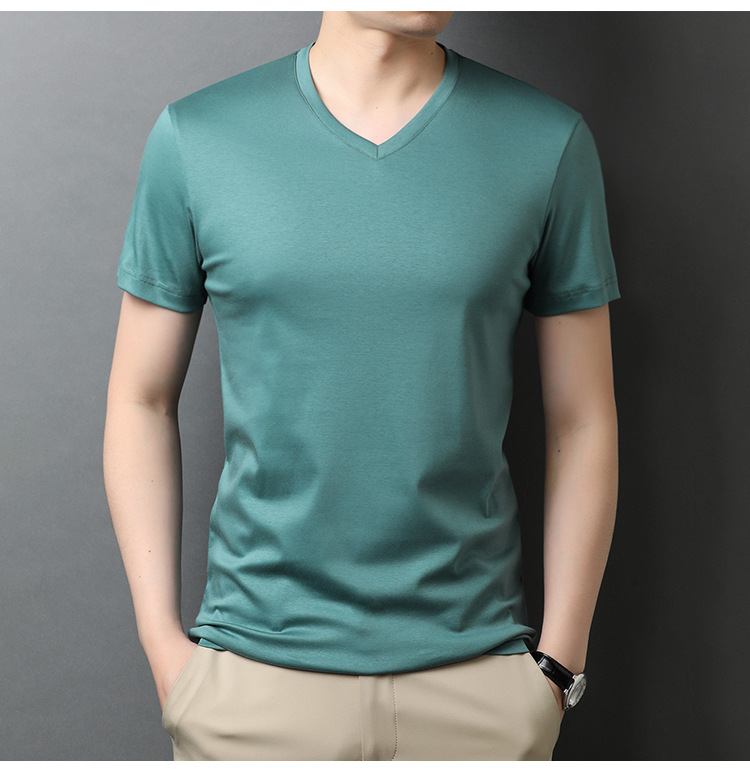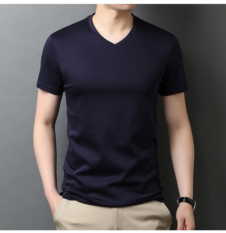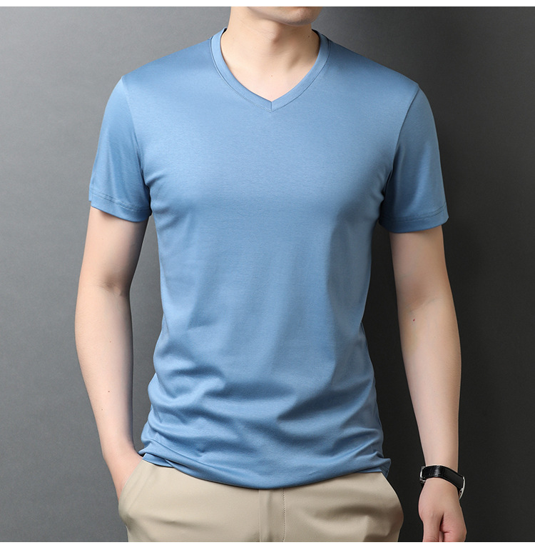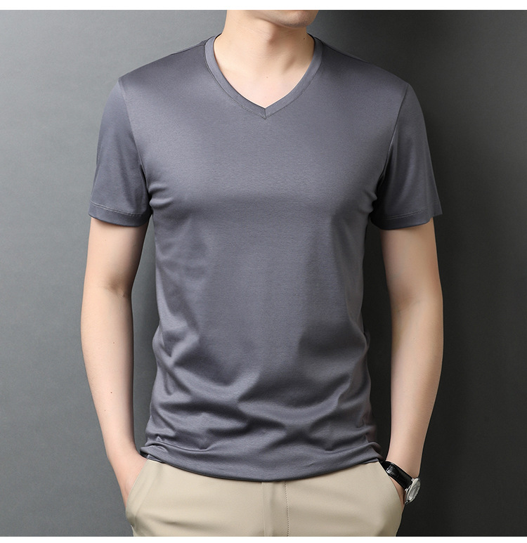 더블 머서라이즈면 남성용 티셔츠 여름 새로운 레저 V 넥 단색 액체 암모니아 짧은 소매 남성용 코튼 얇은 반소매 셔츠