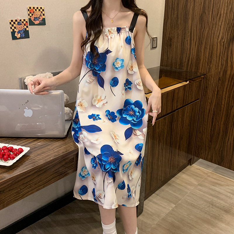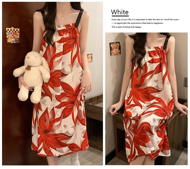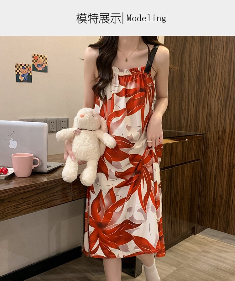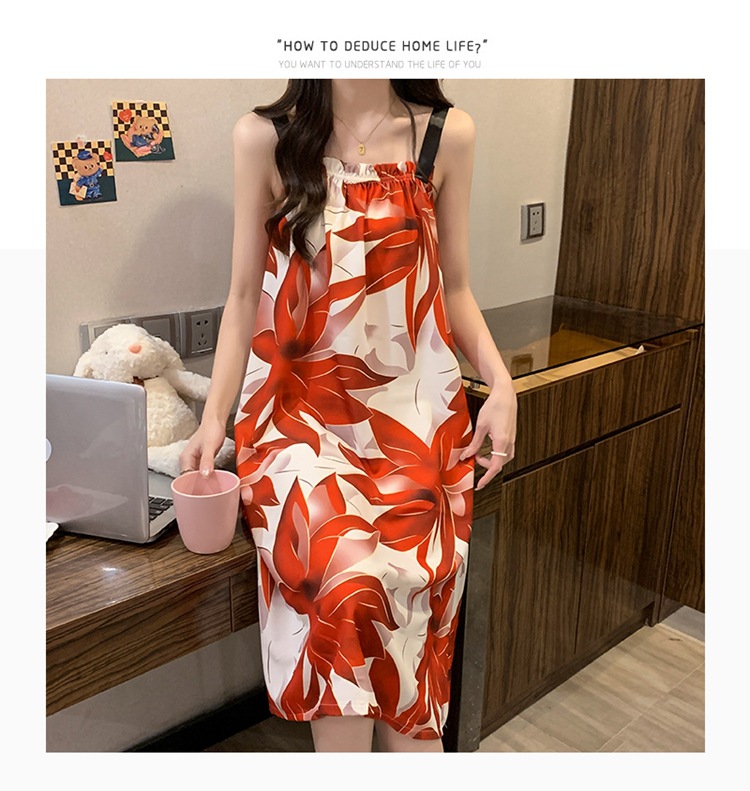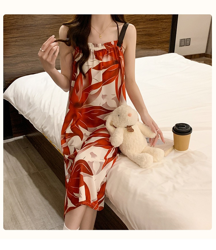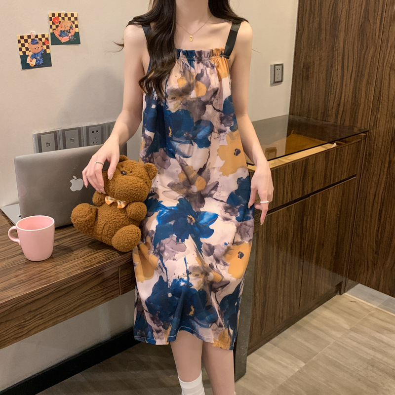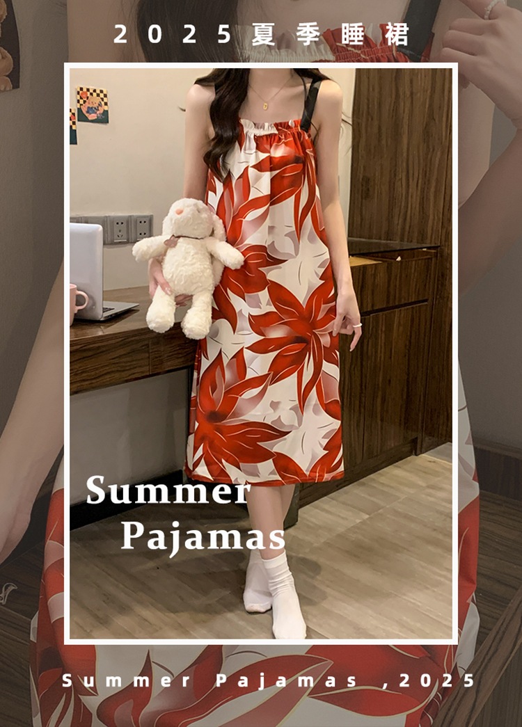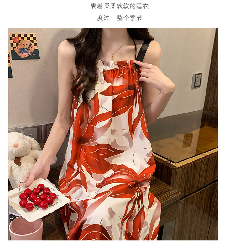 2025 새로운 스타일 잠옷 여성 여름 슈퍼 소프트 아이스 실크 꽃 슬링 엑스트라 느슨한 중간 길이의 잠옷 홈 옷스토어 가기