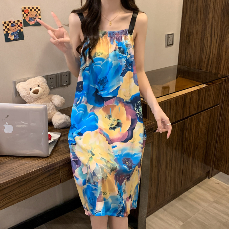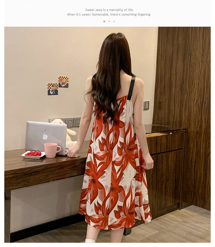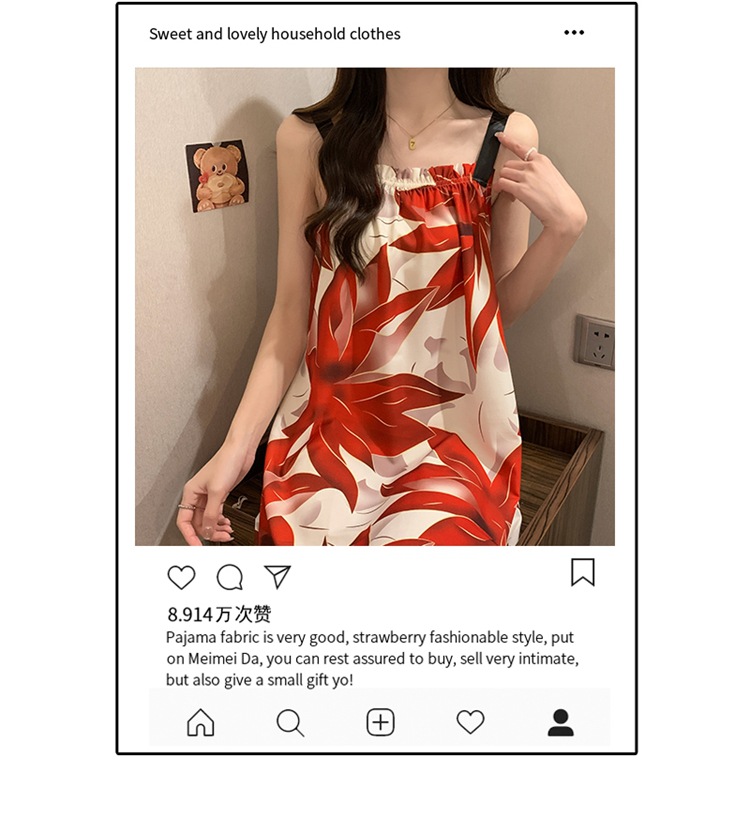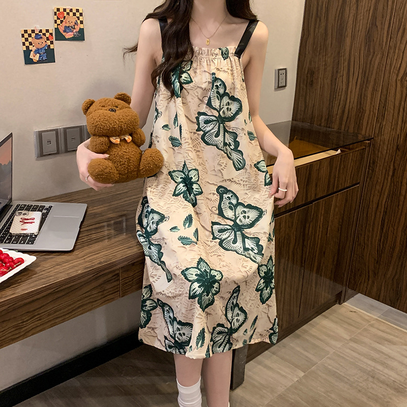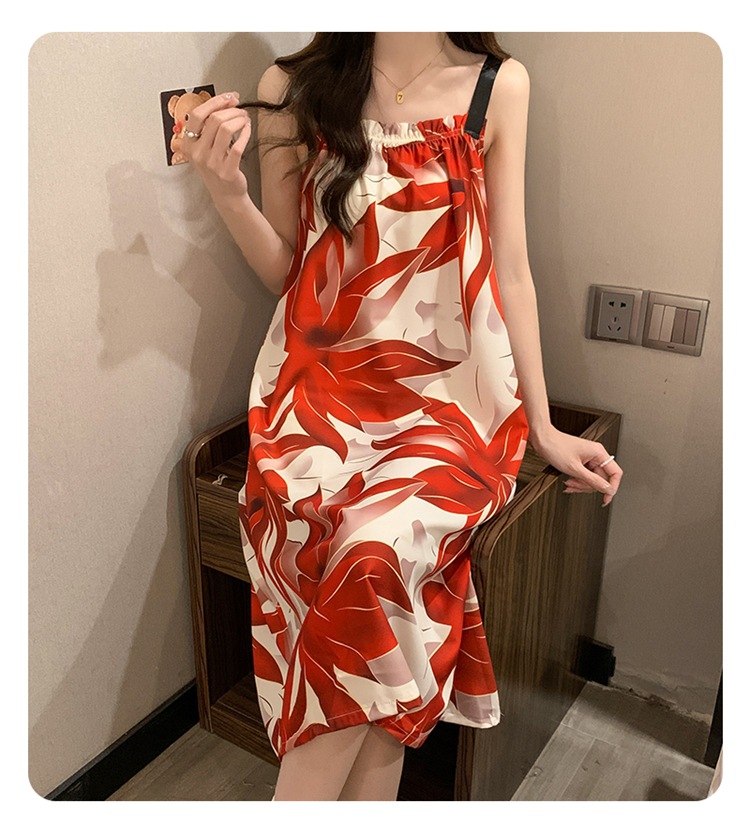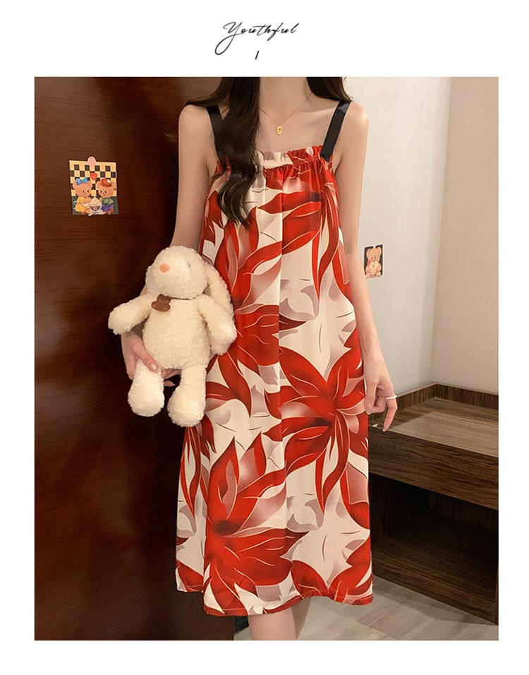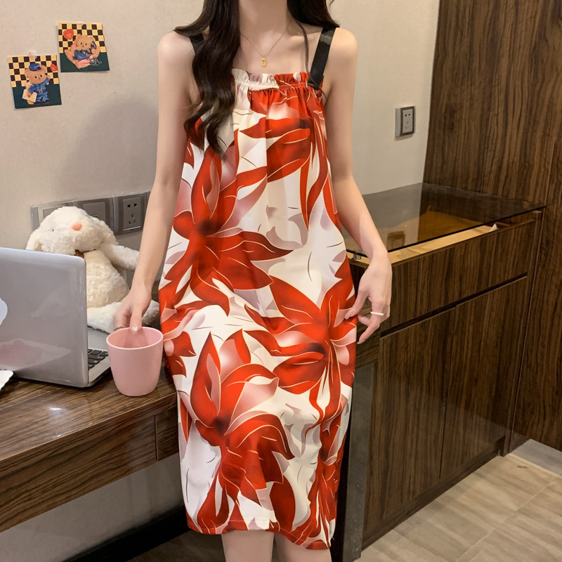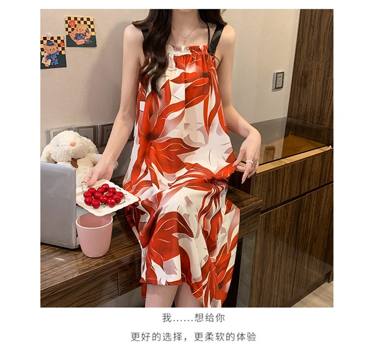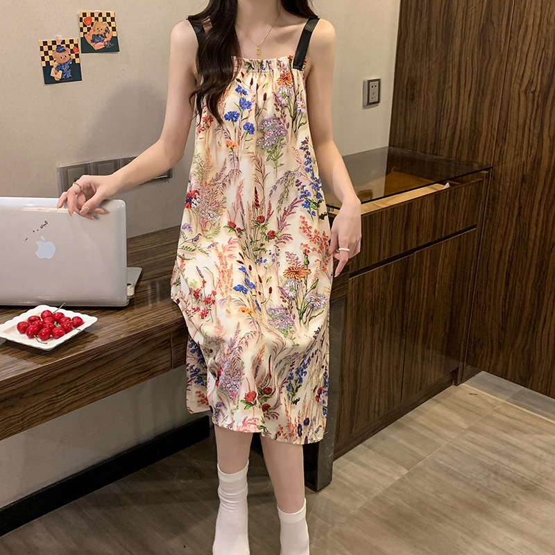 2025 새로운 스타일 잠옷 여성 여름 슈퍼 소프트 아이스 실크 꽃 슬링 엑스트라 느슨한 중간 길이의 잠옷 홈 옷스토어 가기