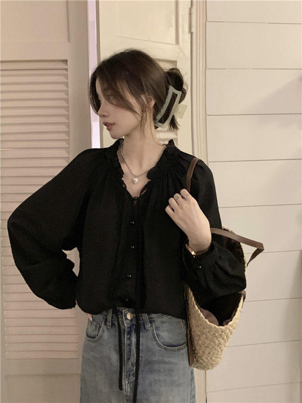 레이스 업 긴 소매 쉬폰 셔츠 여성용 얇은 봄 랜턴 소매 셔츠 디자인 센스 틈새 슬림 프렌치 탑스토어 가기