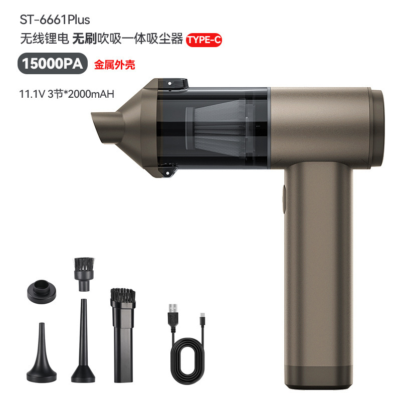 • 건메탈 쉘/11.1V 브러시리스 휴대용 진공 청소기/2단 조절 16000pa/3*2000Mah 송풍 및 흡입 일체형 기계