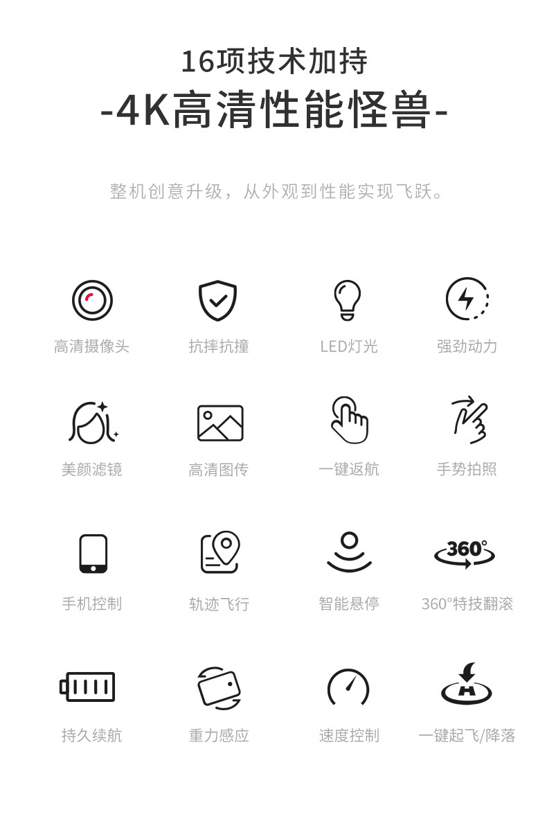 六通带陀螺仪,一键起飞降落,上升下降,前进后退,左右侧飞,转向,无头模式,悬停,高清摄像头,手势拍照,录像,急停,轨迹飞行,重力感应,50倍变焦。